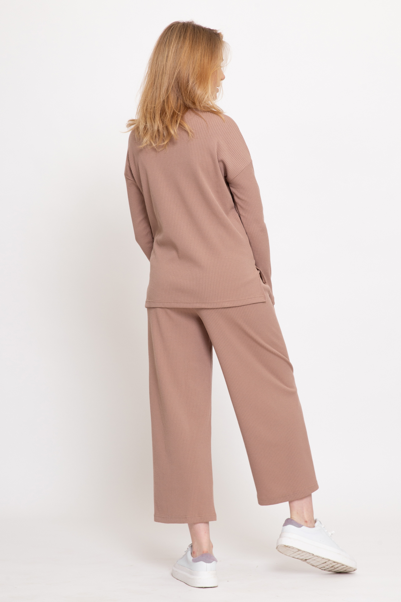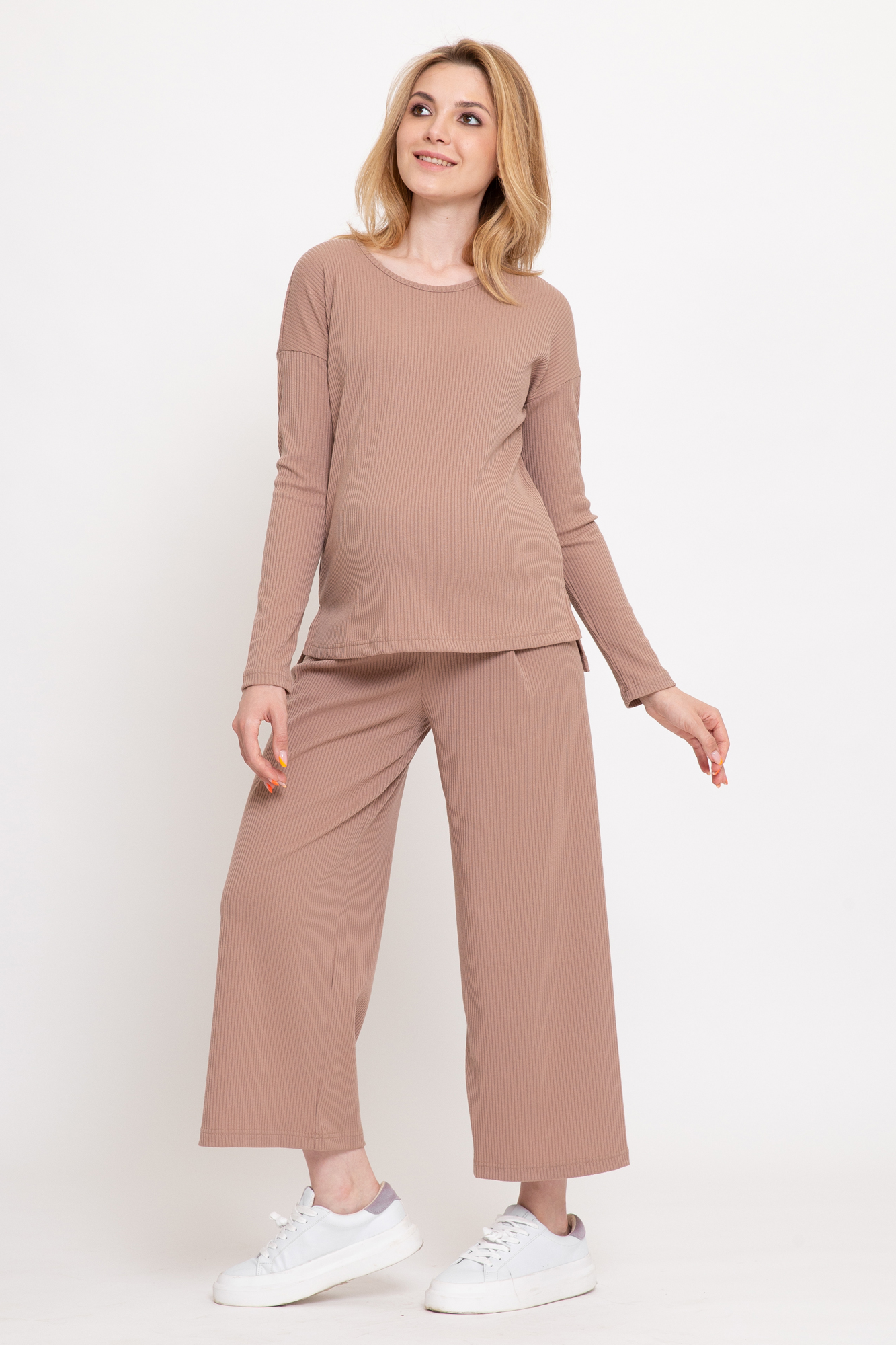 Оригинальный костюм в рубчик для беременных. Костюм состоит из джемпера и брюк. Джемпер с округлым вырезом горловины, длинным рукавом, заниженной линией плеча, разрезами по бокам изделия. Брюки-кюлоты с эластичной высокой вставкой-бандажом рассчитаны на весь период беременности. Идеальное сочетание стиля и комфорта!