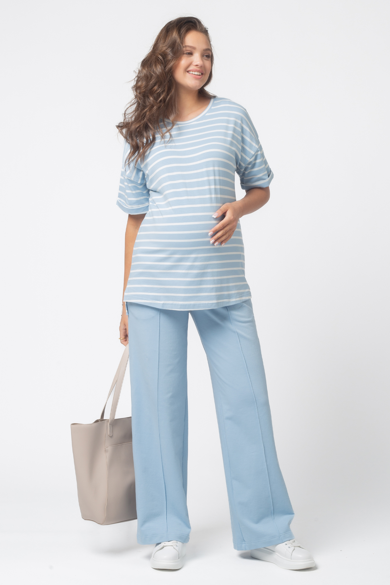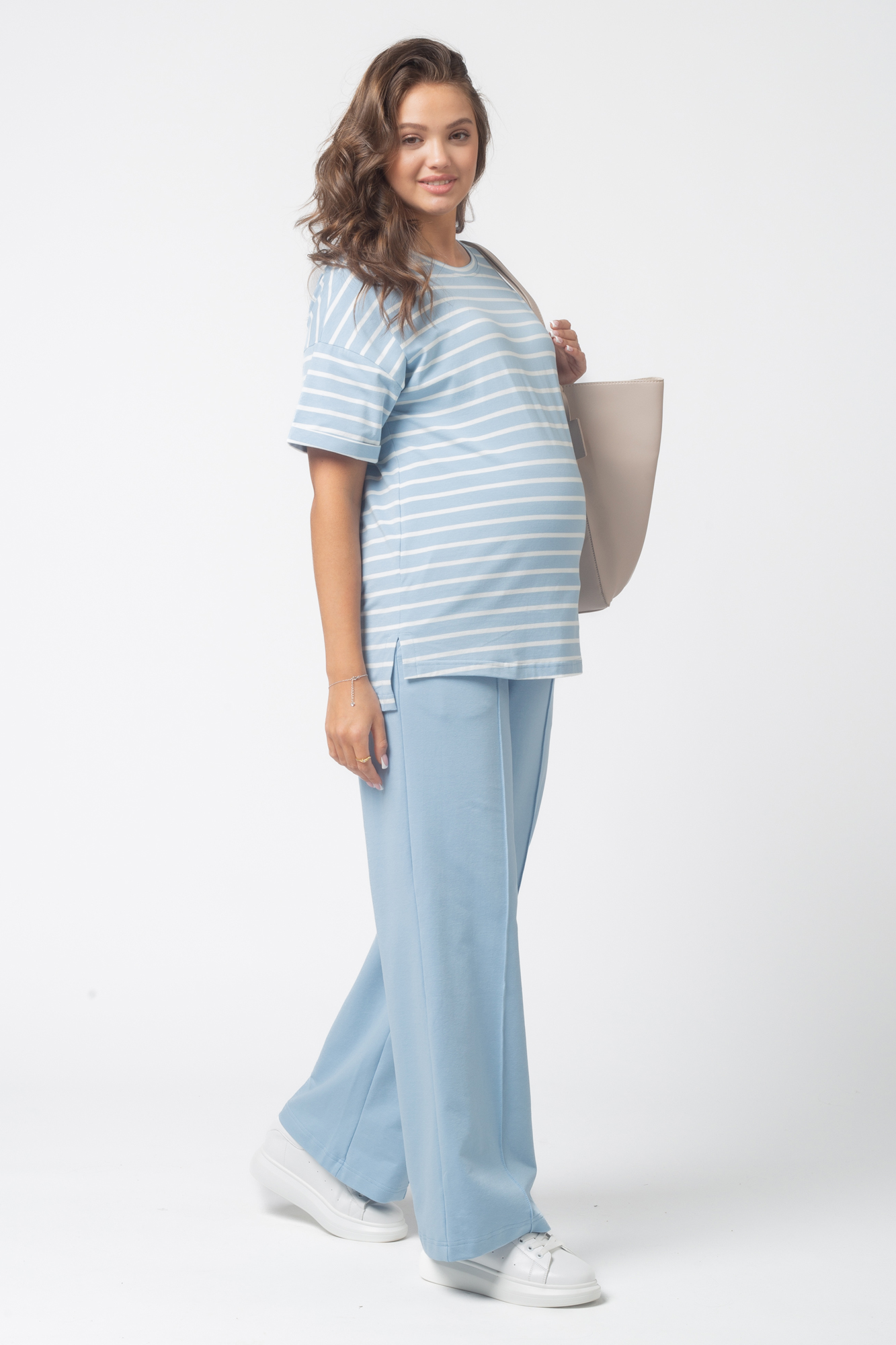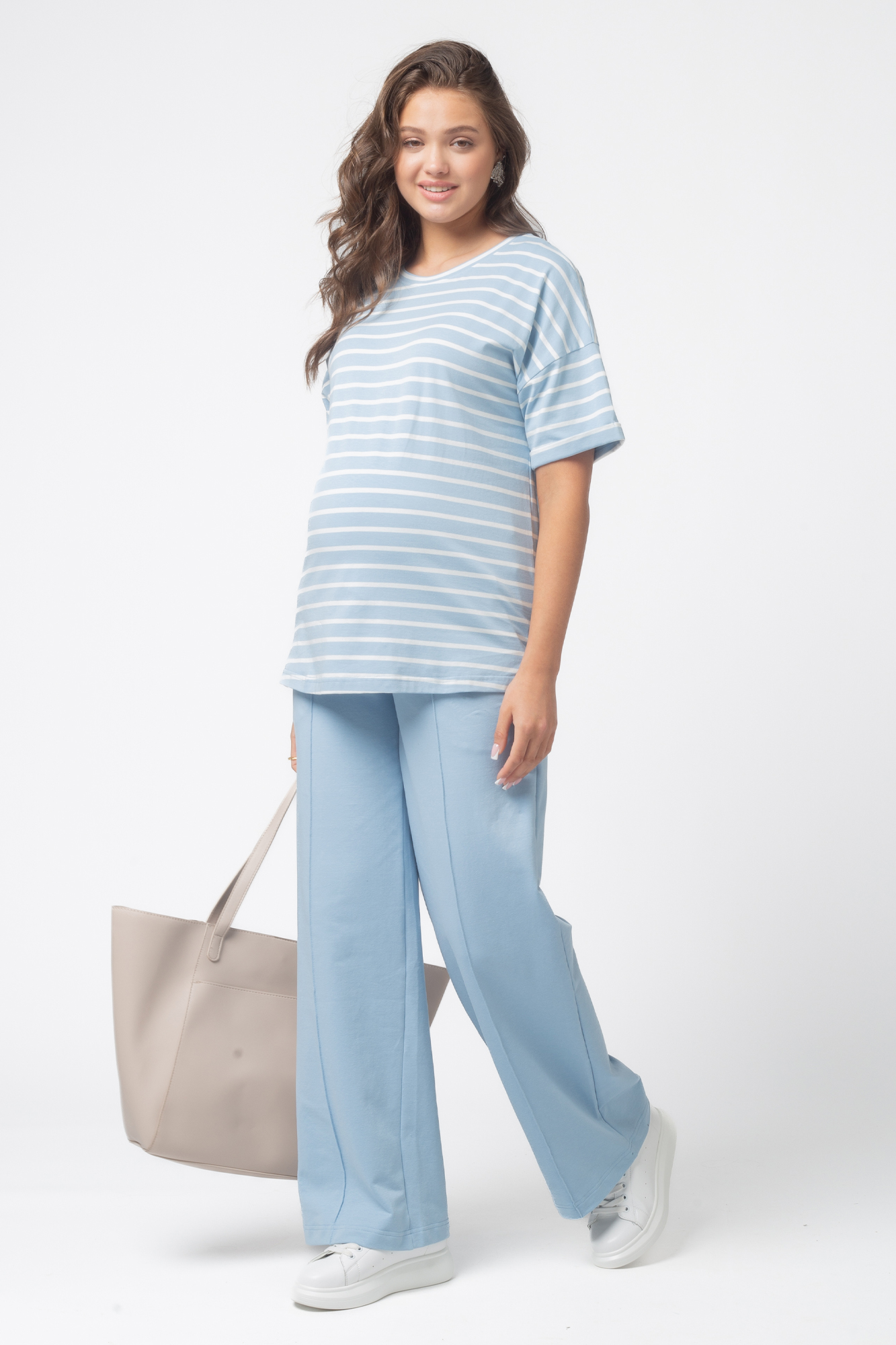 Легкий женский костюм для будущих мам подойдет для прогулок, выписки из роддома, занятий спортом, путешествий и домашней носки. Летний женский костюм для беременных изготовлен из турецкого двухниточного футера премиум-класса. Комплект состоит из двух вещей: футболки и брюк. Кофта с коротким рукавом и круглым вырезом имеет среднюю длину и в меру свободный крой. Брюки прямые, широкие, с отстроченными стрелками и боковыми карманами. В пояс вшита потайная регулировка объема на пуговице, поэтому костюм подходит для ношения на любом месяце беременности и после родов. Модель из легкого хлопкового трикотажа дополнит повседневный женский гардероб. Данная модель подходит для любого типа фигур.