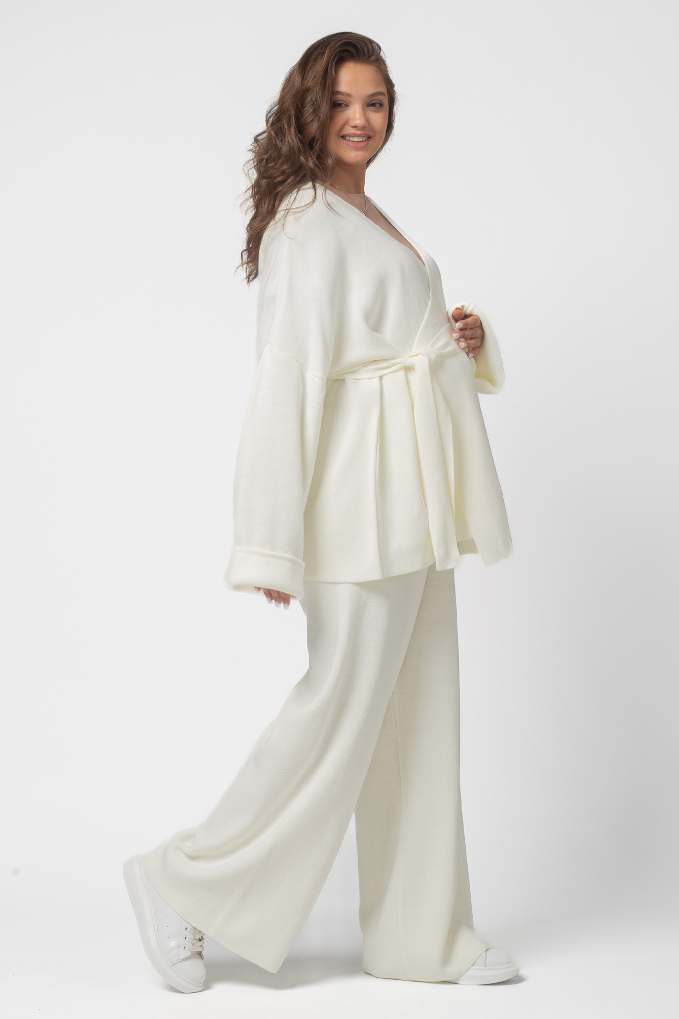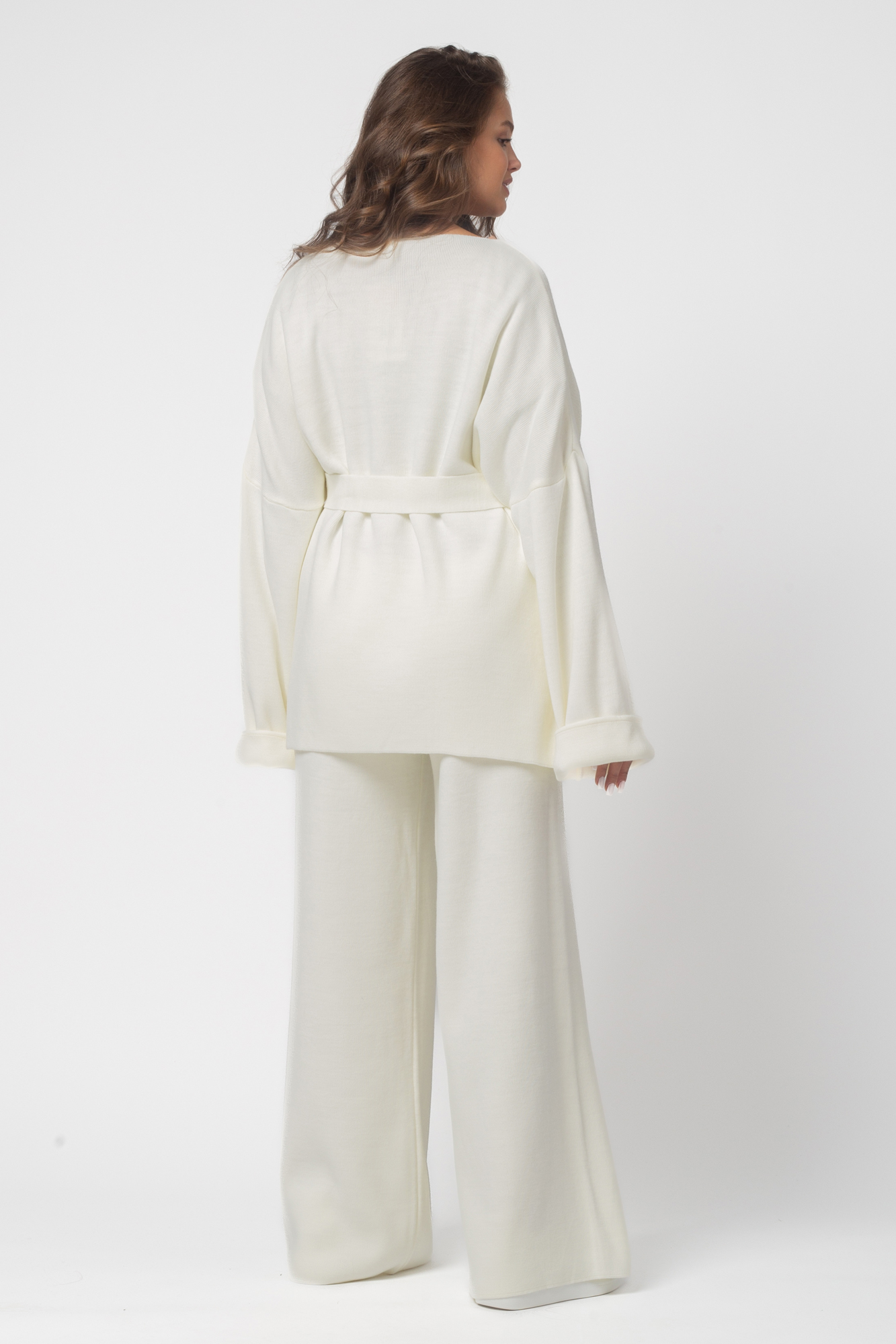 Теплый вязаный костюм для беременных. Модель выполнена из мягкого полотна мелкой вязки с добавлением акрила и шерсти. Костюм состоит из двух вещей. Кофта кимоно c поясом прекрасно садится на фигуру будущей мамы. Широкие штаны палаццо оснащены эластичной мягкой резинкой, которая не давит на животик. Данная модель идеально садится на животик с первых месяцев и до последнего. За счет удобной резинки костюм можно будет носить и после рождения малыша. Такой костюм можно носить в офис, на прогулку, на мероприятия. Свободный крой оверсайз обеспечивает комфорт и удобство на протяжении всего срока беременности. Идеальная модель на весну или прохладное лето.