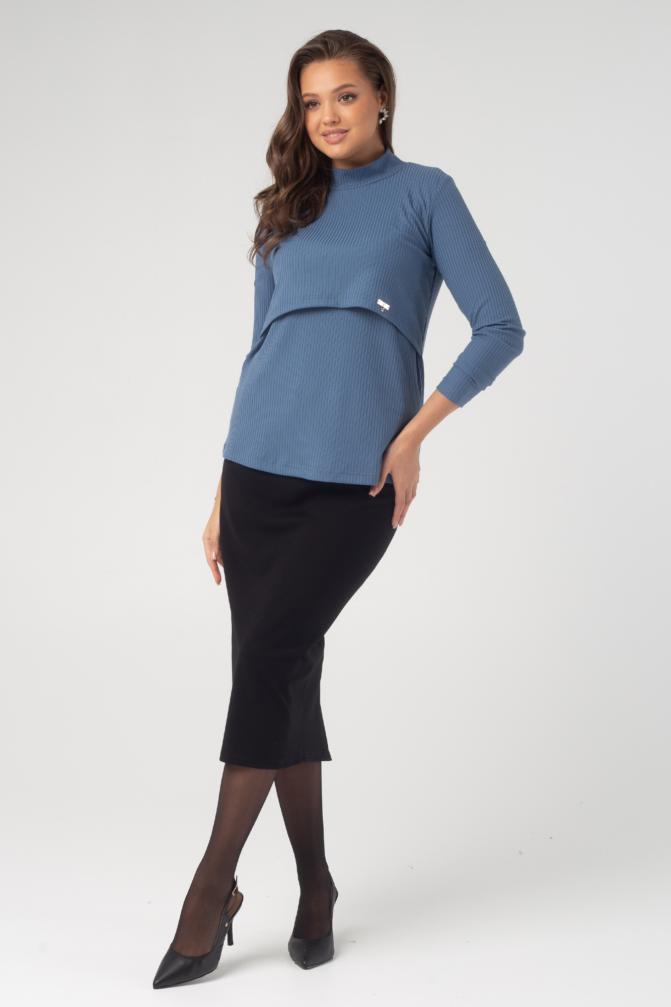 Лонгслив для беременных трикотажный выполнен из высококачественного трикотажа лапша в рубчик на основе вискозы. Удобная повседневная модель подойдет для будущих мам на любом месяце беременности. Крой лонгслива - классический. Средняя длина, облегающий силуэт, длинный рукав, воротник стойка. Модель оснащена секретом для кормления и поэтому станет практичным приобретением для кормящих мам. Базовая кофта легко сочетается с другими вещами вашего гардероба и подходит для офиса. Женская водолазка идеально подойдет для осеннего сезона.