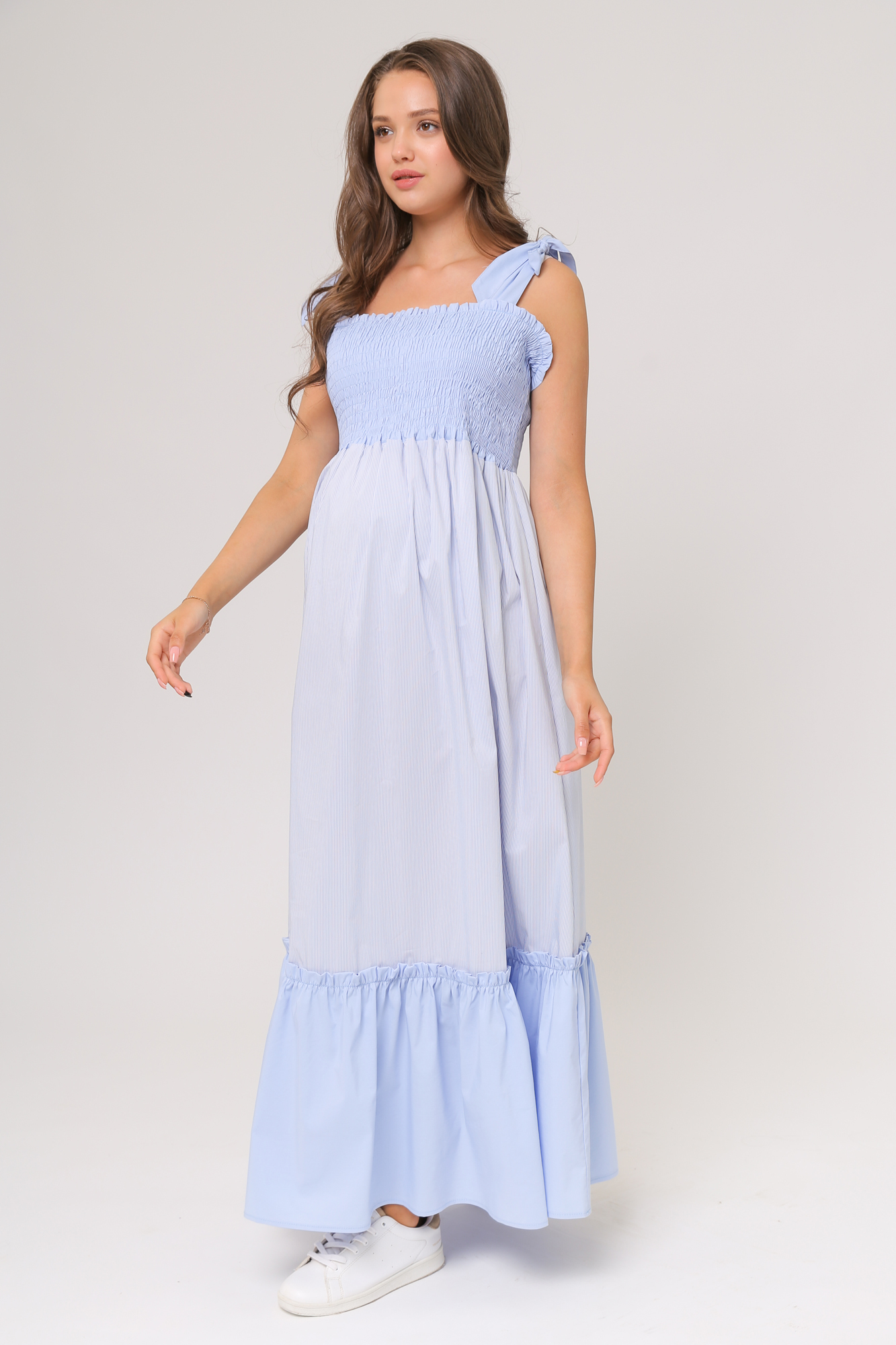 Роскошный летний сарафан для беременных из дышащего поплина (голубой, зеленый) и муслина (белый). Фасон платья женственный и изящный: длина макси, А-силуэт с воланом по низу, эластичная сборка на груди. Длина платья может регулироваться с спомощью завязок на бретелях. Крой платья свободный, рассчитан на весь срок беременности и послеродовой период. Легкое летнее платье дополняется яркими аксессуарами, одинаково гармонично смотрится с кедами и босоножками, сандалиями и балетками. КОднотонная расцветка расцветка и классическая голубая полоска делают сарафан идеальным вариантом для повседневного образа, наряда на праздник или на выписку.