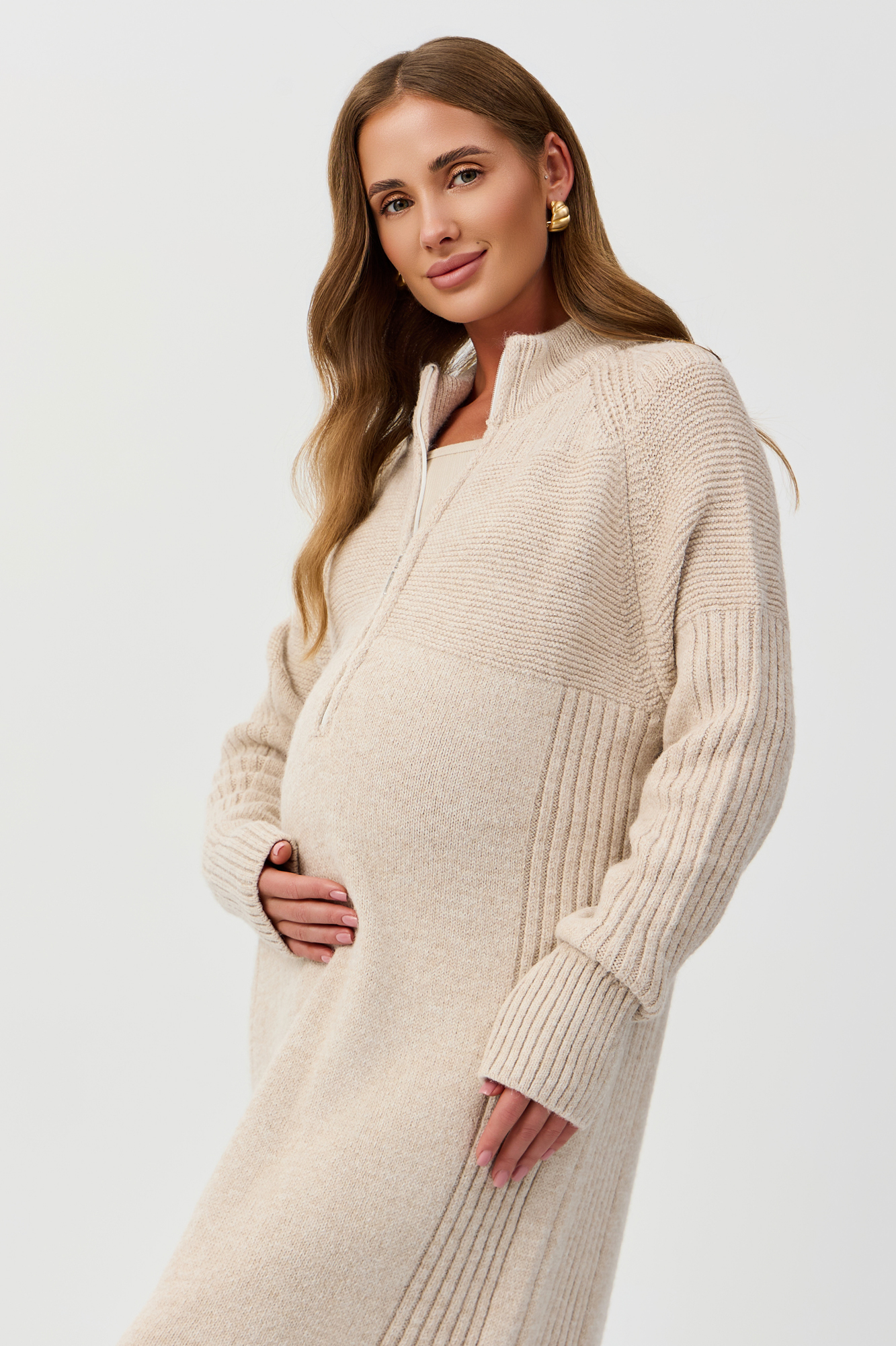 Платье для беременных вязаное теплое с добавлением шерсти. Теплое зимнее платье выполнено из вискозы плотной вязки с добавлением шерстяных нитей (20% шерсти). Свободная оверсайз модель практична и станет любимой вещью в гардеробе будущей мамы. Вязаное платье с контрастными полосами вязки создаст стильный и элегантный образ беременной женщины. Праздничное платье слегка облегает животик, образ получается нежный и женственный. Высокий воротник с длинной молнией защитит от холода и ветра, согреет осенью и зимой. Удобная молния обеспечит комфортное кормление малыша, вы сможете без труда использовать это платье не только в беременность, но и в период грудного вскармливания. Данная модель подойдет так же и девушкам plus size. Женщины с большим размером одежды могут с легкостью создавать нарядные образы с этим платьем. Теплая и мягкая вискоза с шерстью, незаменимый атрибут зимы. Длина платья миди позволяет носить его даже в самый холод.