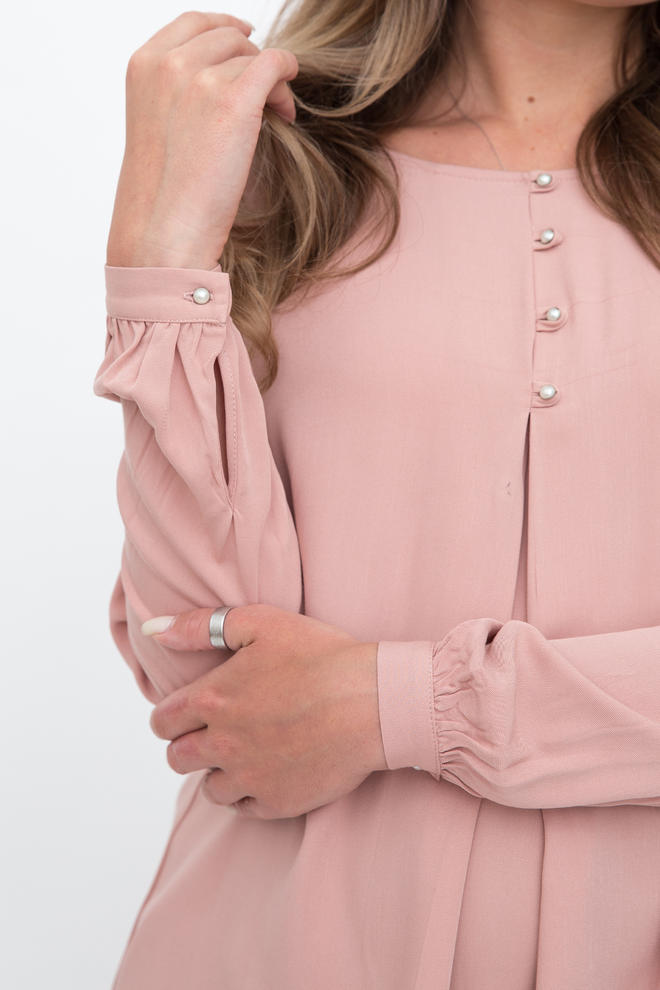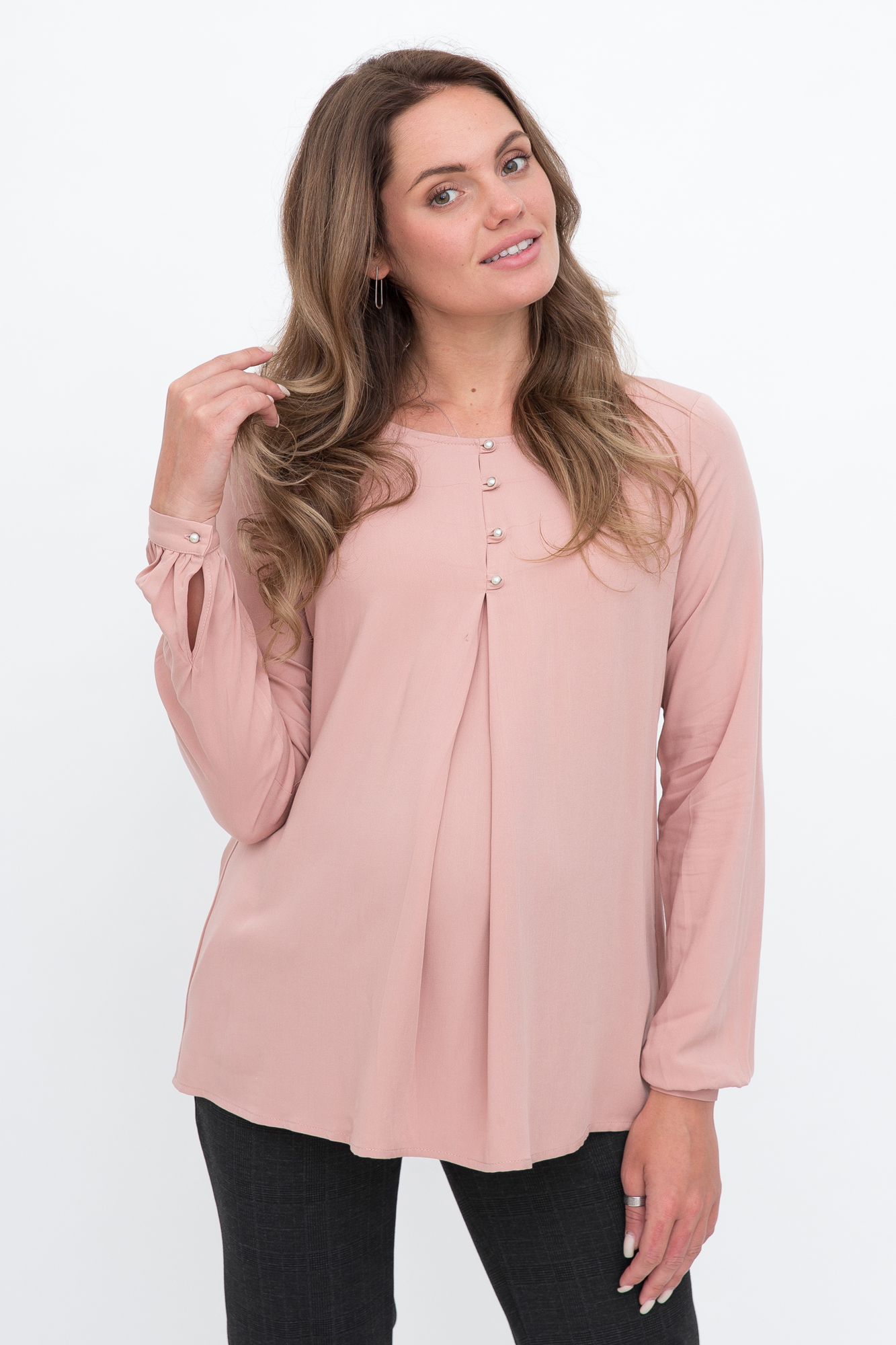 Элегантная блузка из высококачественной шелковистой вискозы для будущих мам. Натуральный материал подарит приятные тактильные ощущения и обеспечит комфорт будущей маме и малышу. Свободный крой позволяет носить изделие на всем протяжении беременности, а после родов скроет временные несовершенства фигуры. Детали: округлый вырез горловины, нежные пуговицы в виде жемчужин, встречная складка на живот и на спинке. Блузка подойдет для работы в офисе и просто на каждый день, а если добавить к ней соответствующие аксессуары - может стать и частью вечернего образа.