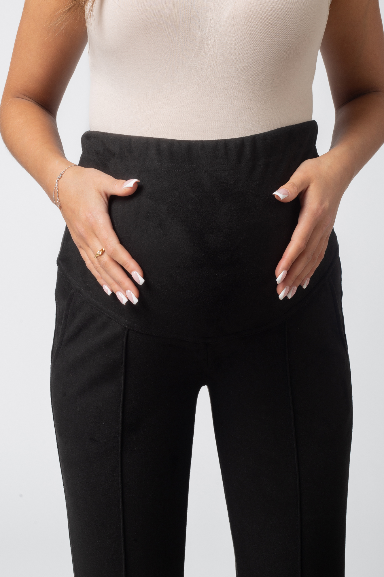 Зауженные брюки для беременных - стильная модель для повседневного гардероба будущей мамы. Сшиты из премиальной искусственной замши. Женские брюки с высокой посадкой оснащены поясом, выполняющим функцию бандажа. Пояс можно регулировать по мере роста животика с помощью скрытой резинки на пуговице. Крой брюк зауженный, спереди - эффектные отстроченные стрелки. Штаны подойдут беременным женщинам на любом сроке - для ношения в офис и на каждый день. Они легко сочетаются с другими вещами женщины: футболками и рубашками, толстовками и жакетами. Модель предлагается в трех базовых однотонных расцветках.