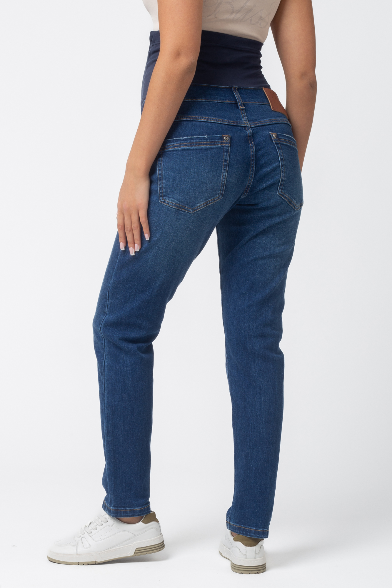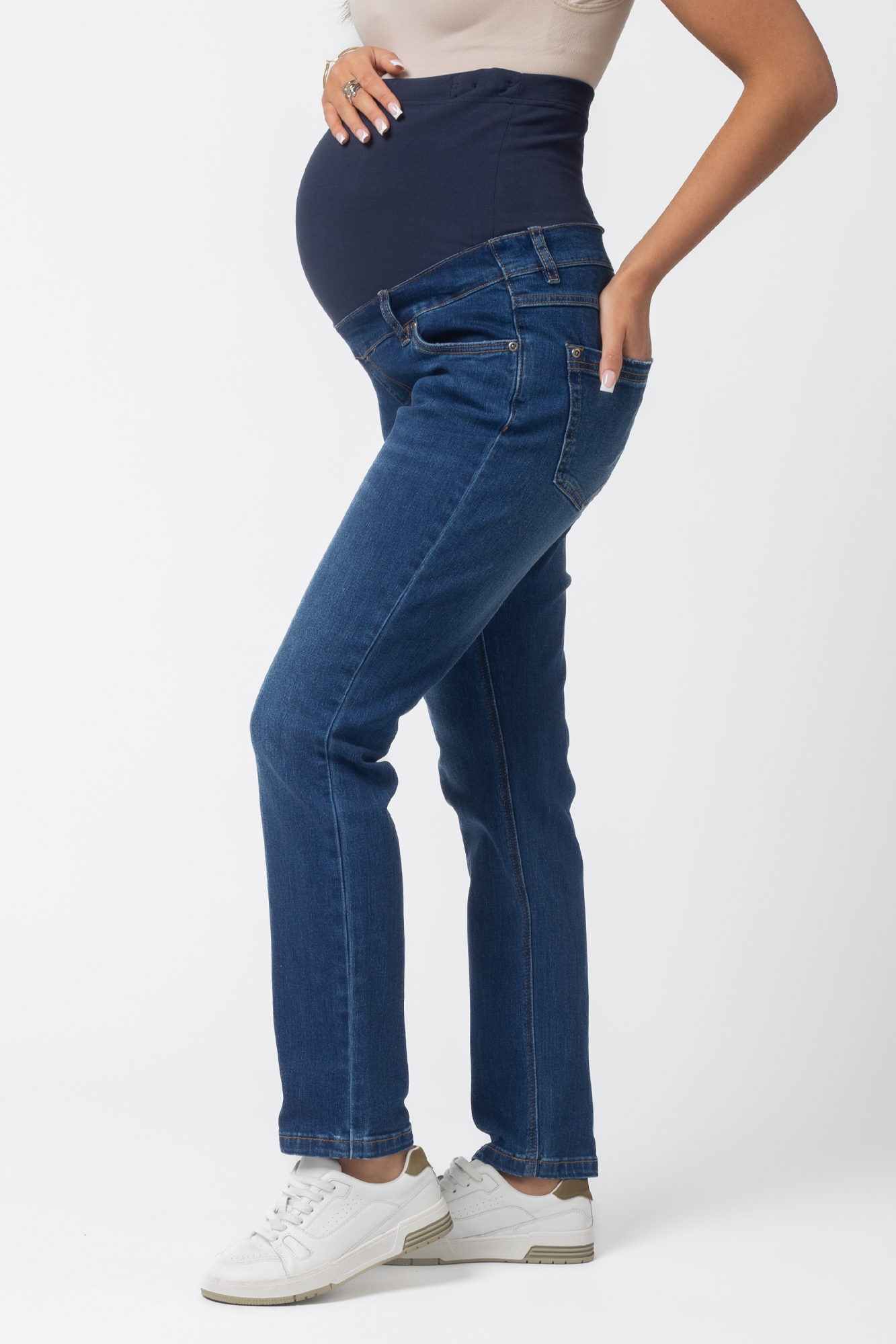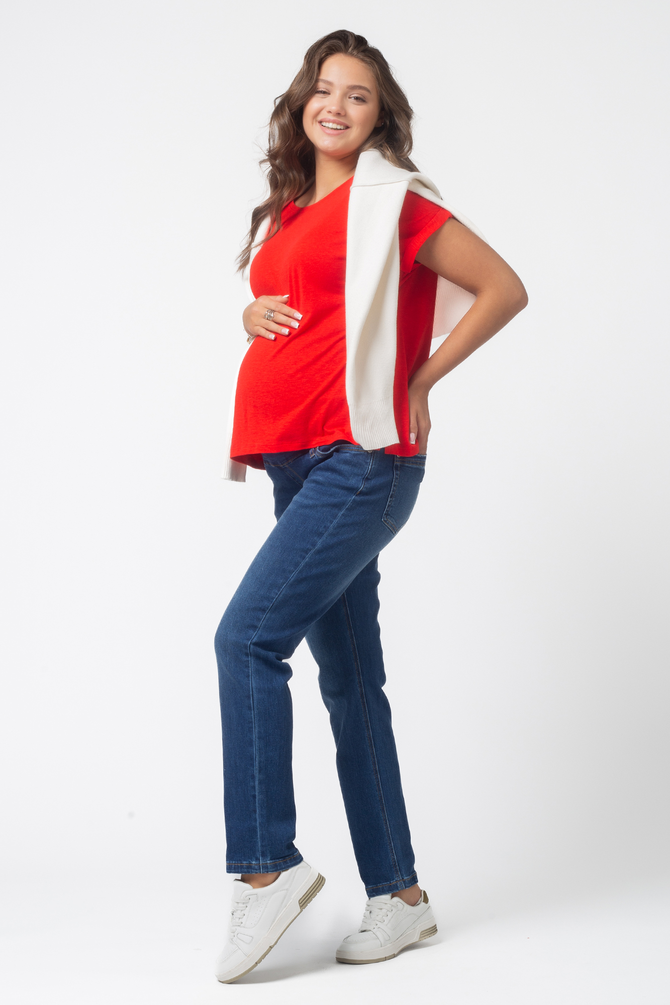 Стильные комфортные прямые джинсы для беременных выполнены из высококачественного премиум денима с добавлением эластана, не стесняющего движений. На модели высокая трикотажная вставка с эффектом бандажа мягко и деликатно поддерживает растущий животик. Объем регулируется за счет скрытой перфорированной резинки, продетой в верхнюю часть и, которая перестегивается на пуговицу. Детали модели: три кармана спереди, два накладных кармана сзади, шлевки для ремня. Идеальная посадка на любую фигуру. Специальный крой с учетом анатомических особенностей позволяет носить изделие от начала до конца беременности, а также после родов. Джинсы подойдут не только беременным, но и дамам крупных размеров, желающих приобрести модель, которая не сдавливает и скрывает несовершенства фигуры.