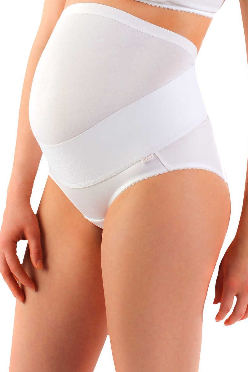 Эластичный белый бандаж для беременной Фэст выполнен в виде утягивающих трусиков с ластовицей, с завышенной талией из дышащей микрофибры. Пояс декорирован тонкой, кружевной лентой. Данный бандаж рекомендован для ношения с 5 месяца беременности. Он мягко фиксирует живот беременной женщины, без передавливания; помогает сохранить хорошую осанку, держать мышцы в нужном тонусе. Область под животиком имеет уплотнение ткани для максимально правильной и удобной поддержки плода. Застёжка снизу позволяет не снимать бандаж при необходимости.Состав: эластан – 40%, полиамид – 31%, хлопок – 29%