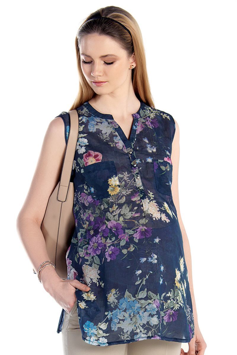Рубашка для беременых выполнена из хлопковой ткани. Модель прямого кроя. Детали: V- вырез,два накладных кармана на груди, цветочный принт, спереди застёжка на пуговицах.