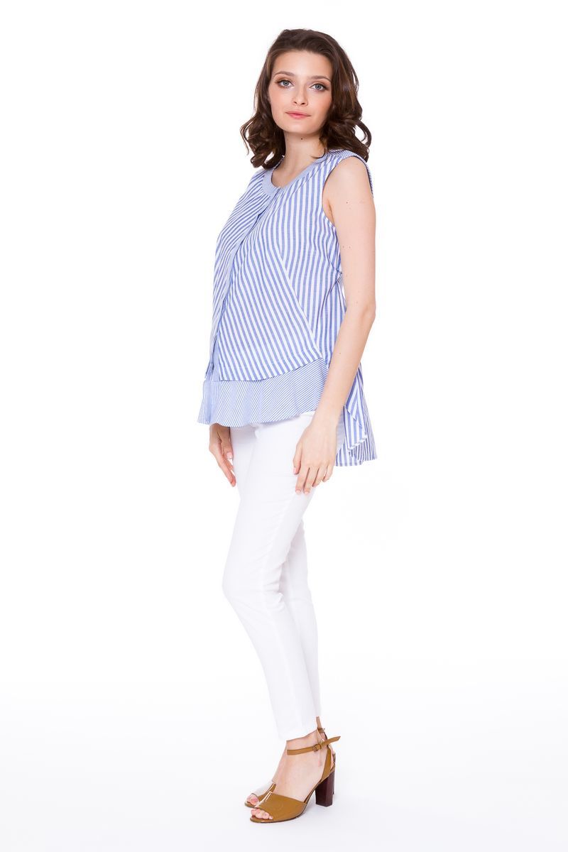 Стильная блуза приталенного кроя в полоску на пуговицах. Сшита из приятной на ощупь хлопка. Модель очень удобна для ношения в период беременности. Специального секрета кормления нет, но можно удобно и незаметно покормить малыша грудью, расстегнув пуговицы сверху до необходимой глубины. Эту блузу вы будете с удовольствием носить и после окончания периода беременности и грудного вскармливания.