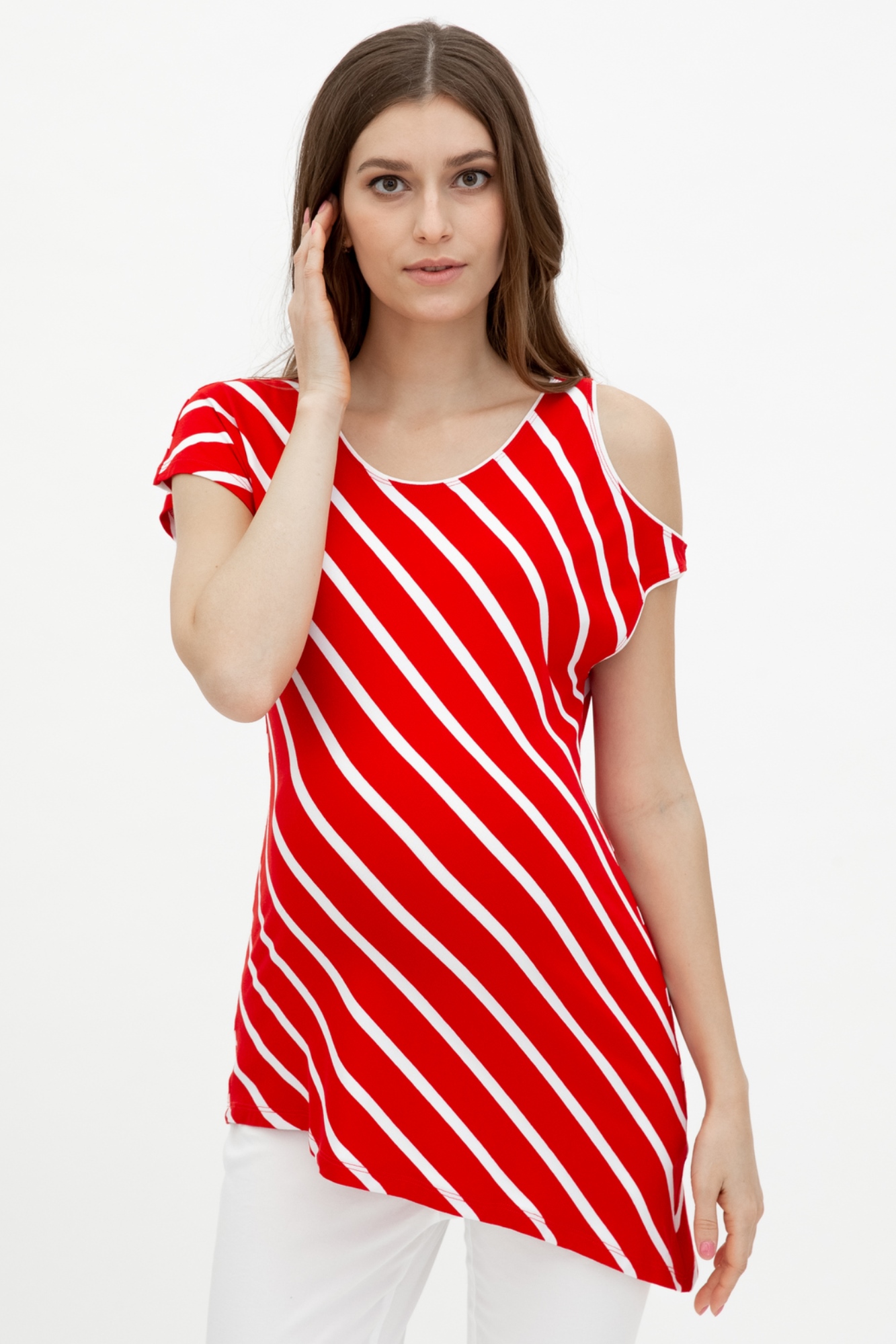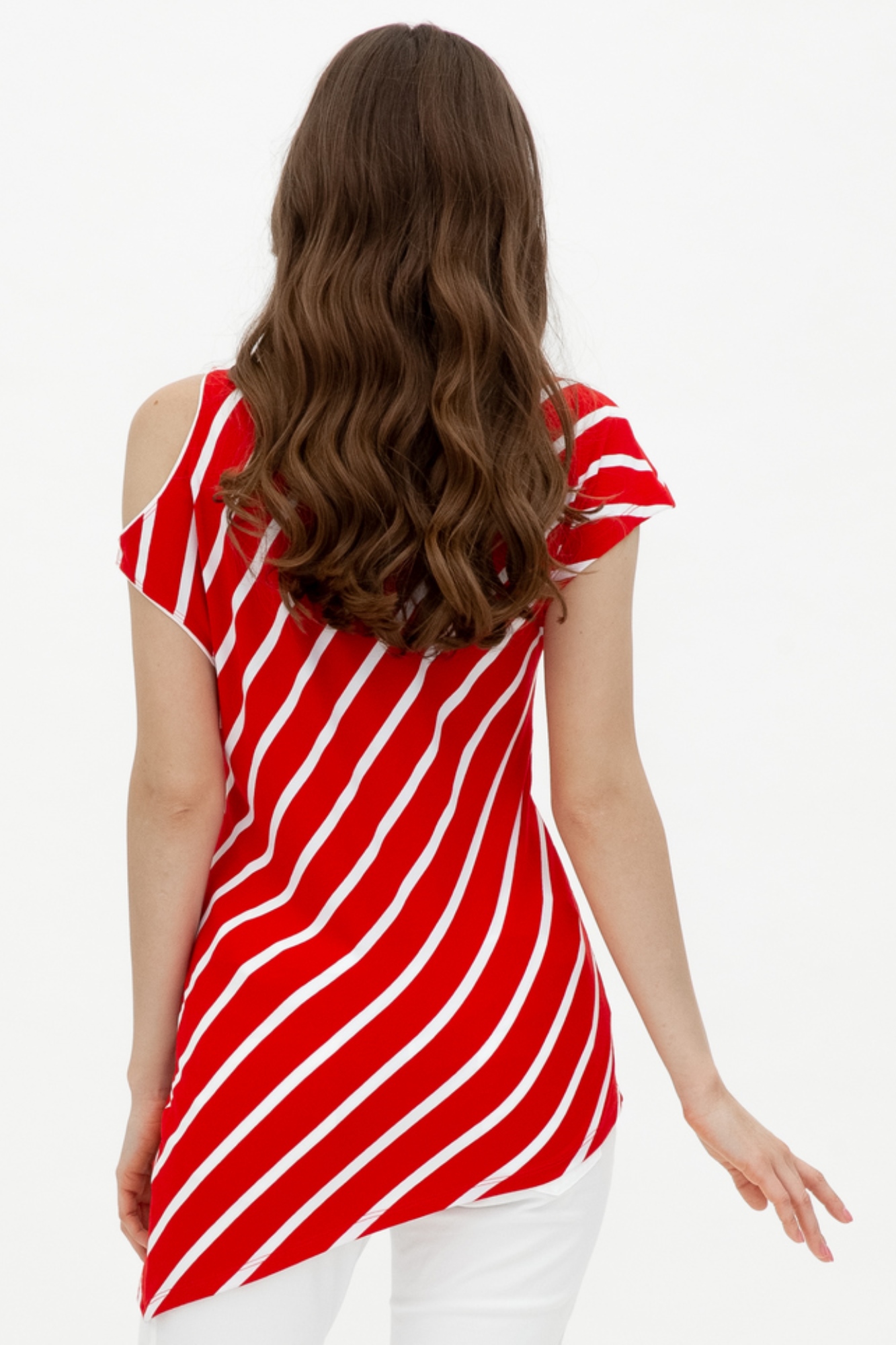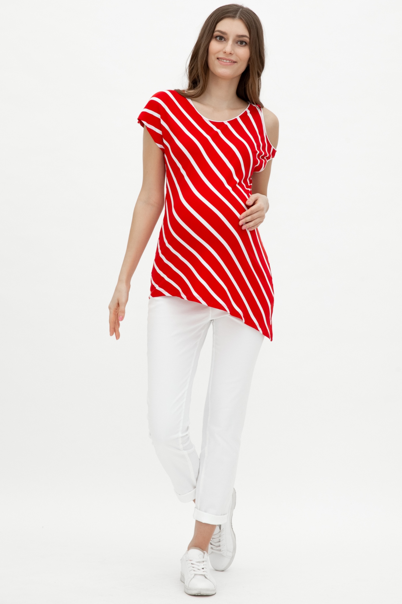 Оригинальная ассиметричная блуза с открытым плечом в диагональную полоску . Свободный фасон очень удобен для ношения в период беременности: не стесняет движений, создает дополнительное пространство для растущего животика. Эту блузу вы будете с удовольствием носить и после окончания периода беременности и грудного вскармливания. Состав:95% Тенсель,5% эластан.