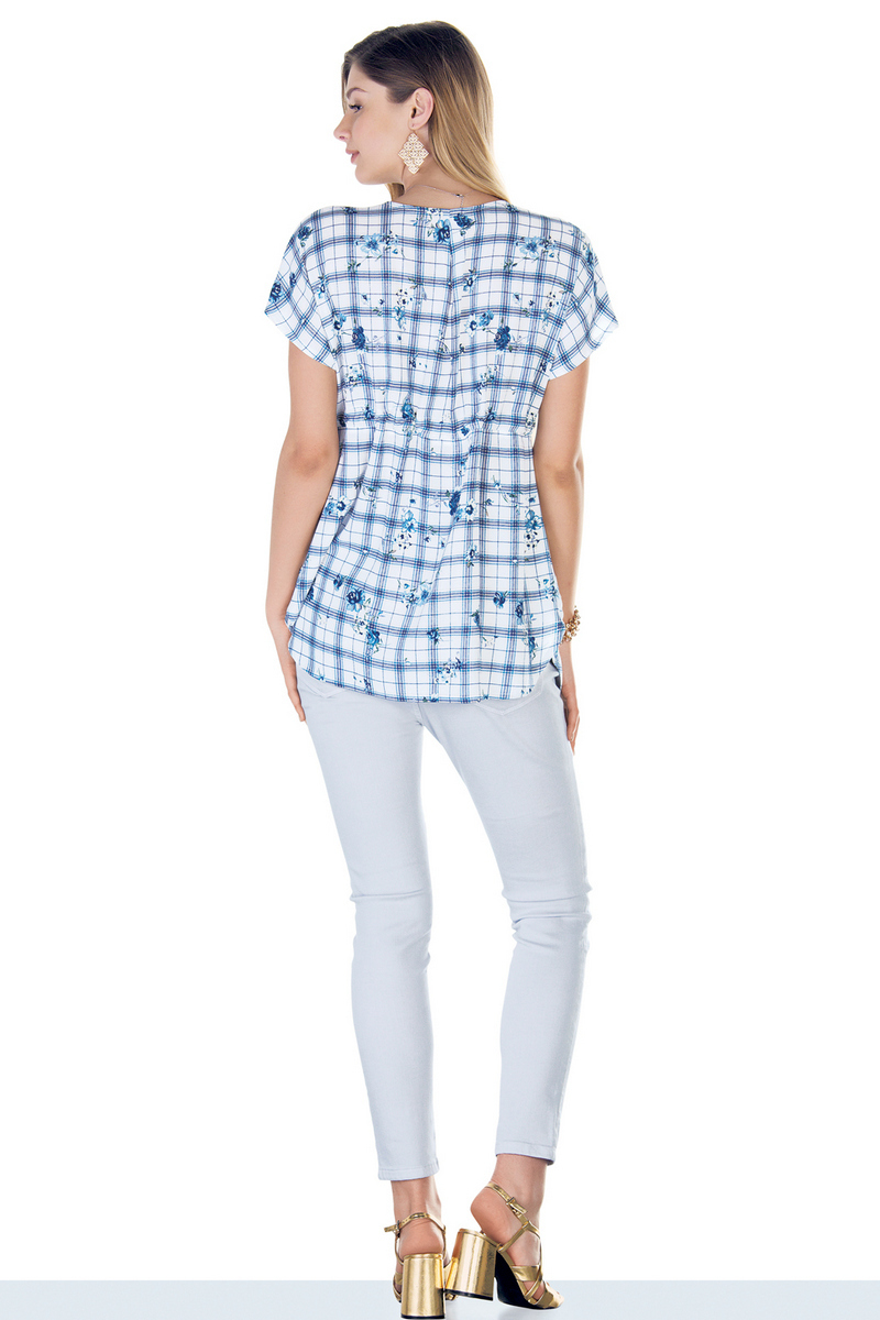 Легкая блузка для беременных, изготовлена из тонкого, приятного к телу материала, с высоким содержанием хлопка. Модель трапециевидного силуэта, с коротким рукавом, декольте «на запах». Универсальный фасон обеспечивает комфорт в период беременности, после рождения малыша скрывает временные несовершенства фигуры. Кулиска под грудью создает необходимое прилегание.