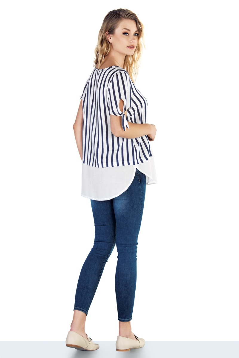 Оригинальная блуза из комбинированных тканей. Свободный крой обеспечит комфорт на всем протяжении беременности. На модели короткий рукав с завязками. Блузу легко сочетать как с классическими брюками, юбками, так и с шортами, джинсами.