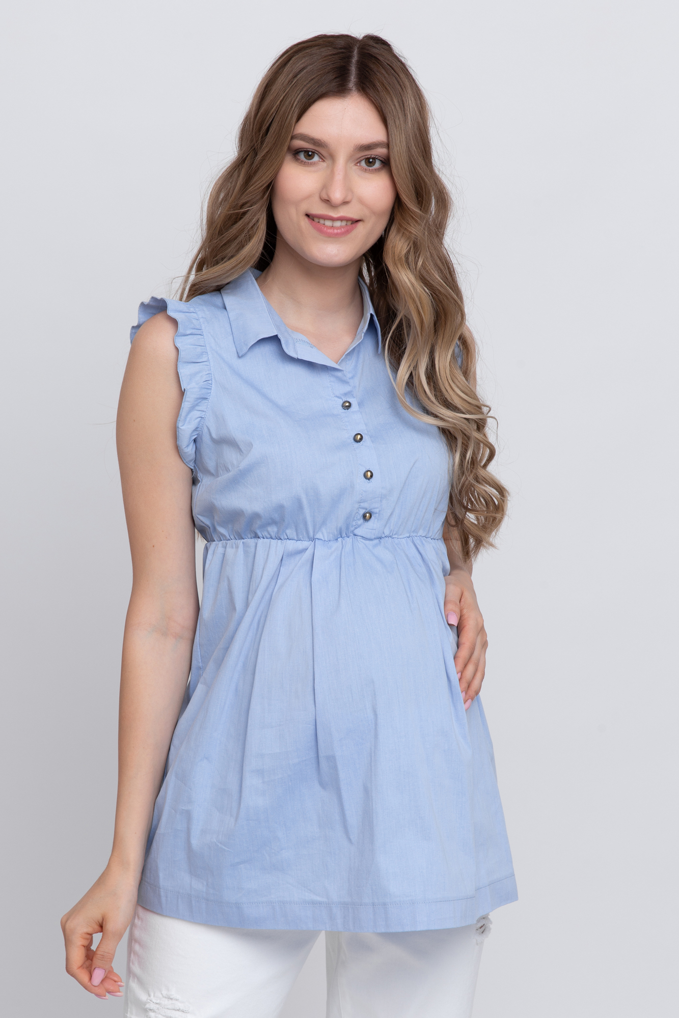 Блузка для беременных из хлопка. С ним не нарушается кожное дыхание, легко происходит впитывание и испарение влаги. В такой одежде вы будете чувствовать себя комфортно и легко. Особый крой позволяет носить изделие на всем протяжении беременности, а после родов скроет временные несовершенства фигуры. Детали: откложной воротник, застежка на пуговицы, оригинальный дизайн спинки, короткий рукав "крылышки". Блузка подойдет как для работы в офисе, так и для торжетвенного события, и на каждый день.