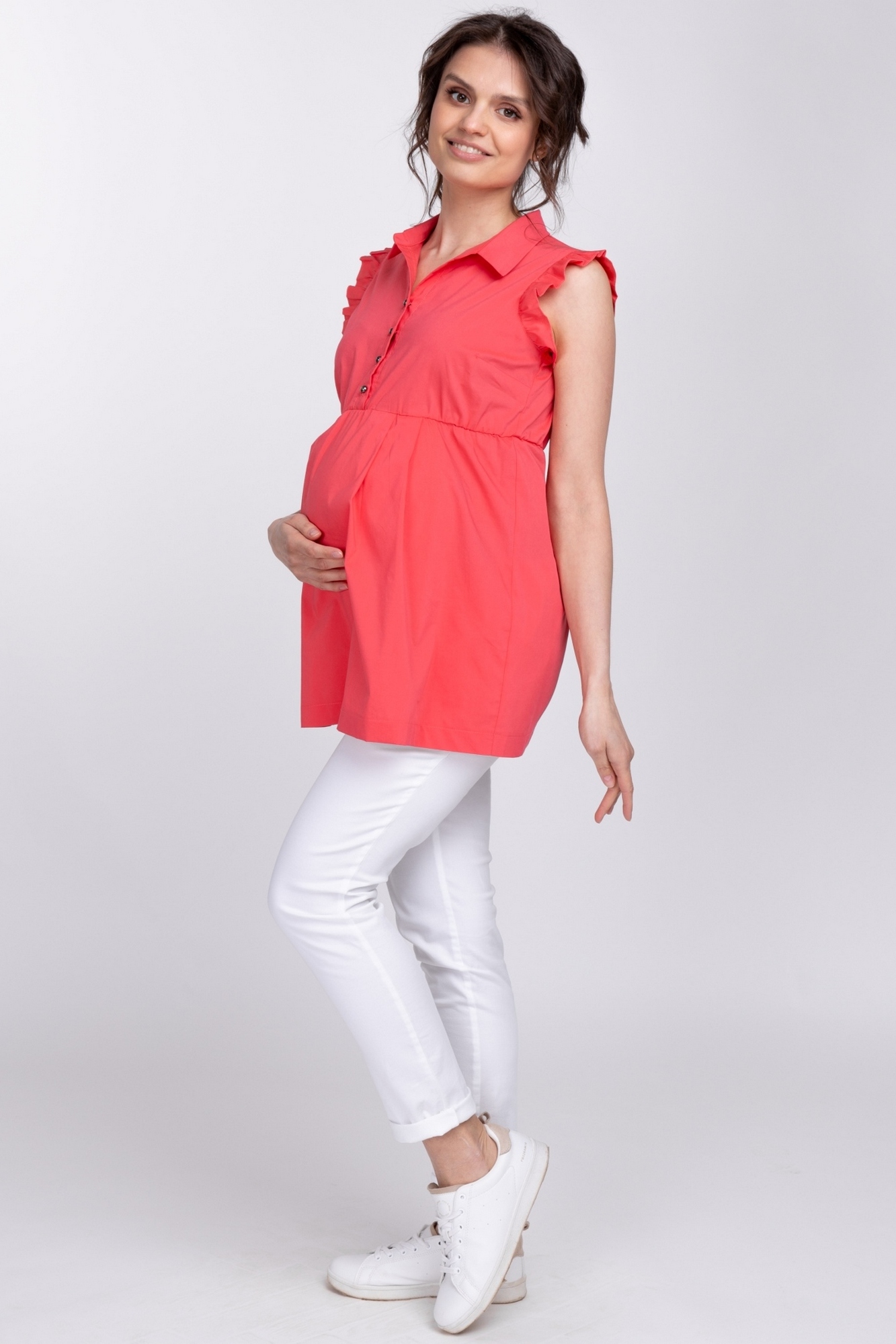 Блузка для беременных из хлопка. С ним не нарушается кожное дыхание, легко происходит впитывание и испарение влаги. В такой одежде вы будете чувствовать себя комфортно и легко. Особый крой позволяет носить изделие на всем протяжении беременности, а после родов скроет временные несовершенства фигуры. Детали: откложной воротник, застежка на пуговицы, оригинальный дизайн спинки, короткий рукав "крылышки". Блузка подойдет как для работы в офисе, так и для торжетвенного события, и на каждый день.