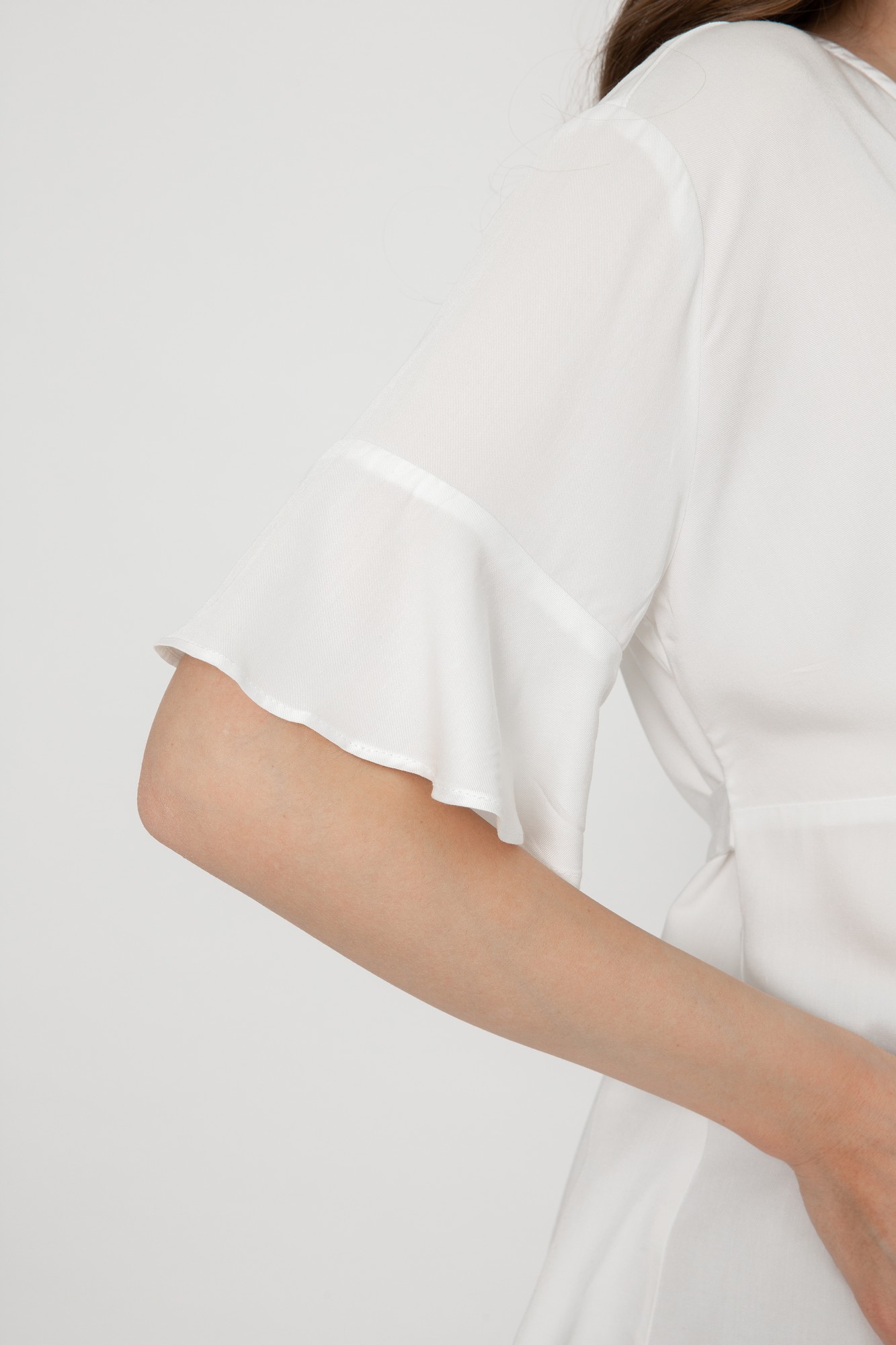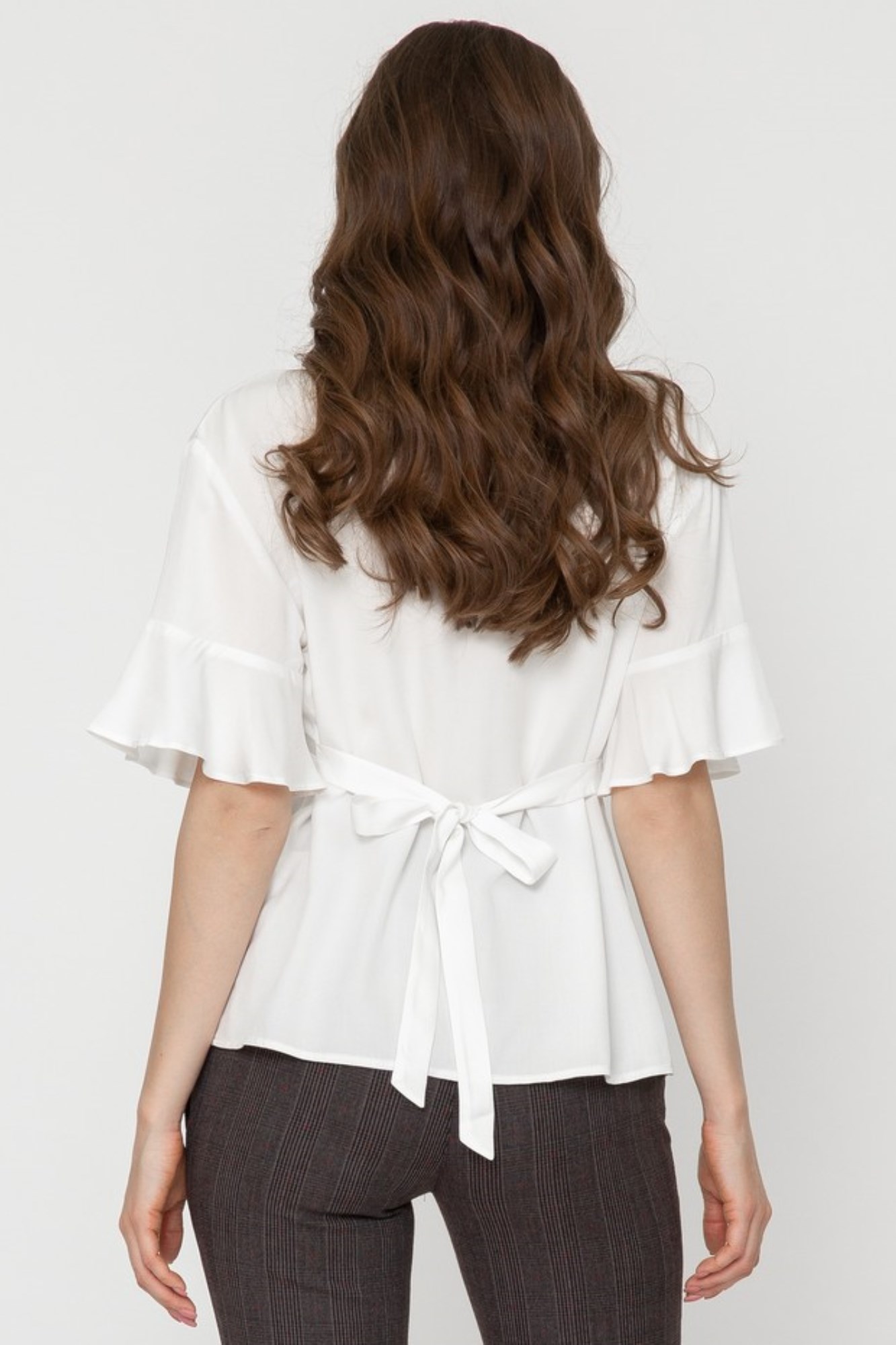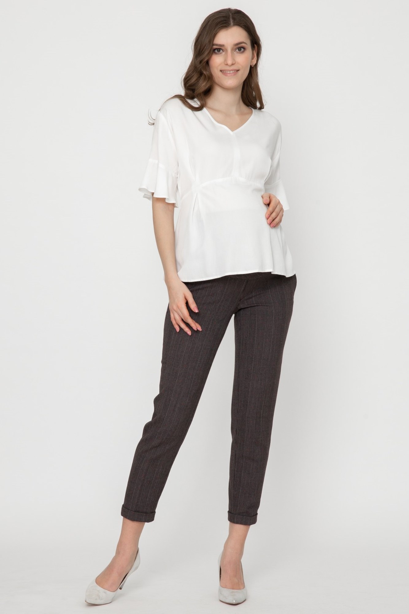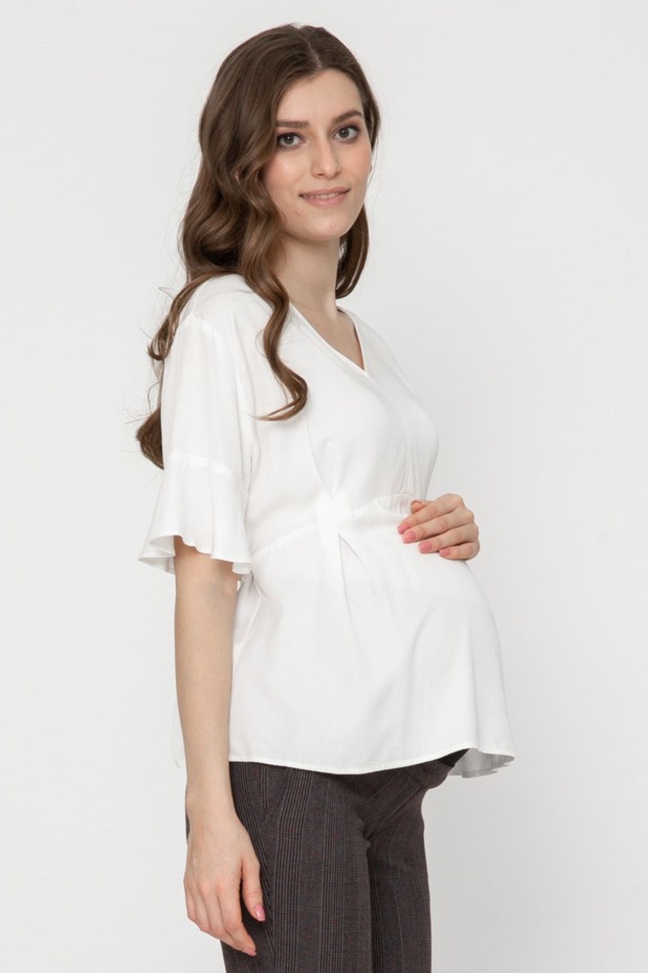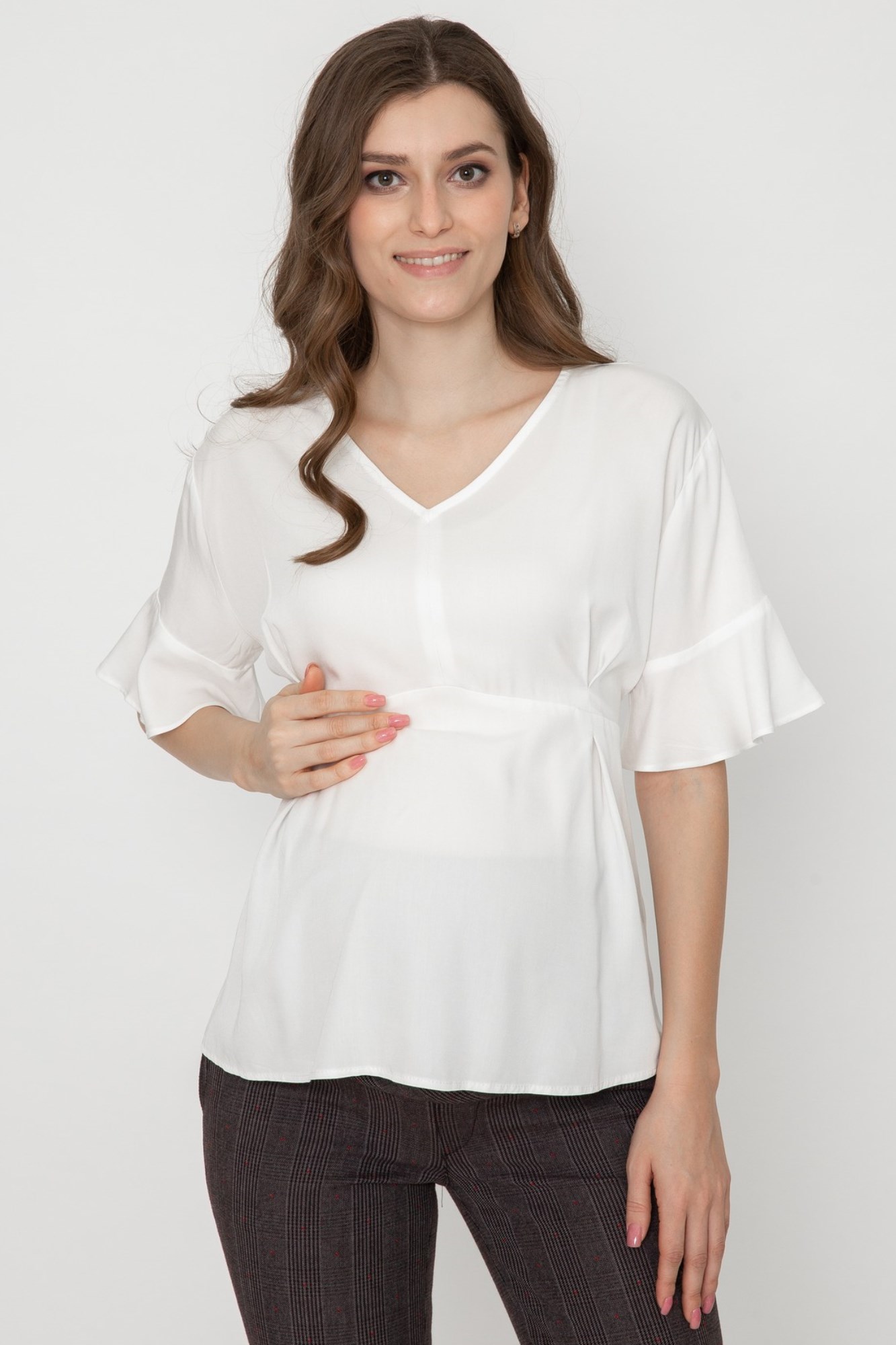Элегантная блузка из высококачественной шелковистой вискозы для будущих мам. Натуральный материал подарит приятные тактильные ощущения и обеспечит комфорт будущей маме и малышу. Свободный крой из-под груди позволяет носить изделие на всем протяжении беременности, а после родов скроет временные несовершенства фигуры. Детали: V-образный вырез горловины, нежные воланы на рукавах, завязки на спинке для прилегания. Блузка подойдет для работы в офисе и просто на каждый день, а если добавить к ней соответствующие аксессуары – может стать и частью вечернего образа.