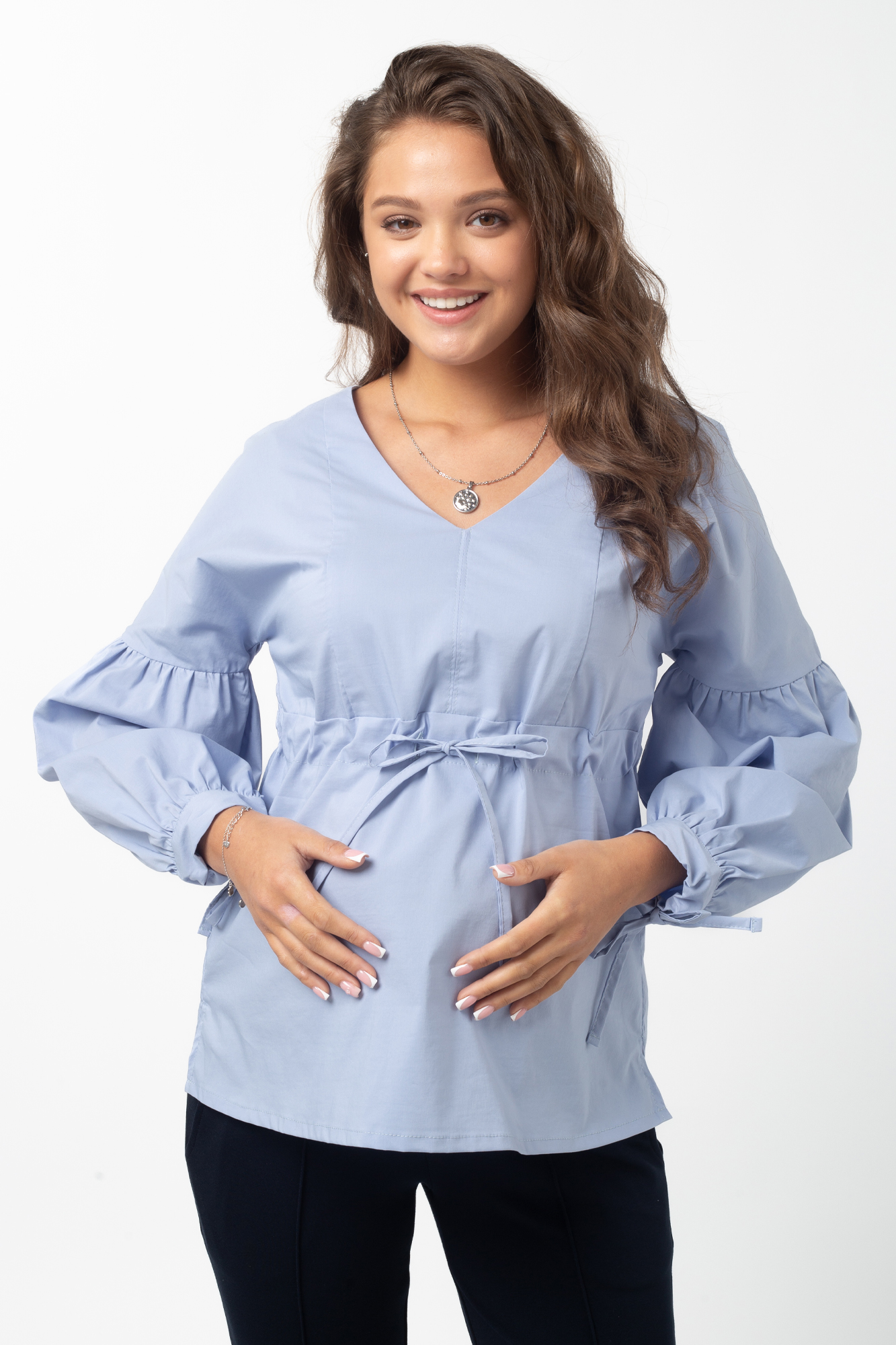 Элегантная блузка из дышащего хлопка для беременных. Натуральный материал подарит приятные тактильные ощущения и обеспечит комфорт будущей маме и малышу. Свободный крой из-под груди позволяет носить изделие на всем протяжении беременности, а после родов скроет временные несовершенства фигуры. Детали: V-образный вырез горловины, объемный рукав, завязки под грудью для прилегания. Блузка подойдет для работы в офисе и просто на каждый день, а если добавить к ней соответствующие аксессуары – может стать и частью вечернего образа.