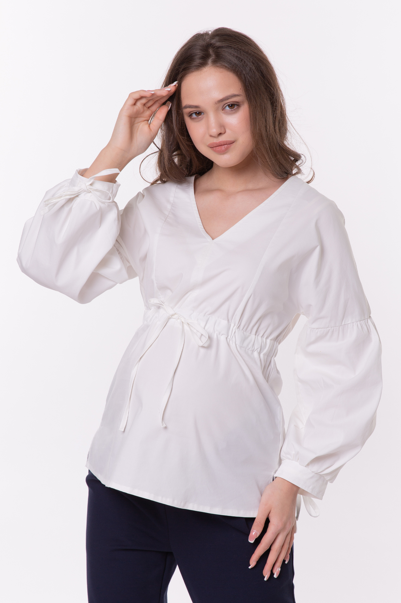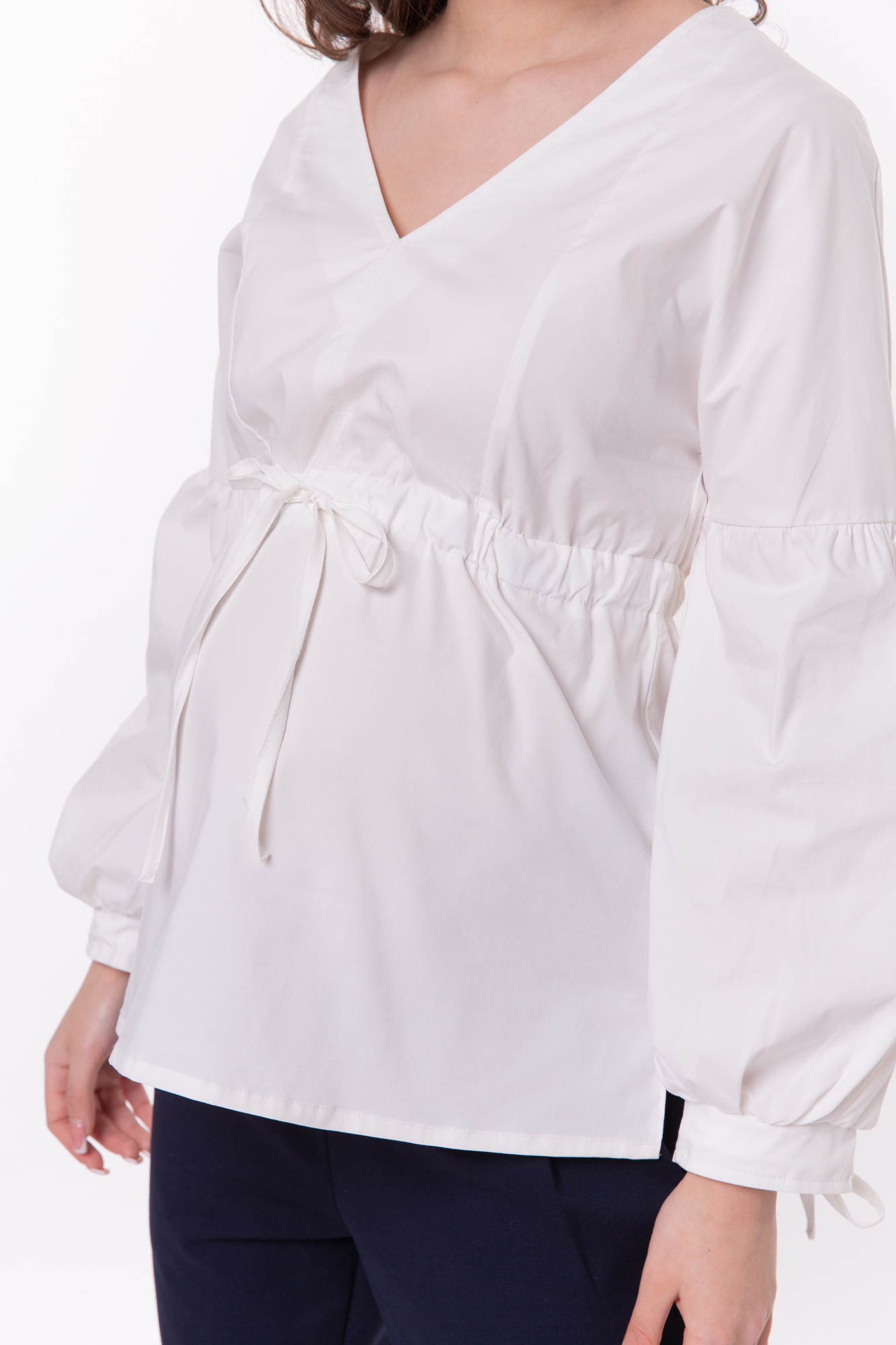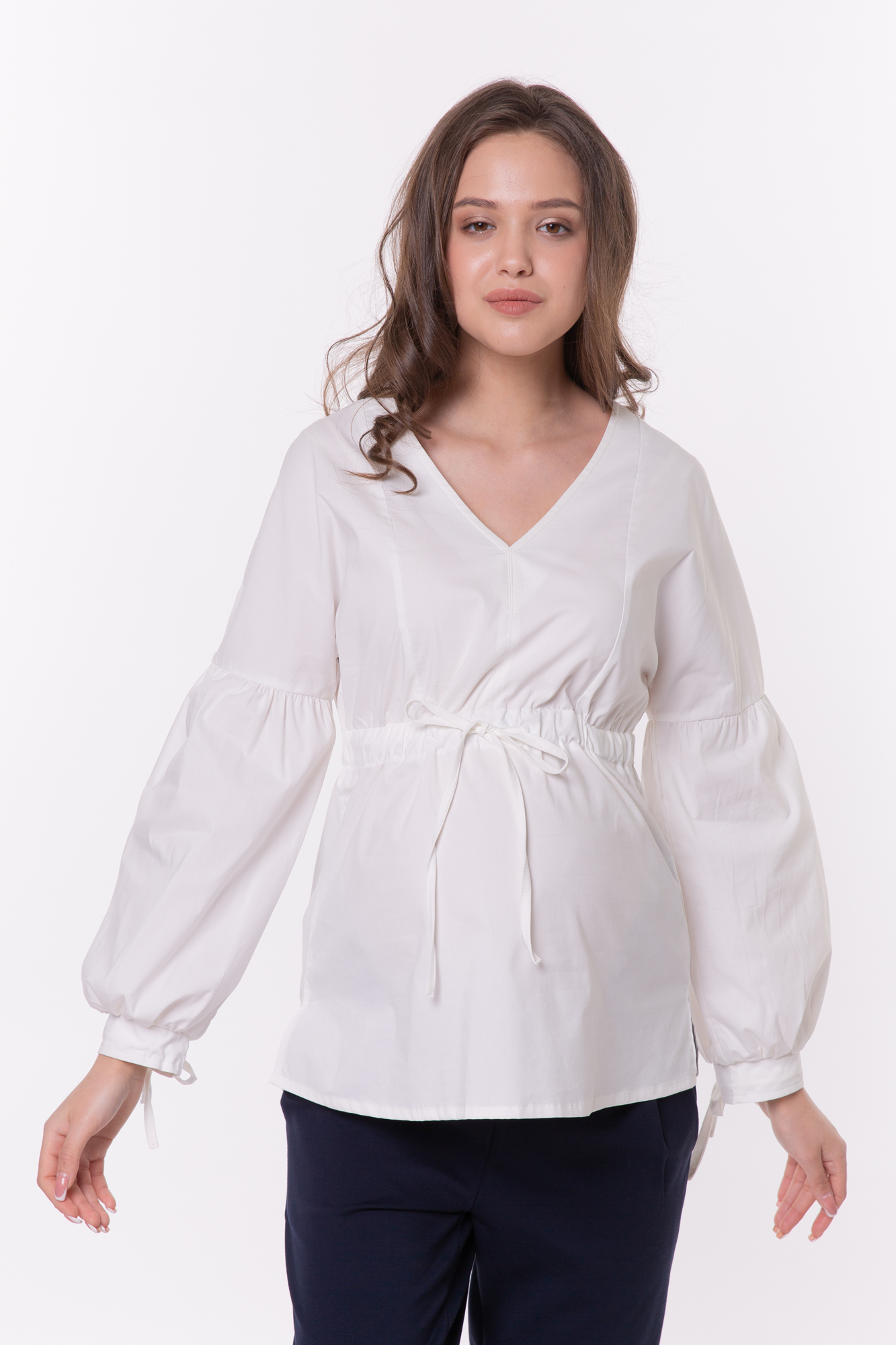 Элегантная блузка из дышащего хлопка для беременных. Натуральный материал подарит приятные тактильные ощущения и обеспечит комфорт будущей маме и малышу. Свободный крой из-под груди позволяет носить изделие на всем протяжении беременности, а после родов скроет временные несовершенства фигуры. Детали: V-образный вырез горловины, объемный рукав, завязки под грудью для прилегания. Блузка подойдет для работы в офисе и просто на каждый день, а если добавить к ней соответствующие аксессуары – может стать и частью вечернего образа.