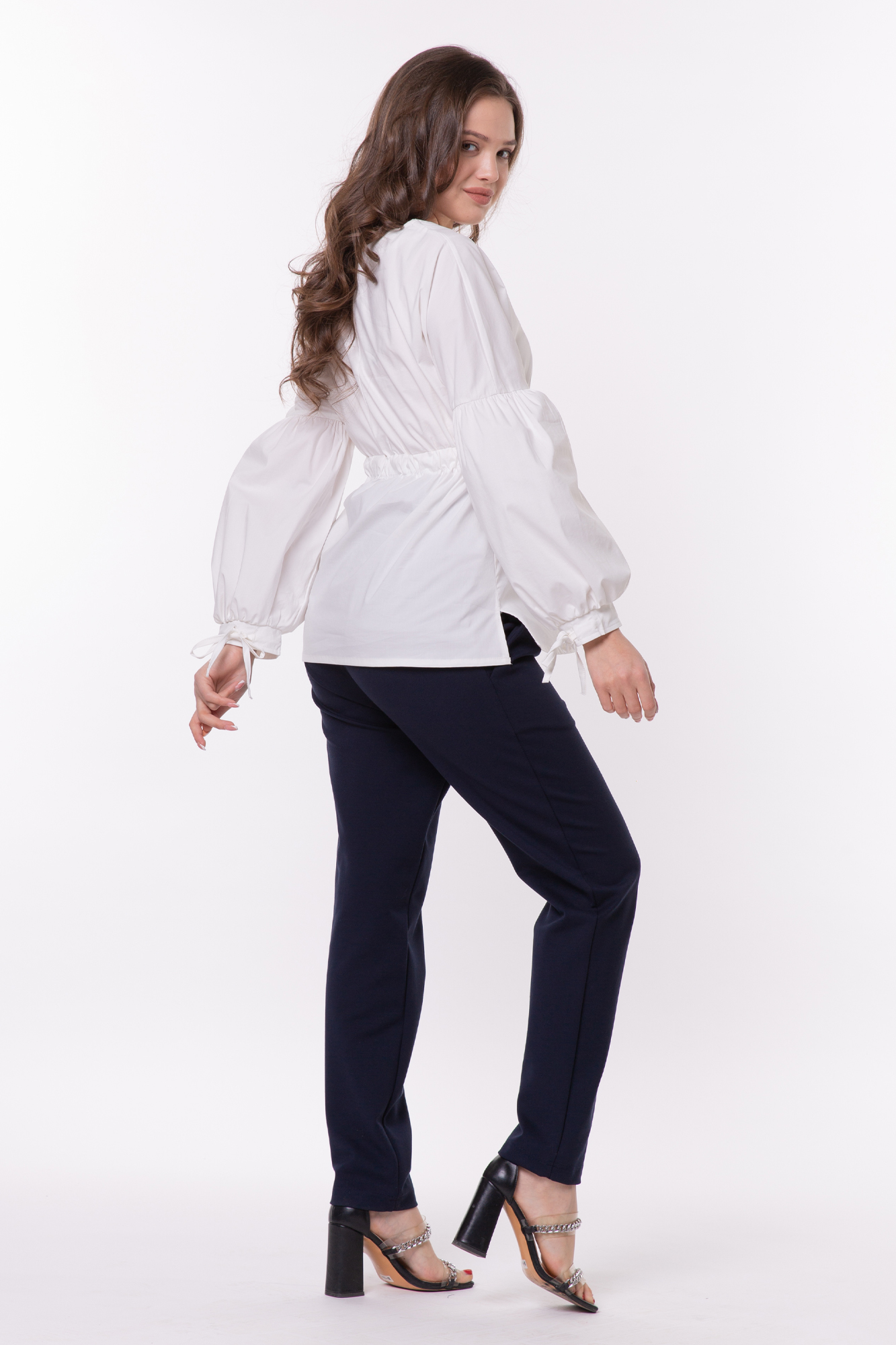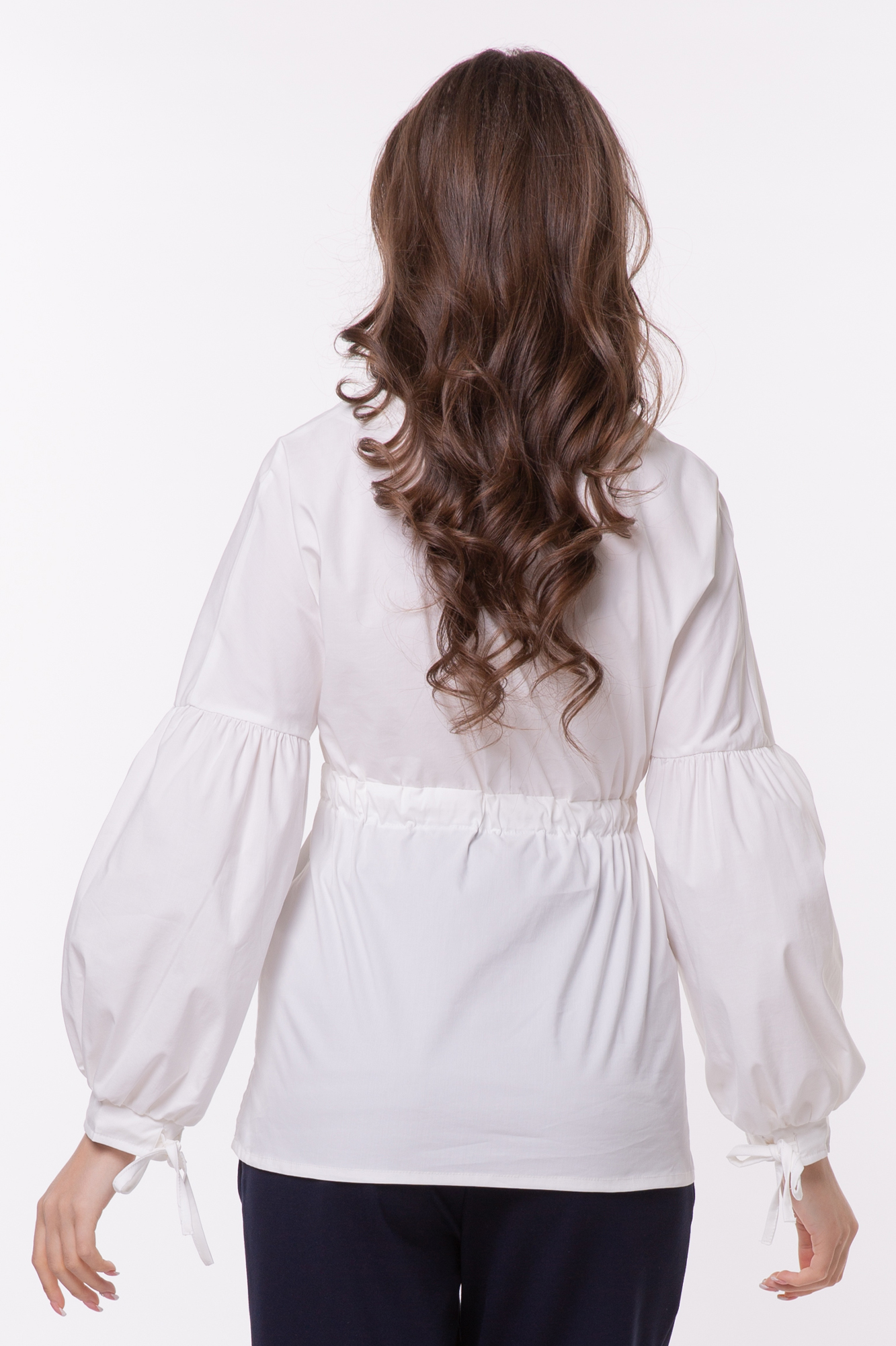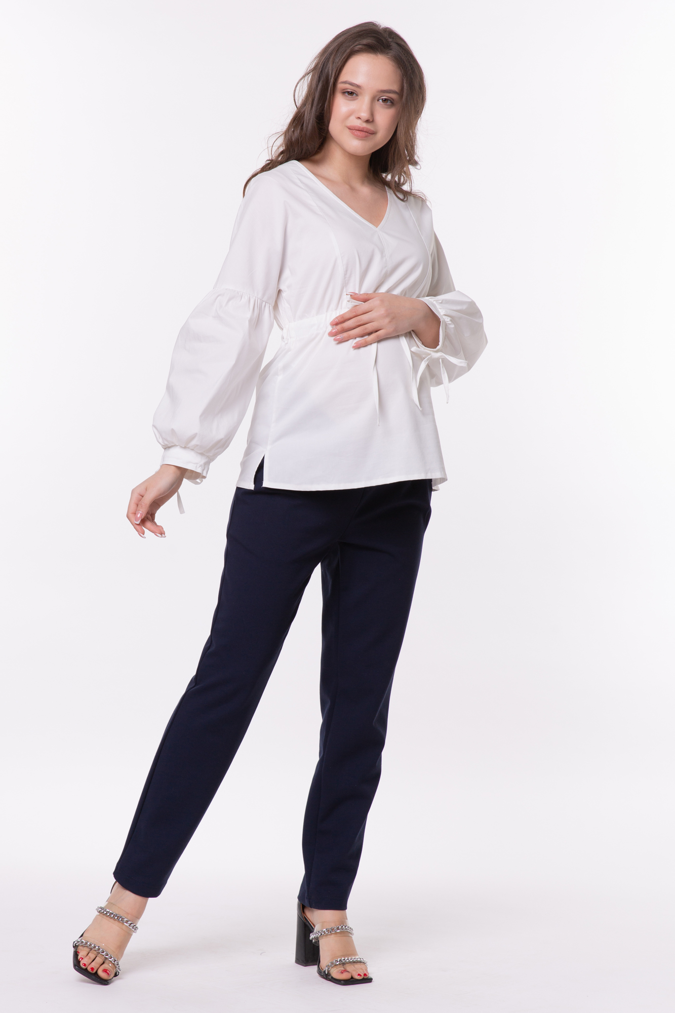 Элегантная блузка из дышащего хлопка для беременных. Натуральный материал подарит приятные тактильные ощущения и обеспечит комфорт будущей маме и малышу. Свободный крой из-под груди позволяет носить изделие на всем протяжении беременности, а после родов скроет временные несовершенства фигуры. Детали: V-образный вырез горловины, объемный рукав, завязки под грудью для прилегания. Блузка подойдет для работы в офисе и просто на каждый день, а если добавить к ней соответствующие аксессуары – может стать и частью вечернего образа.