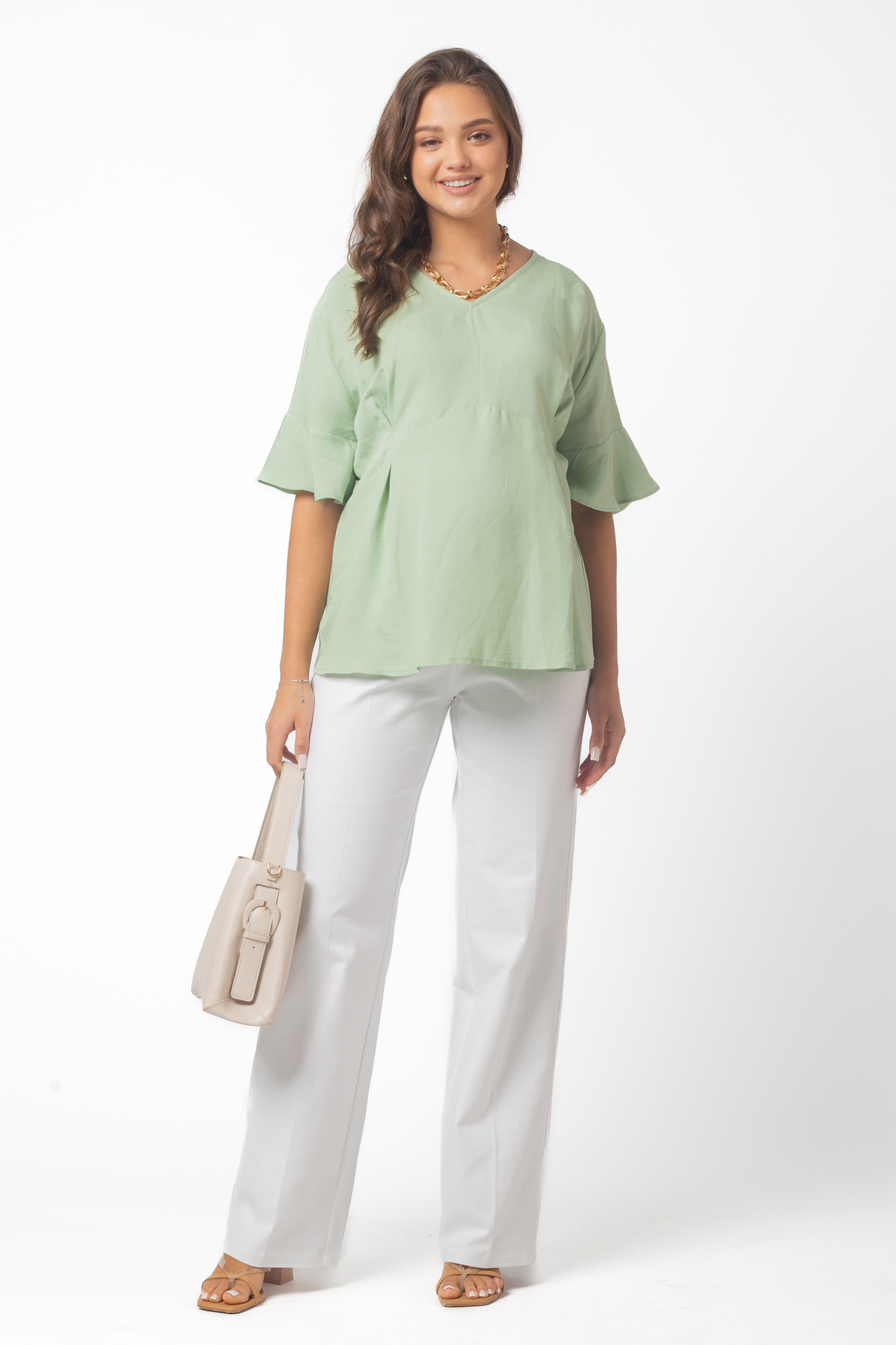 Элегантная блузка из высококачественной шелковистой вискозы для будущих мам. Натуральный материал подарит приятные тактильные ощущения и обеспечит комфорт будущей маме и малышу. Свободный крой из-под груди позволяет носить изделие на всем протяжении беременности, а после родов скроет временные несовершенства фигуры. Детали: V-образный вырез горловины, нежные воланы на рукавах, завязки на спинке для прилегания. Блузка подойдет для работы в офисе и просто на каждый день, а если добавить к ней соответствующие аксессуары – может стать и частью вечернего образа.