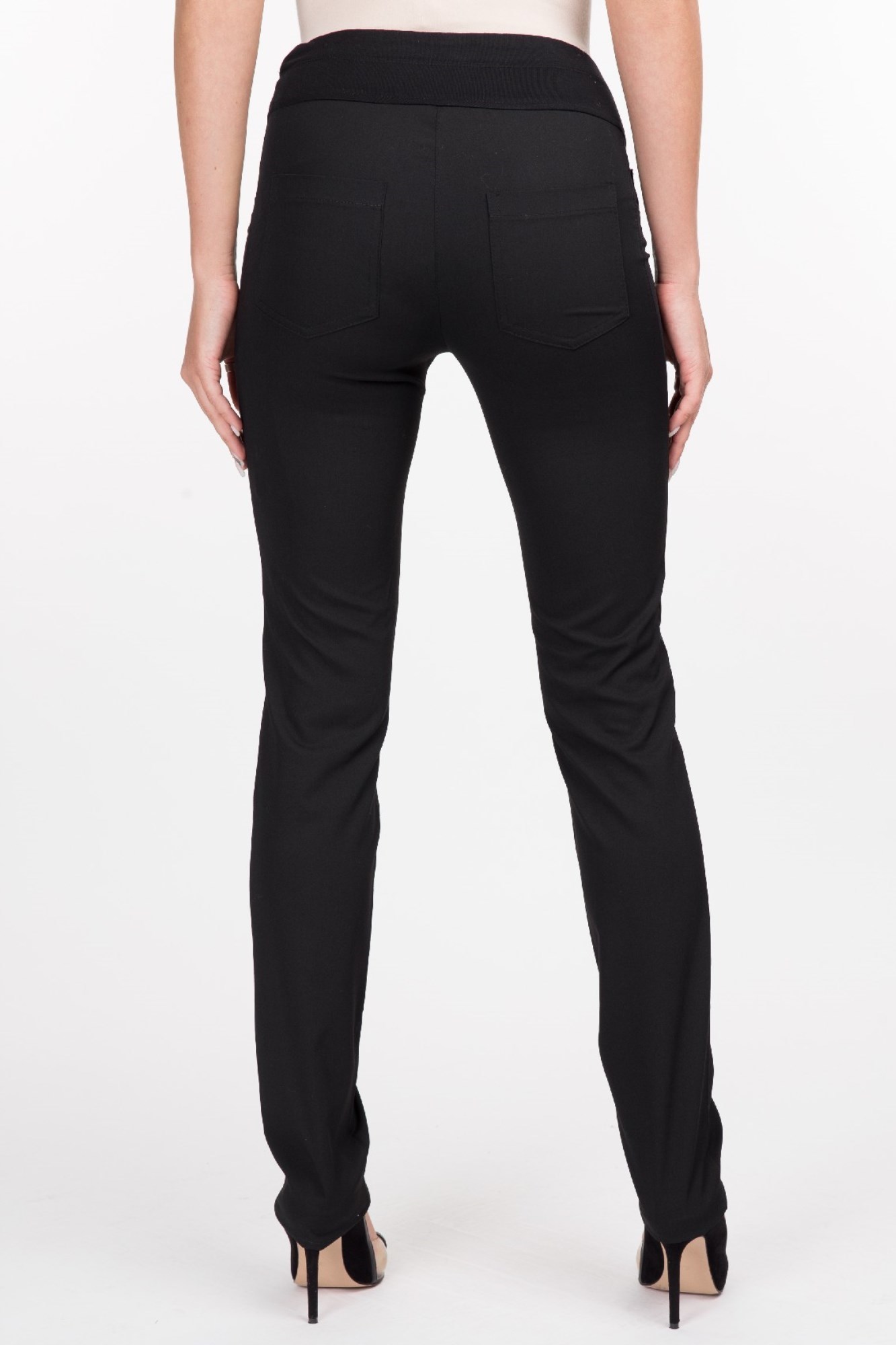 Брюки выполнены из тонкого текстиля. Модель зауженного кроя. Детали: неширокая бандажная резинка под живот, три кармана спереди и два накладных кармана сзади, шлевки для ремня. Великолепно подойдут для работы в офисе, деловых встреч и на каждый день.