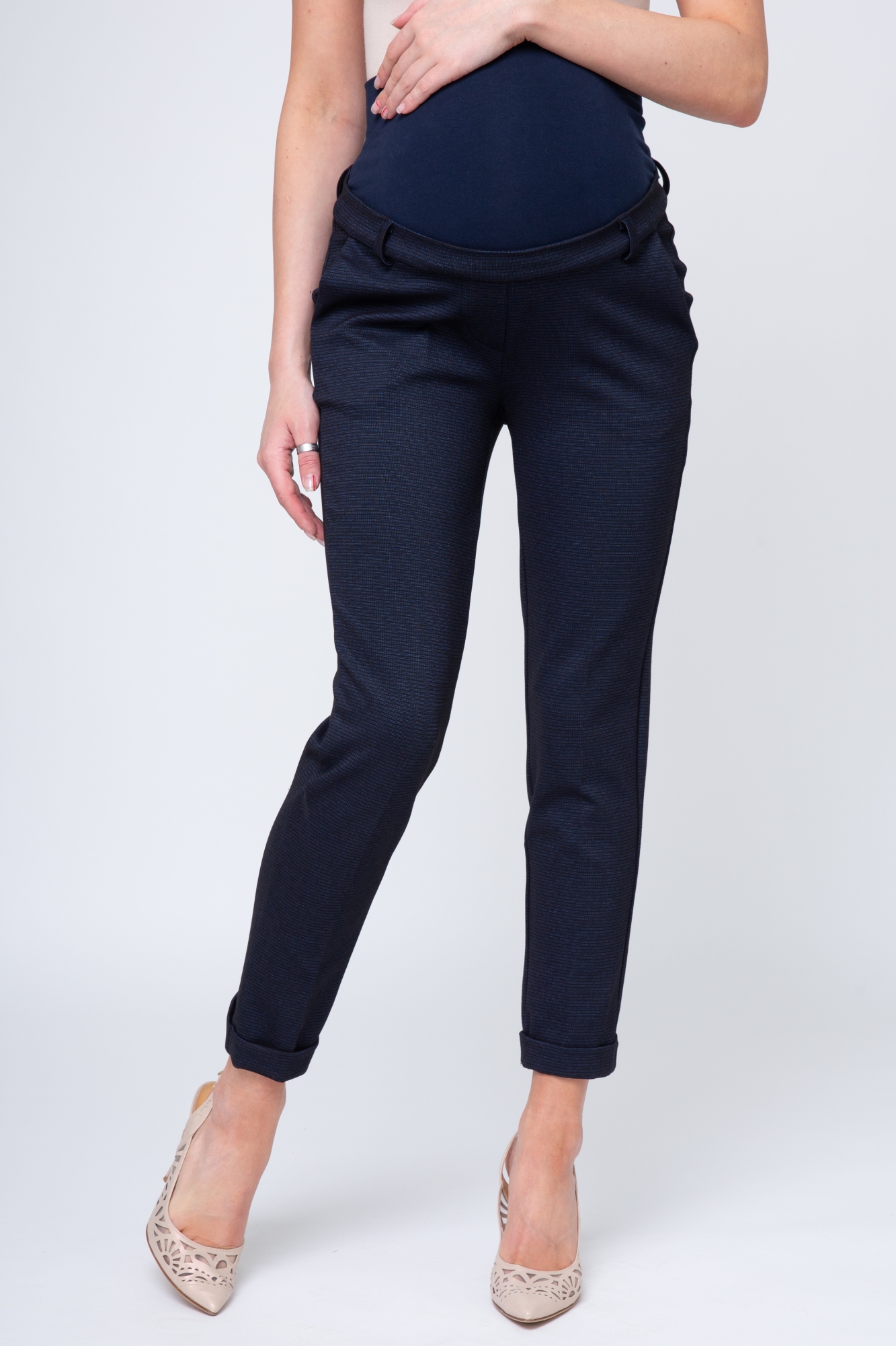 Брюки из высококачественного трикотажа для будущих мам. Детали: высокий эластичный бандаж, скошенные карманы, регулировка объема для животика осуществляется при помощи резинки, продетой в пояс брюк. В зависимости от подобранных дополнений они могут стать частью и офисного костюма, и одежды для непринуждённого отдыха, и наряда для торжественного события.