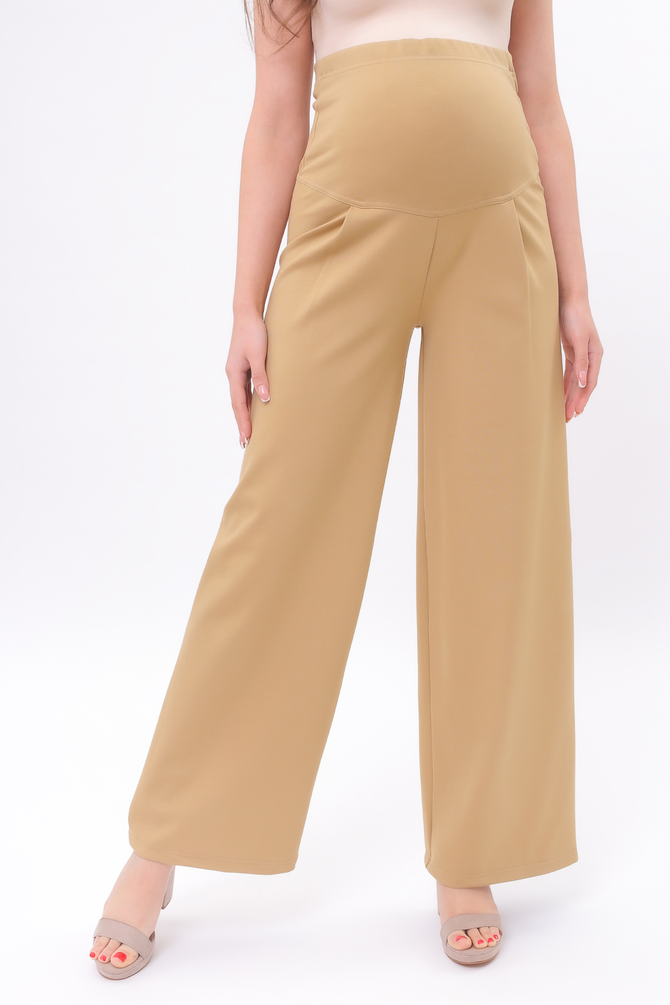 Широкие брюки из для беременных из плотного джерси. Высококачественная ткань не пиллингуется, обладает высокой износостойкостью, проста в уходе. Высокий трикотажный бандаж не сдавливвает, мягко и деликатно поддерживает растущий животик. Регулировка объема для животика осуществляется при помощи резинки, продетой в верхнюю часть брюк. В зависимости от подобранных дополнений их можно носить в офис, на торжество и просто каждый день. Классические брюки станут незаменимой частью базового гардероба будущей мамы.