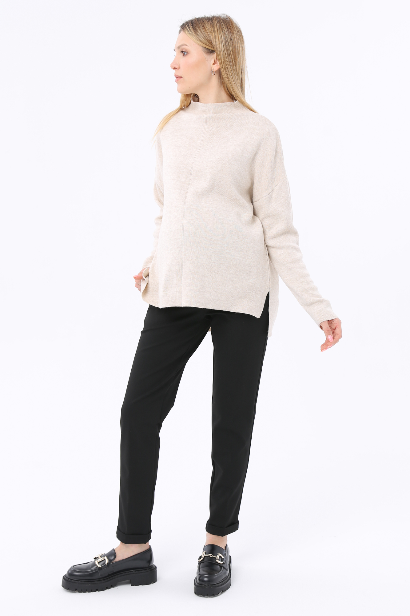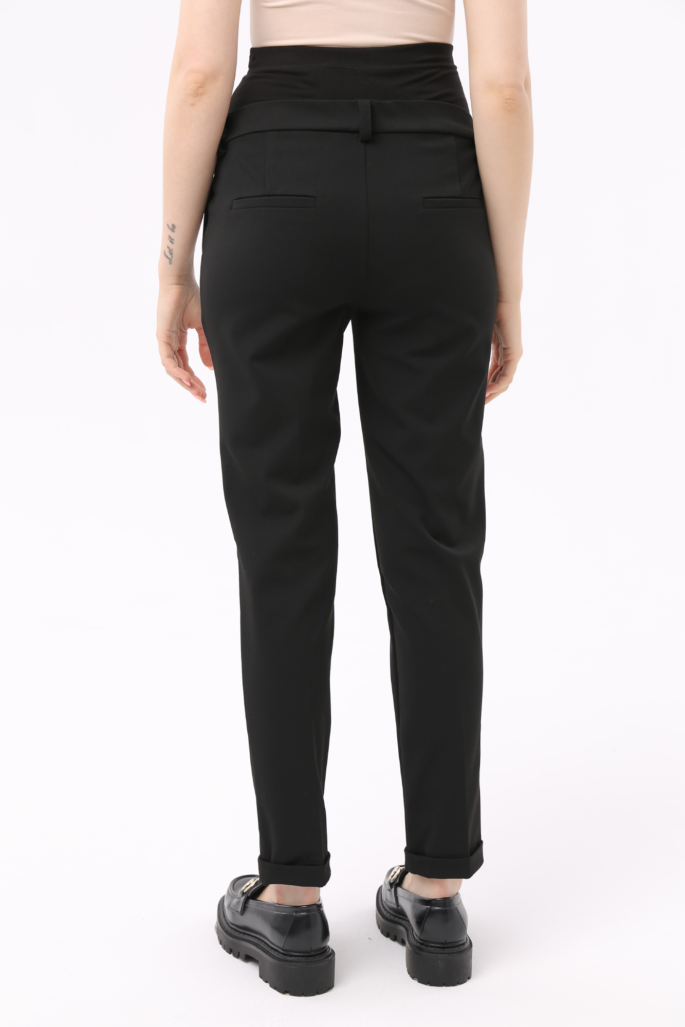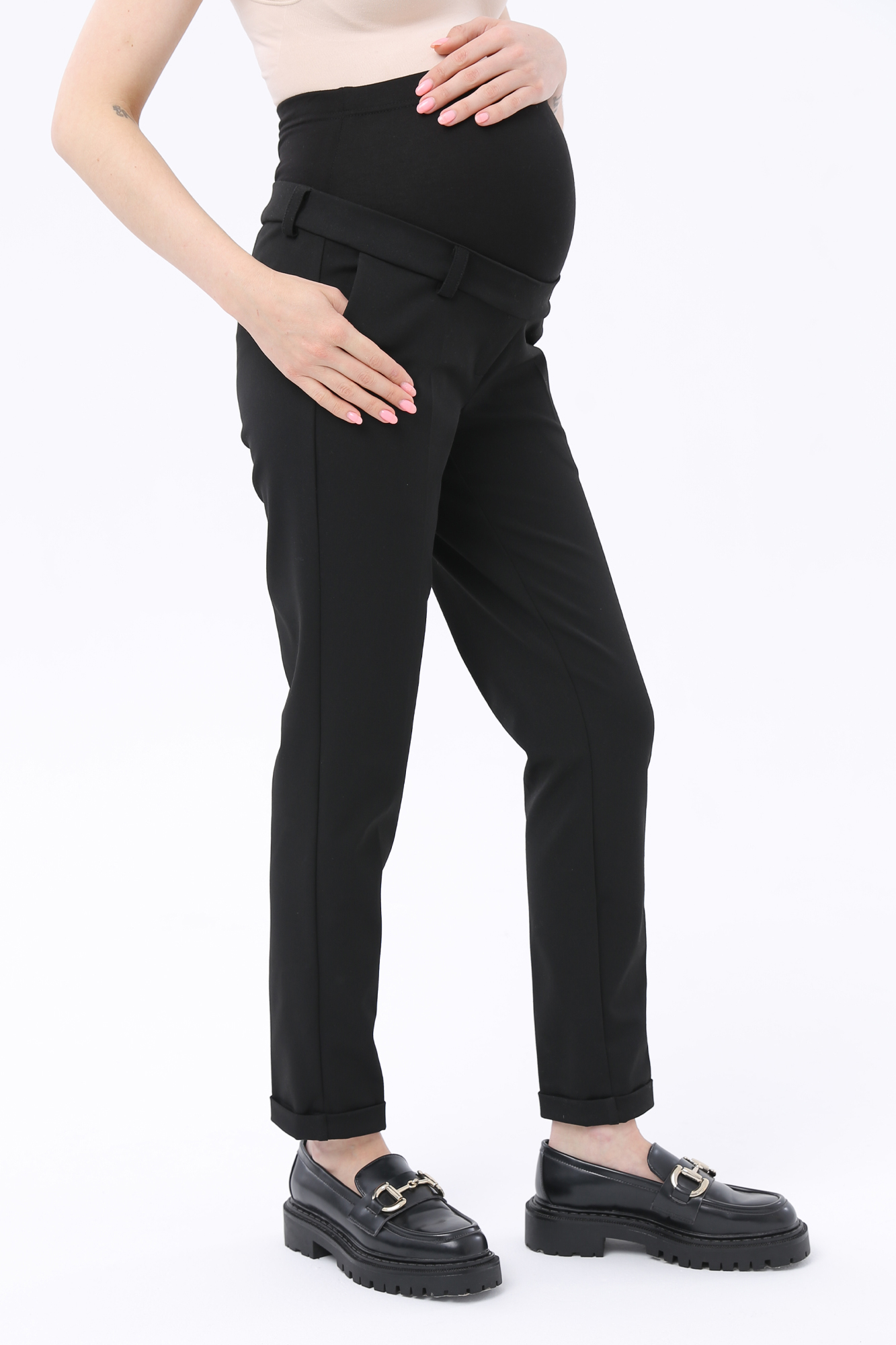 Брюки из высококачественного трикотажа для будущих мам. Детали: высокий эластичный бандаж, скошенные карманы, регулировка объема для животика осуществляется при помощи резинки, продетой в пояс брюк. В зависимости от подобранных дополнений они могут стать частью и офисного костюма, и одежды для непринуждённого отдыха, и наряда для торжественного события.