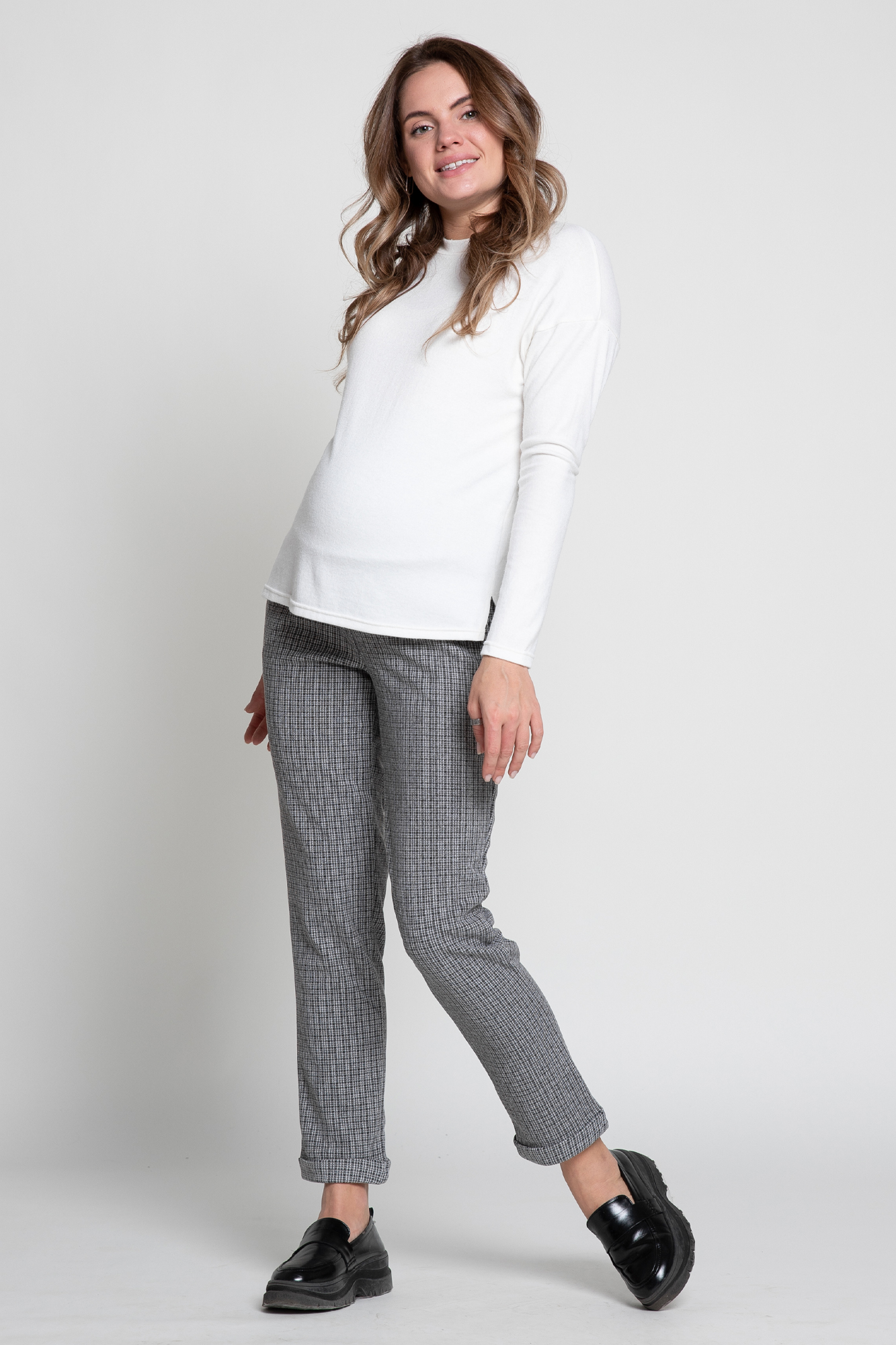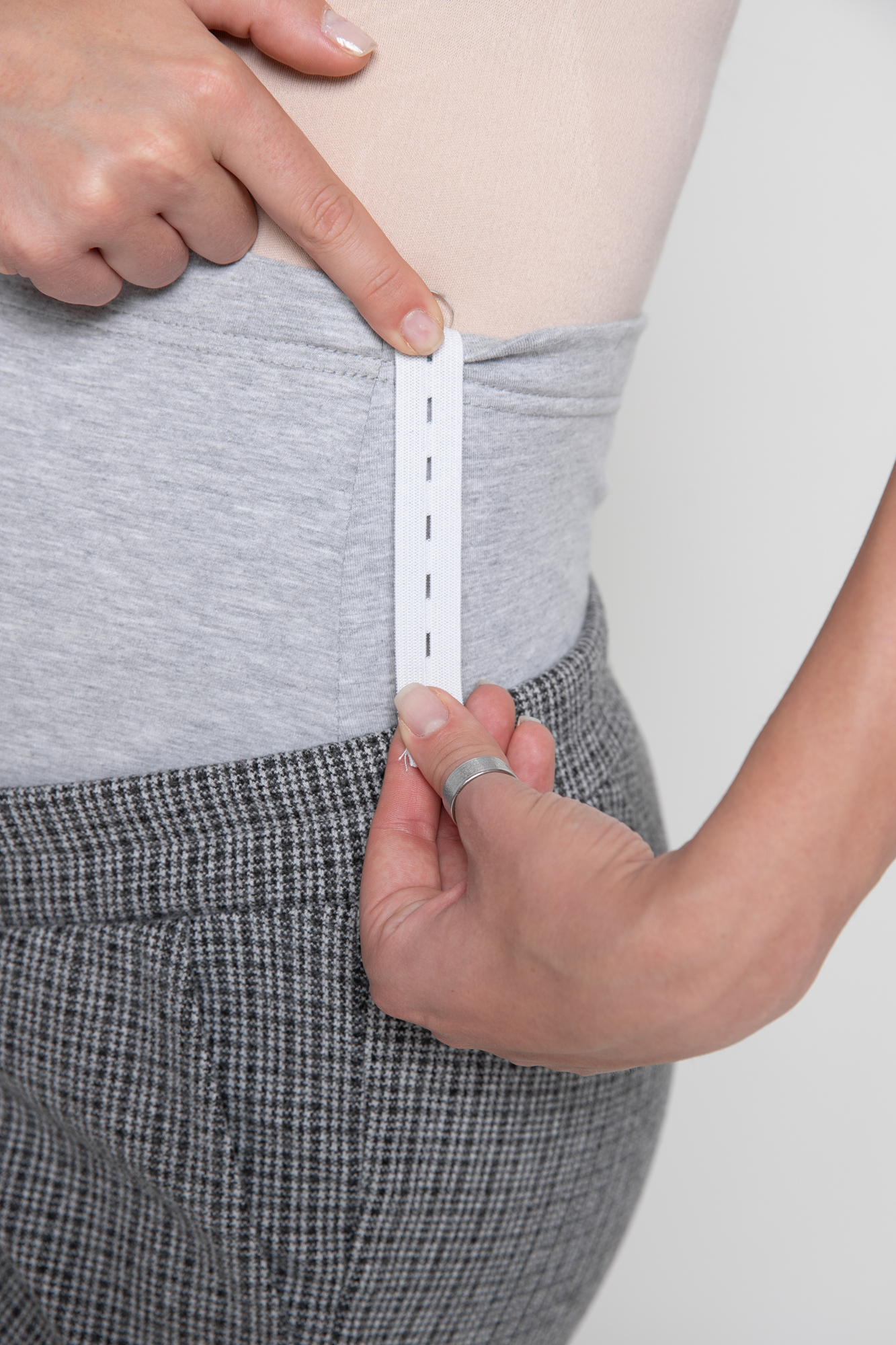 Плотные классические брюки для беременных. Детали: высокий эластичный бандаж, скошенные боковые карманы. Объем регулируется с помощью перфорированной резинки, перестегивающейся на пуговицу, продетой в пояс изделия. В зависимости от подобранных дополнений они могут стать частью и офисного костюма, и одежды для непринуждённого отдыха, и наряда для торжественного события.