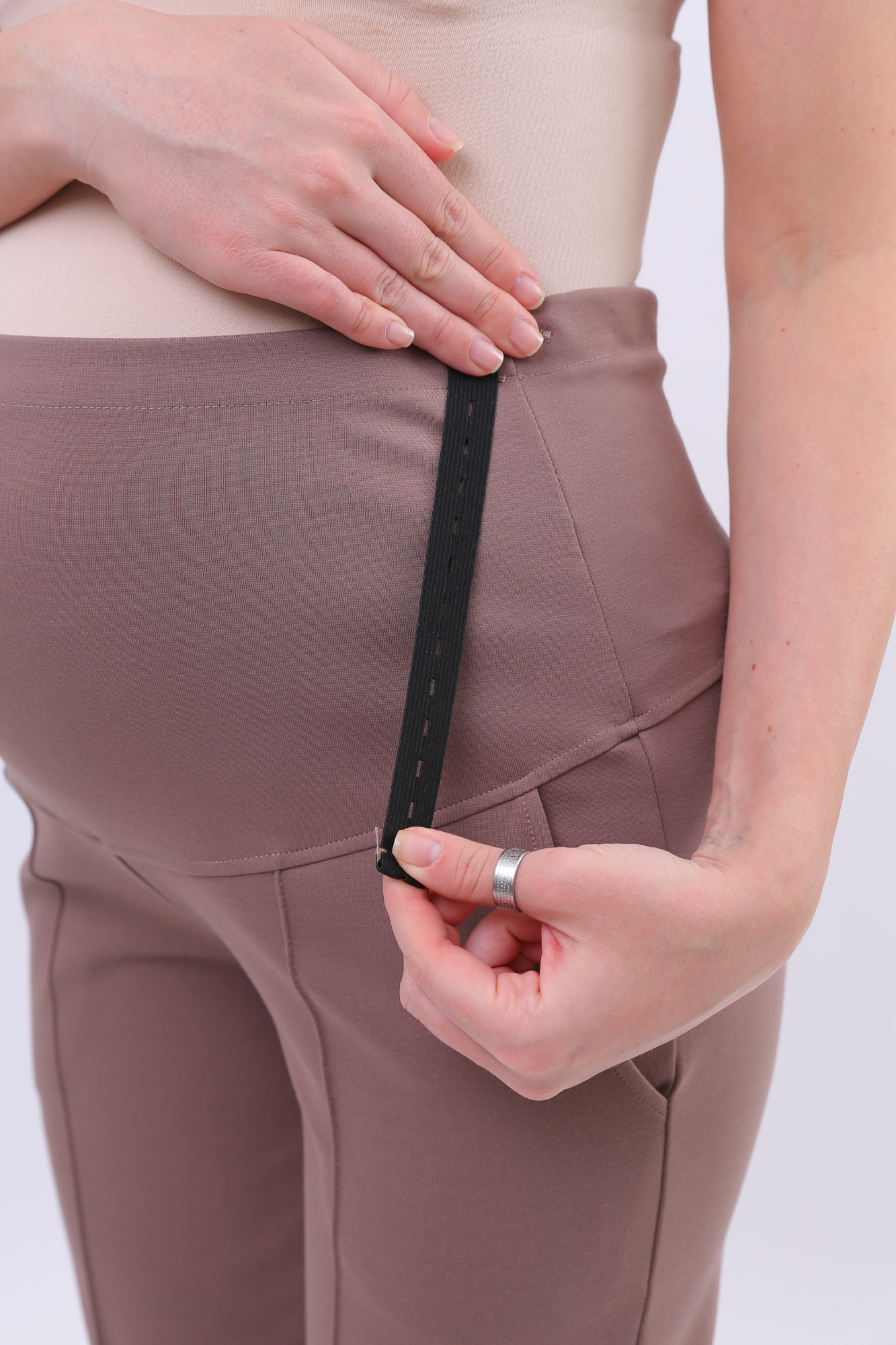 Зауженные брюки для беременных выполнены из плотного джерси. Детали: высокий эластичный бандаж, скошенные боковые карманы, отстроченные стрелки. Объем регулируется с помощью перфорированной резинки, перестегивающейся на пуговицу, продетой в верхнюю часть изделия. Эластичность ткани и регулировка объема обеспечивают идеальную посадку на всем протяжении бременности. В зависимости от подобранных дополнений они могут стать частью и офисного костюма, и одежды для непринуждённого отдыха, и наряда для торжественного события.