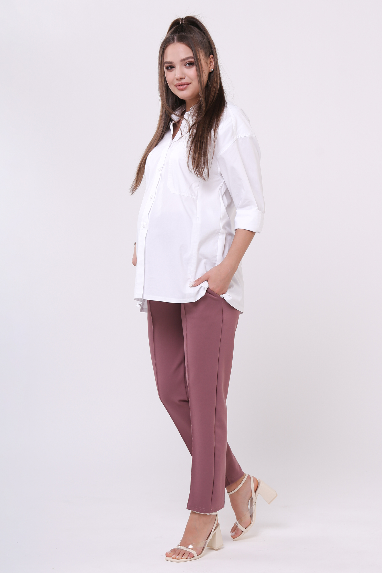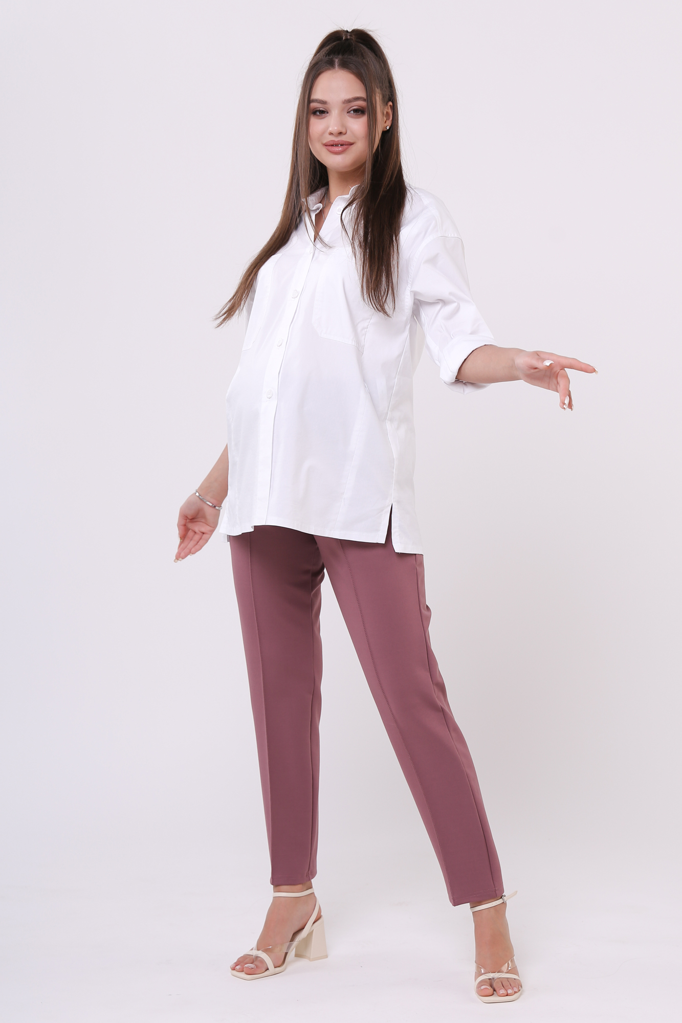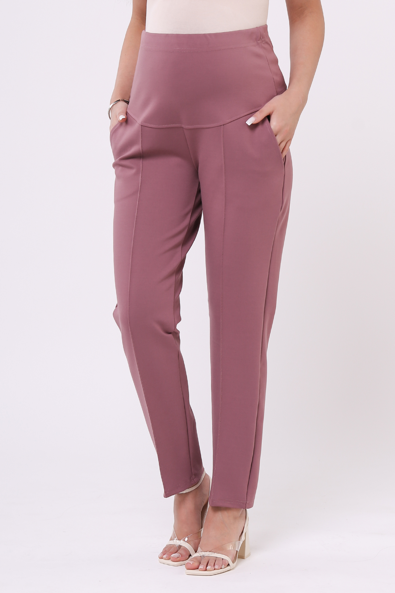 Зауженные брюки для беременных выполнены из плотного джерси. Детали: высокий эластичный бандаж, скошенные боковые карманы, отстроченные стрелки. Объем регулируется с помощью перфорированной резинки, перестегивающейся на пуговицу, продетой в верхнюю часть изделия. Эластичность ткани и регулировка объема обеспечивают идеальную посадку на всем протяжении бременности. В зависимости от подобранных дополнений они могут стать частью и офисного костюма, и одежды для непринуждённого отдыха, и наряда для торжественного события.