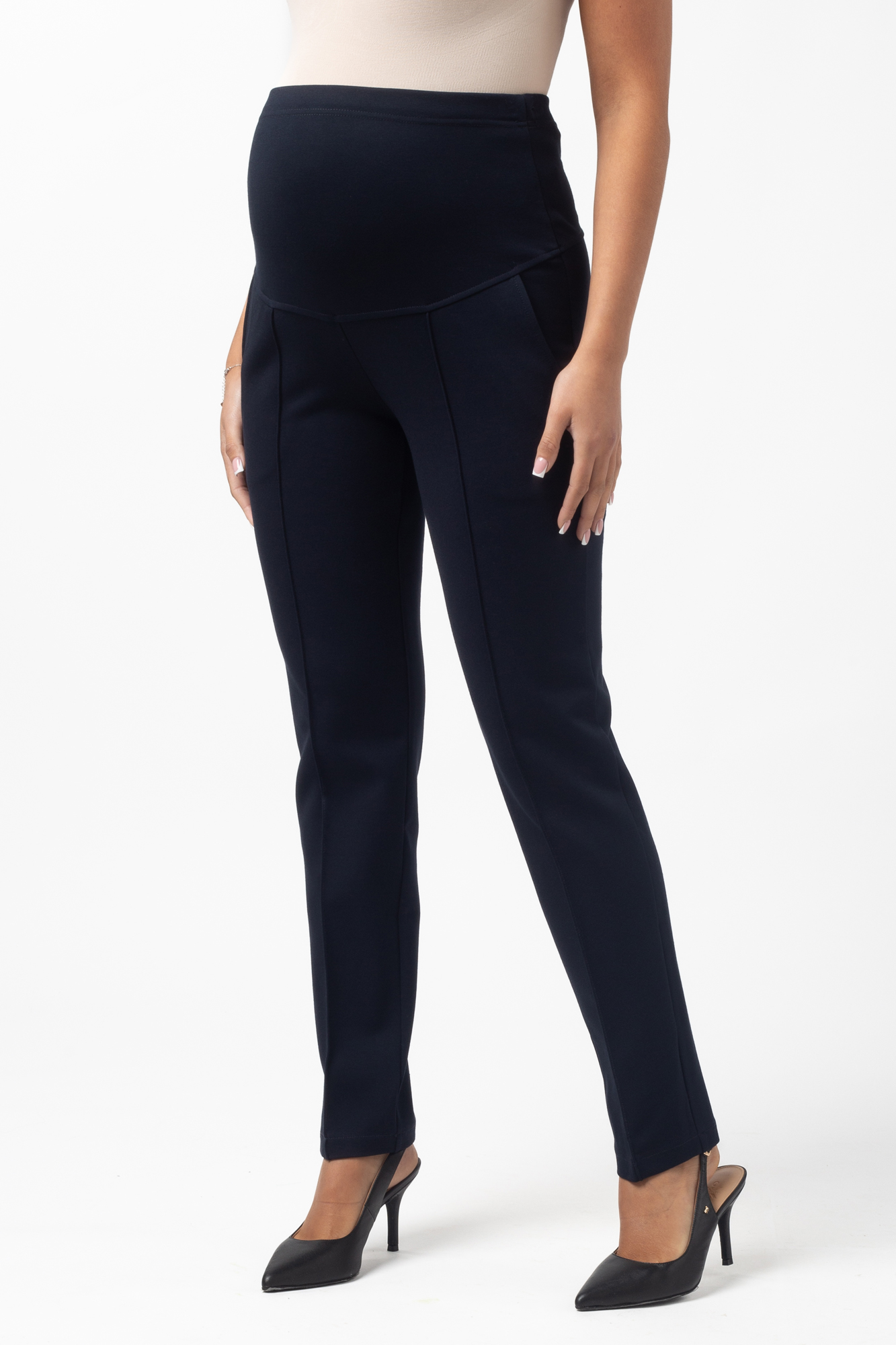 Зауженные брюки для беременных выполнены из плотного джерси. Детали: высокий эластичный бандаж, скошенные боковые карманы, отстроченные стрелки. Объем регулируется с помощью перфорированной резинки, перестегивающейся на пуговицу, продетой в верхнюю часть изделия. Эластичность ткани и регулировка объема обеспечивают идеальную посадку на всем протяжении бременности. В зависимости от подобранных дополнений они могут стать частью и офисного костюма, и одежды для непринуждённого отдыха, и наряда для торжественного события.