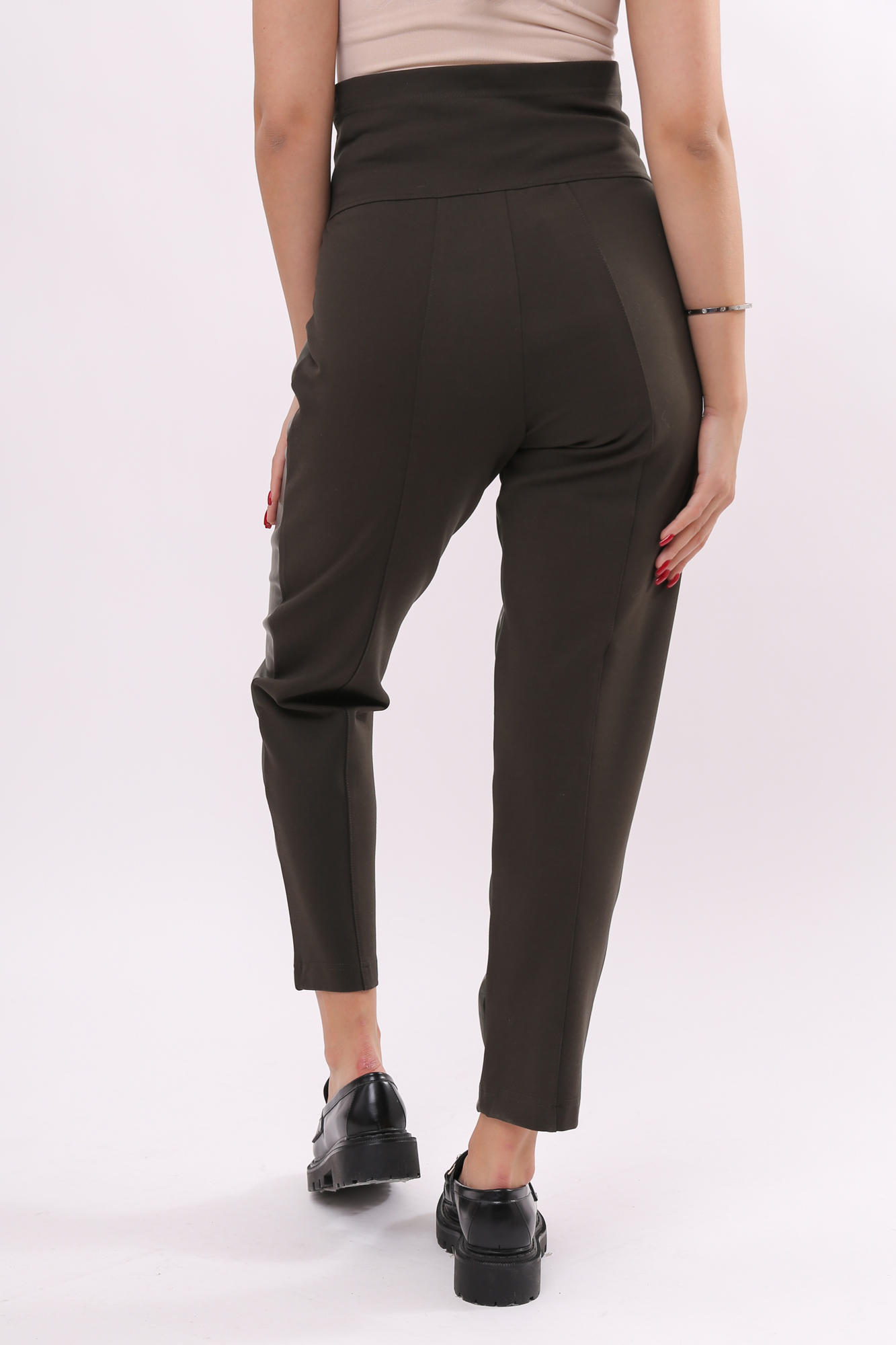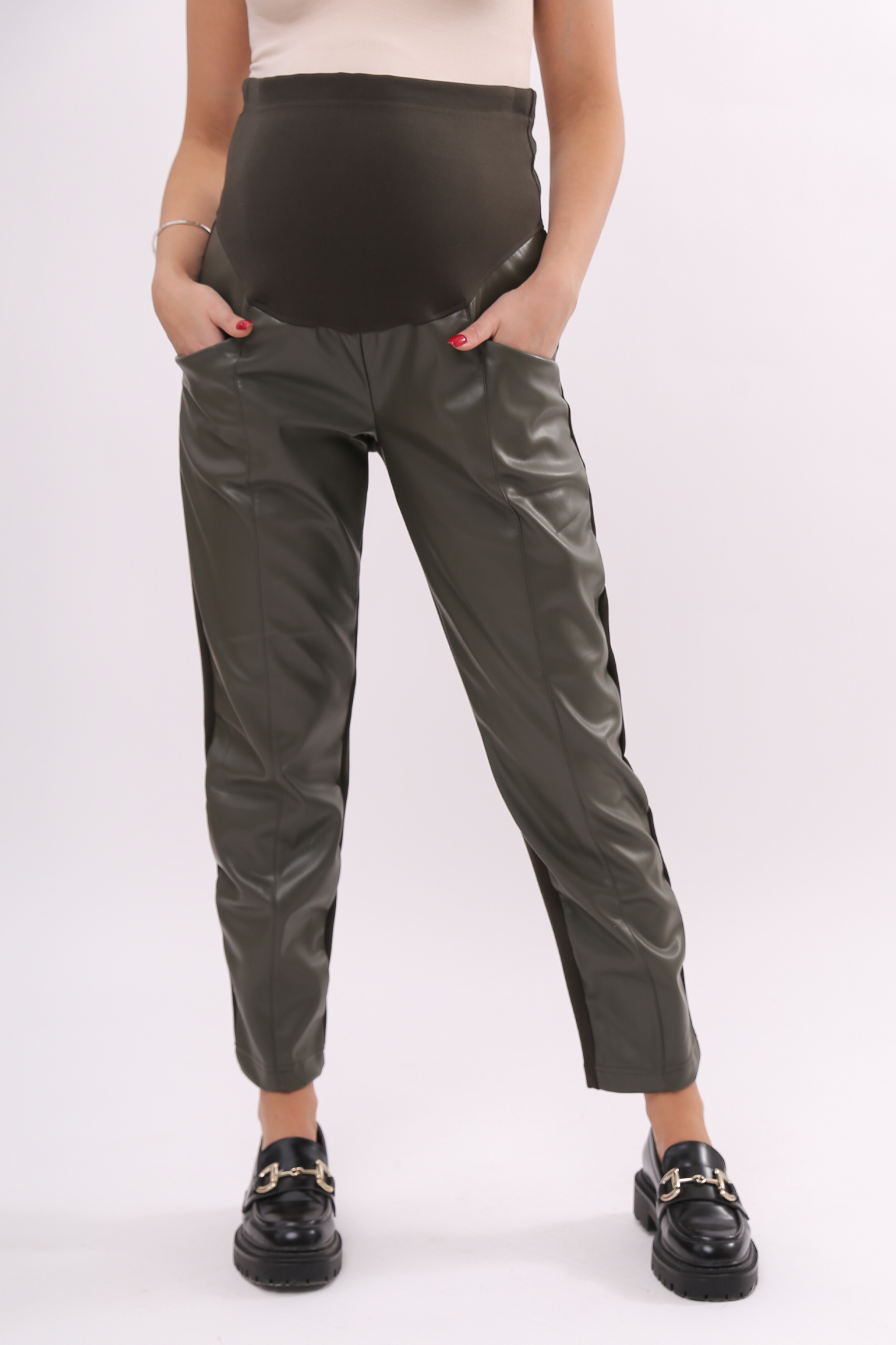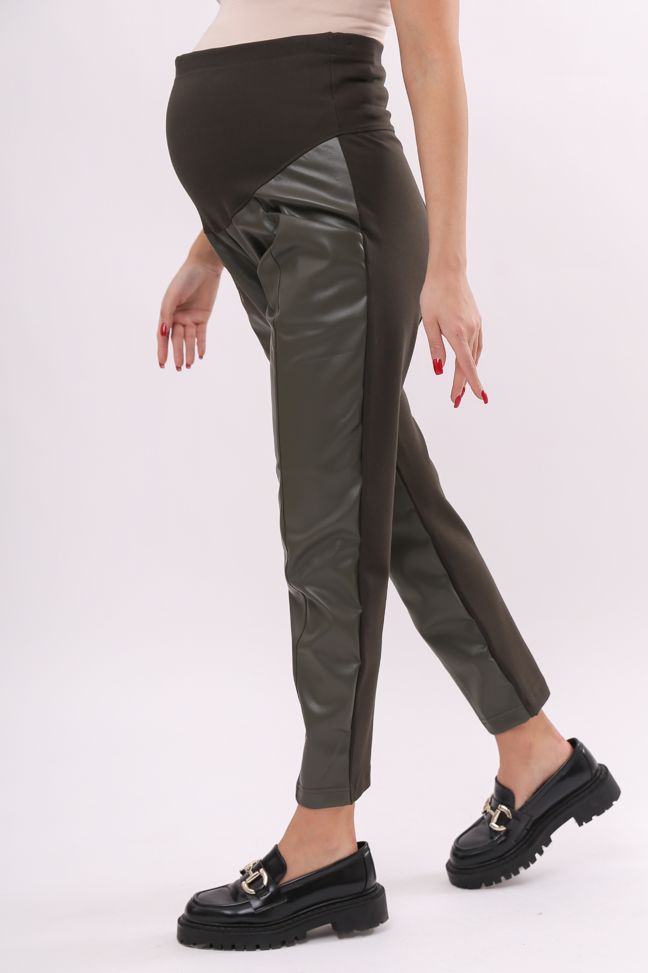 Модные зауженные брюки для беременных из качественной экокожи отлично впишутся в гардероб современной будущей мамы. Задняя часть штанов сшита из смесовой ткани на основе полиэстера и вискозы. Материал без начеса, мягкий и приятный на ощупь. Отличается хорошей износостойкостью, не покрывается катышками. Передняя сторона брюк выполнена из экокожи с эффектной полуматовой фактурой. Фасон модели бананы гармонично смотрится на любой фигуре, а высокая посадка с эластичным поясом обеспечивают комфорт на любом месяце беременности. Узкие брюки для беременных из экокожи подойдут для повседневного ношения весной, осенью и нежарким летом. Модель гармонично впишется в классический офисный образ, дополнит городской casual look, а при наличии пары ярких аксессуаров вполне может стать частью выходного наряда.