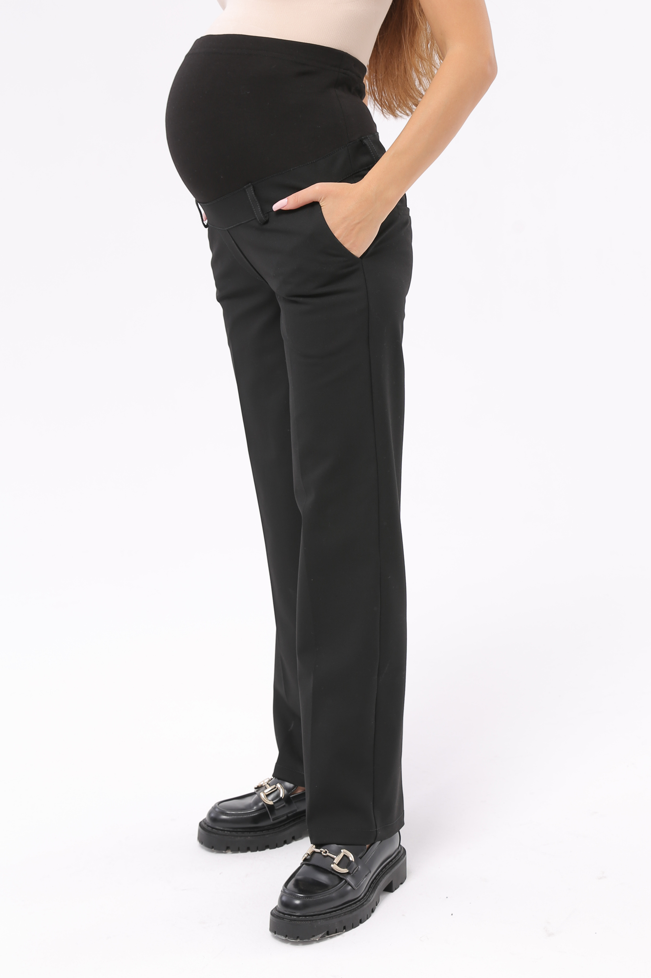 Классические брюки для беременных выполнены из твила, первосортной смесовой ткани на основе вискозы и полиэстера. Материал устойчив к износу, не сминается и не покрывается катышками при повседневной носке. Фасон штанов выдержан в духе офисной классики: прямой, в меру свободный крой, стандартная длина, прорезные карманы по бокам, шлевки для ремня. Брюки с высокой посадкой дополнены широким эластичным поясом со скрытой регулировкой объема. Эта деталь позволяет с комфортом носить штаны на любом месяце беременности и после родов. Стильные классические брюки можно надевать каждый день в офис, как часть casual образа, а в сочетании с элегантной блузой и аксессуарами выбрать в качестве праздничного наряда. Базовая черная расцветка универсальна, легко комбинируется с женской одеждой любого оттенка.
