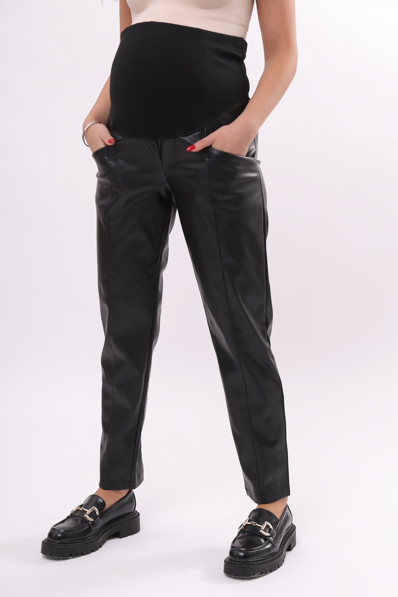 Ультрамодные зауженные брюки для беременных с отстроченными стрелками из комбинированных тканей. Брюки выполнены из экокожи. На брюках стрейч мягкий высокий трикотажный бандаж со скрытой регулировкой объема. Идеальная посадка на всем протяжении беременности и после родов. Универсальные штаны могут стать частью повседневного образа или офисного лука. Базовая модель для офиса, праздника и просто на каждый день.
