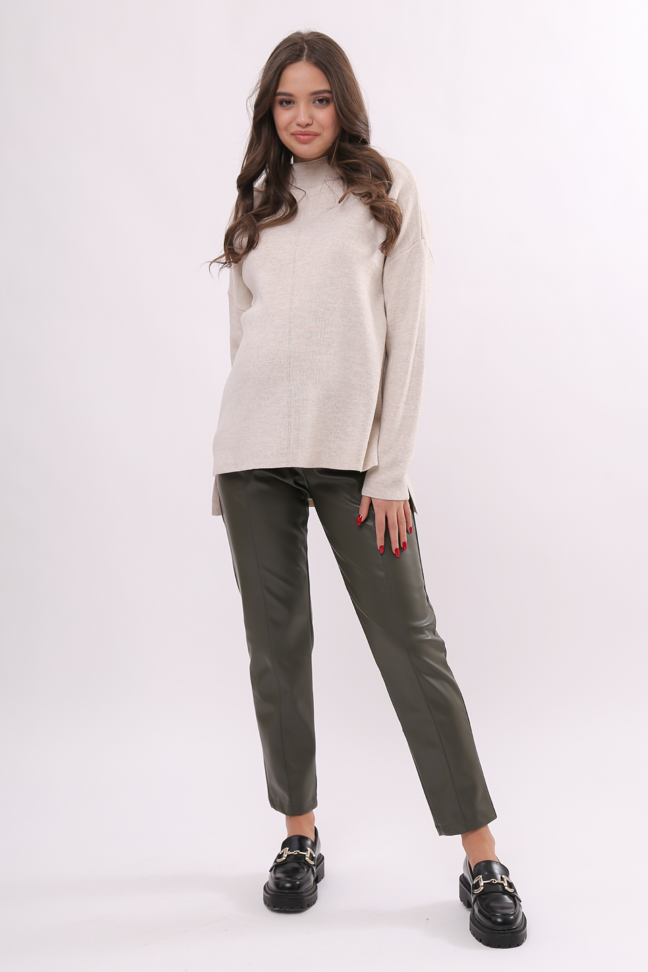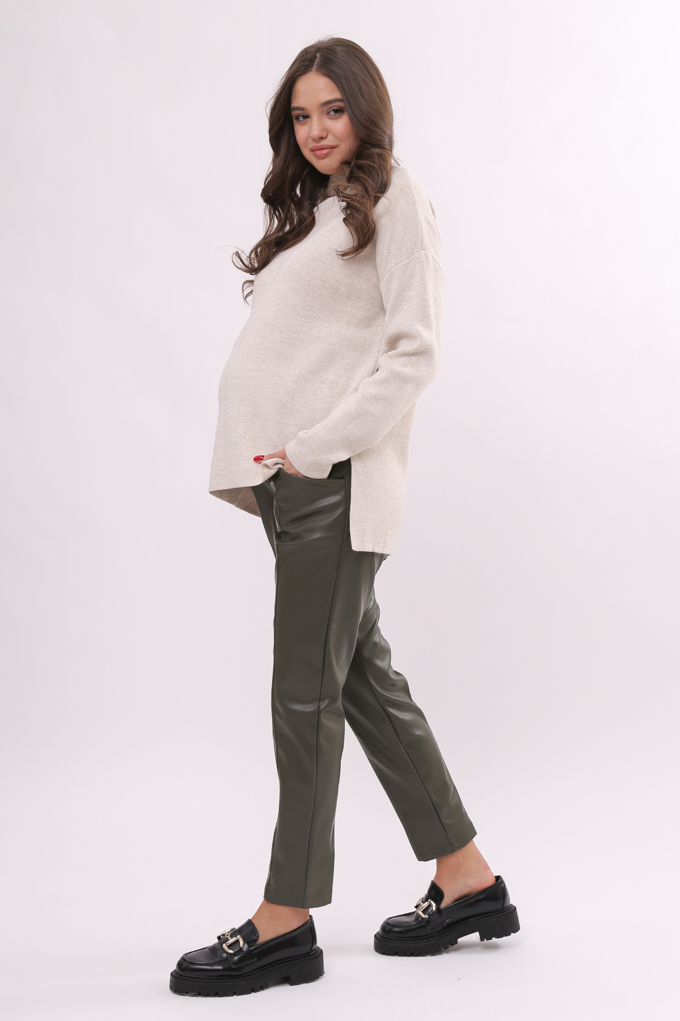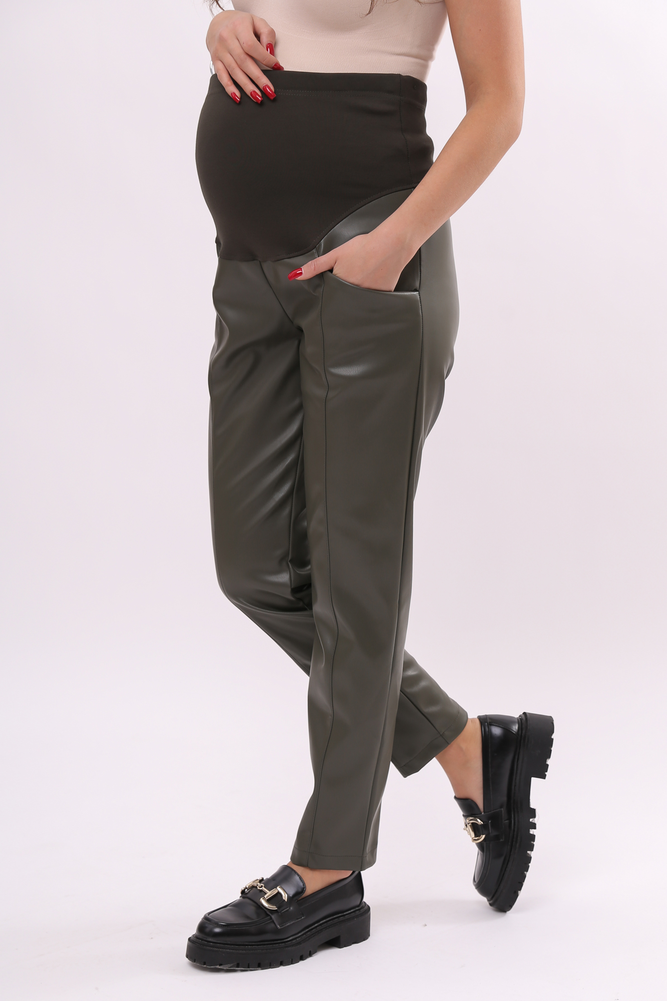 Ультрамодные зауженные брюки для беременных с отстроченными стрелками из комбинированных тканей. Брюки выполнены из экокожи. На брюках стрейч мягкий высокий трикотажный бандаж со скрытой регулировкой объема. Идеальная посадка на всем протяжении беременности и после родов. Универсальные штаны могут стать частью повседневного образа или офисного лука. Базовая модель для офиса, праздника и просто на каждый день.