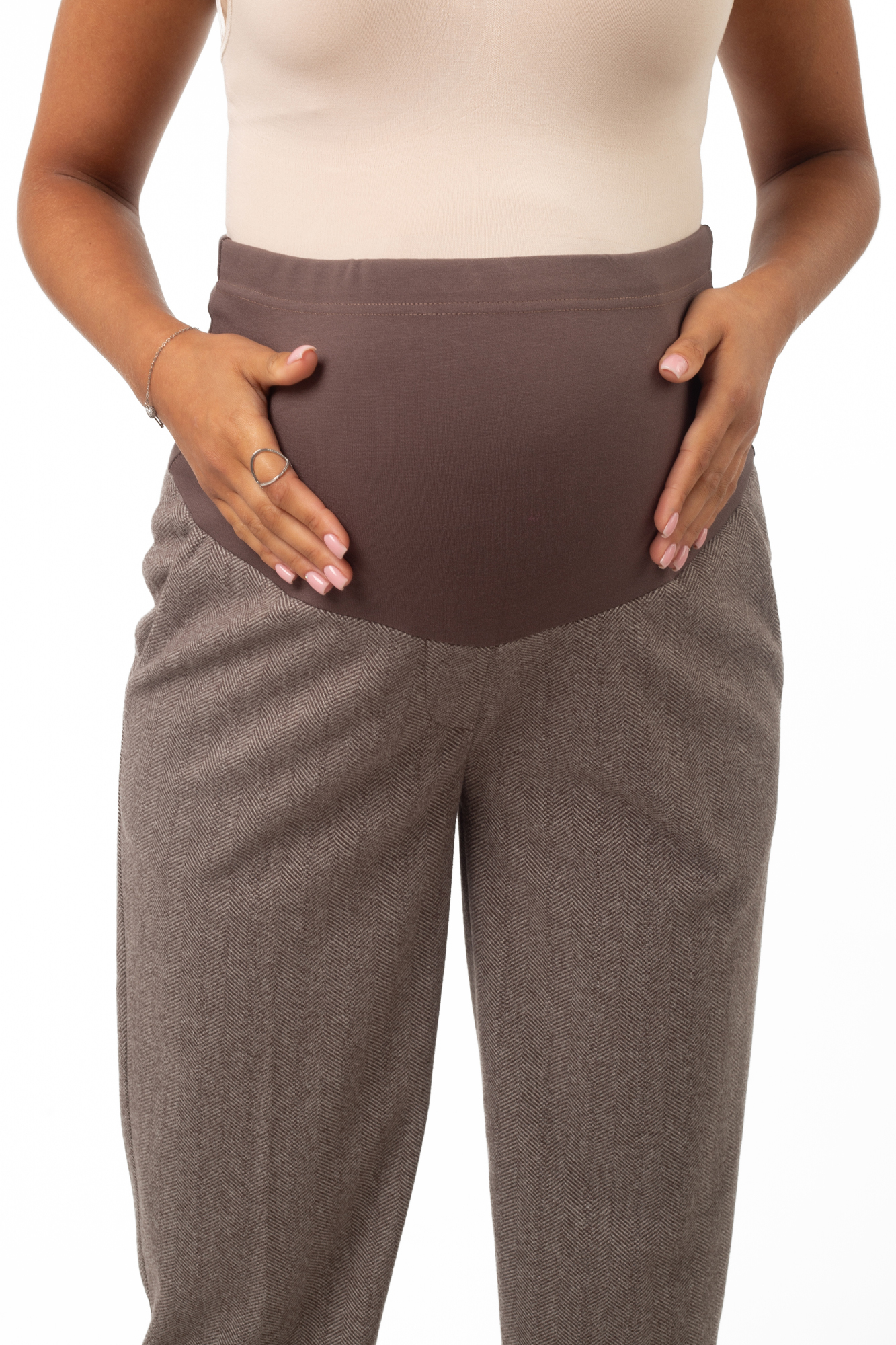 Стильные брюки для беременных - отличный вариант для офисного образа или просто на каждый день. Брюки выполнены из теплого премиального габардина на основе вискозы с добавлением лайкры. Свободный крой брюк-бананов подарит максимум комфорта в носке. Офисная модель с высоким эластичным бандажом подойдет для любого месяца беременности.