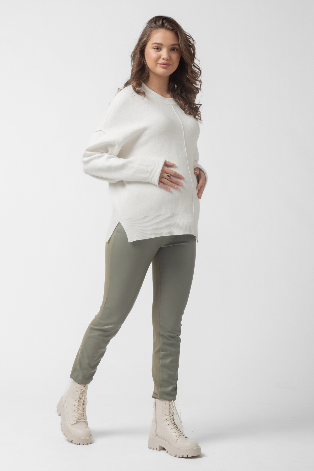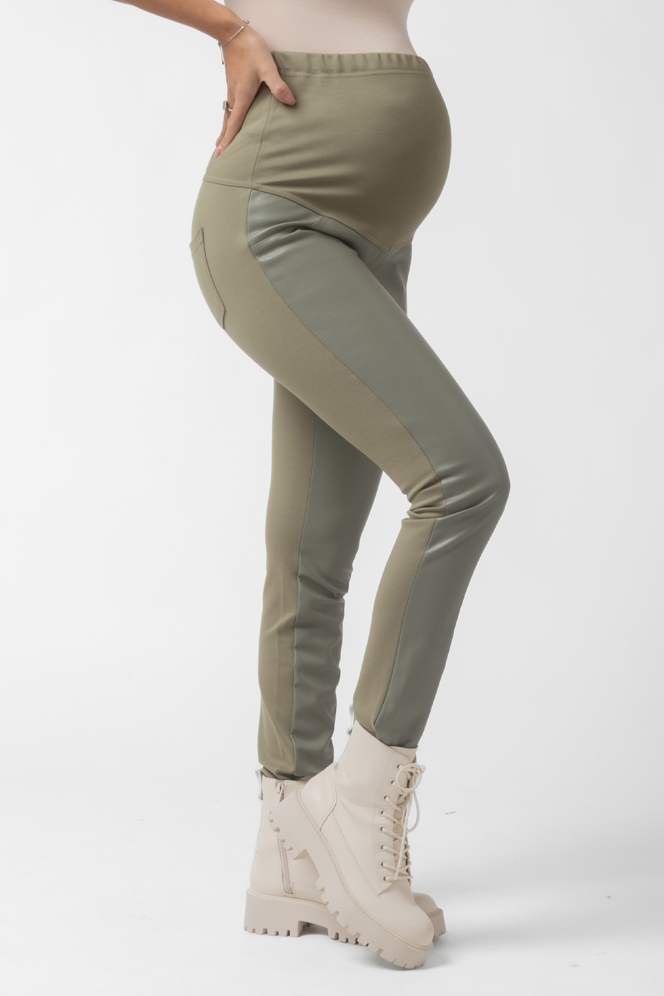 Ультрамодные брюки леггинсы для беременных из комбинированных тканей. Спереди изделие выполнено из экокожи, сзади - из плотного эластичного джерси. На брюках стрейч мягкий высокий трикотажный бандаж со скрытой регулировкой объема, накладные карманы, создающие эффект push up. Идеальная посадка на всем протяжении беременности и после родов. Универсальные штаны могут стать частью спортивного костюма или офисного лука. Базовая модель для спорта, офиса, праздника и просто на каждый день.