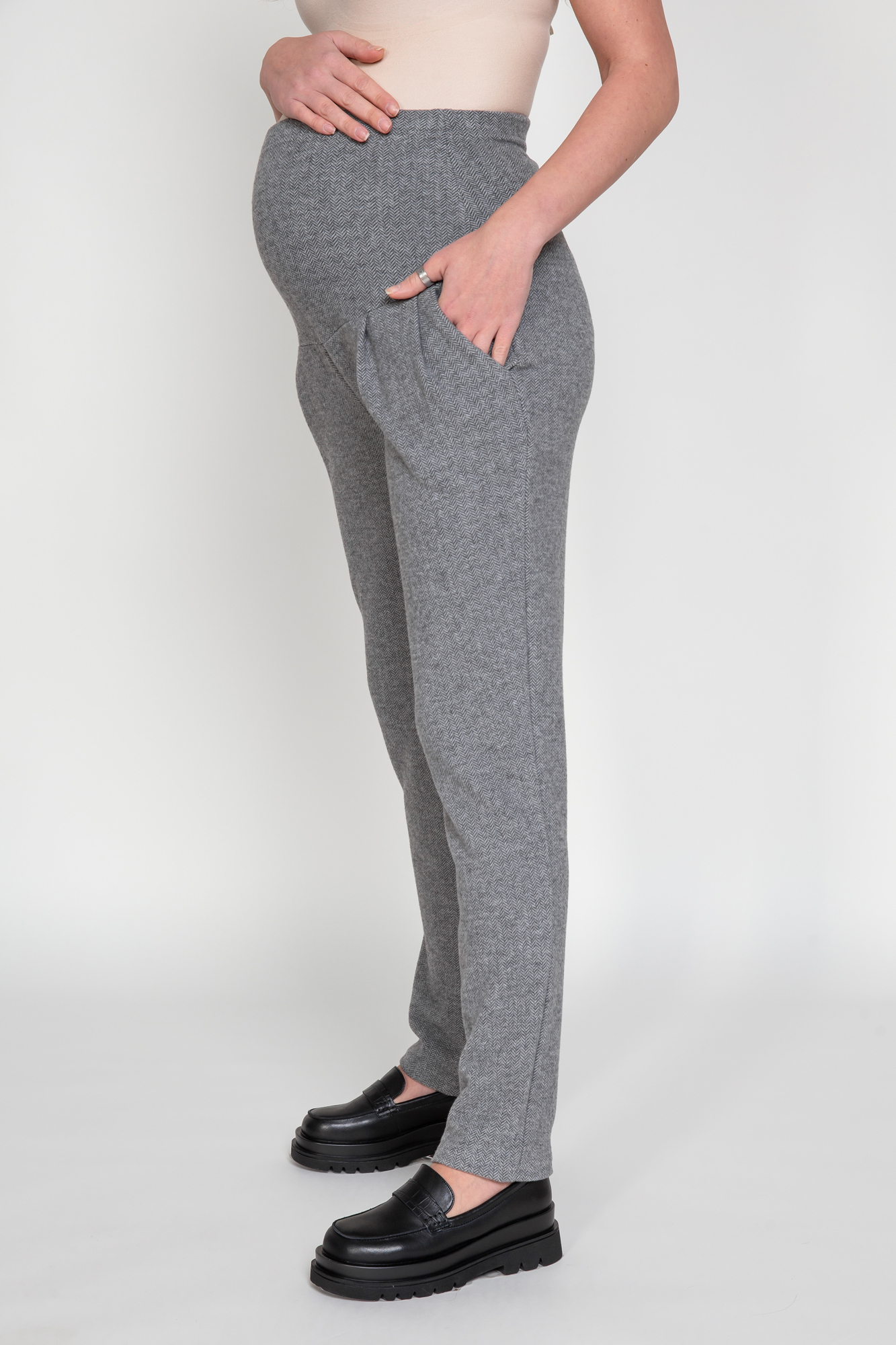Плотные трикотажные брюки в стиле casual для беременных. Детали: высокий эластичный бандаж, скошенные боковые карманы. Объем регулируется с помощью перфорированной резинки, перестегивающейся на пуговицу, продетой в верхнюю часть изделия. Мягкий материал подарит тепло и уют будущей маме и малышу.