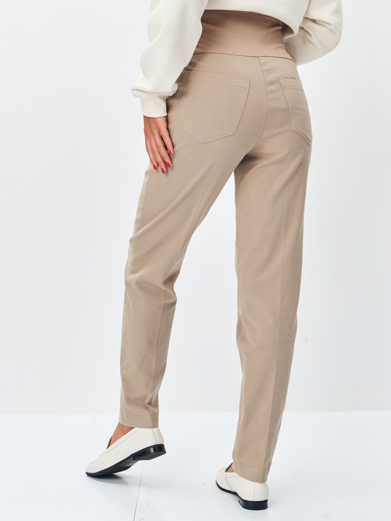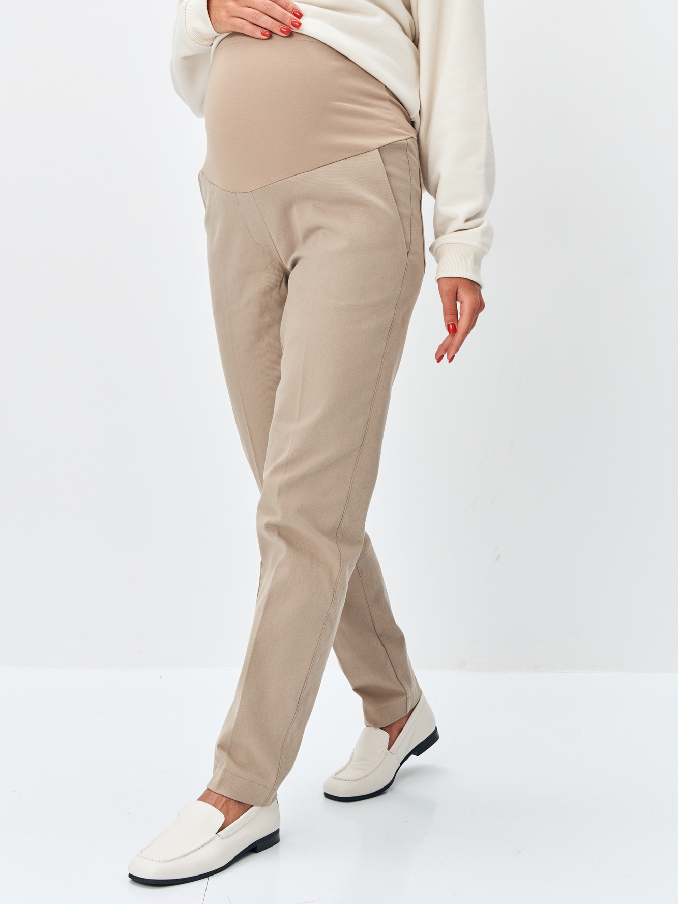 Брюки для беременных сшиты из премиальной плотной дышащей ткани на основе хлопка. В модели предусмотрен высокий эластичный пояс бандаж, обеспечивающий мягкую поддержку живота. Для регулировки объема добавлены потайные резинки на пуговице, поэтому штаны можно носить на любом месяце беременности и после нее. Вы сможете легко отрегулировать брюки по мере роста вашего животика, что делает их незаменимой вещью в вашем гардеробе. Универсальный всегда модный фасон и базовая расцветка брюк делают их удачным решением для повседневных прогулок или офиса. Так же с помощью дополнений и аксессуаров можно создать современный стильный повседневный образ. Брюки для будущих мам можно носить как прохладным летом, так и осенью.