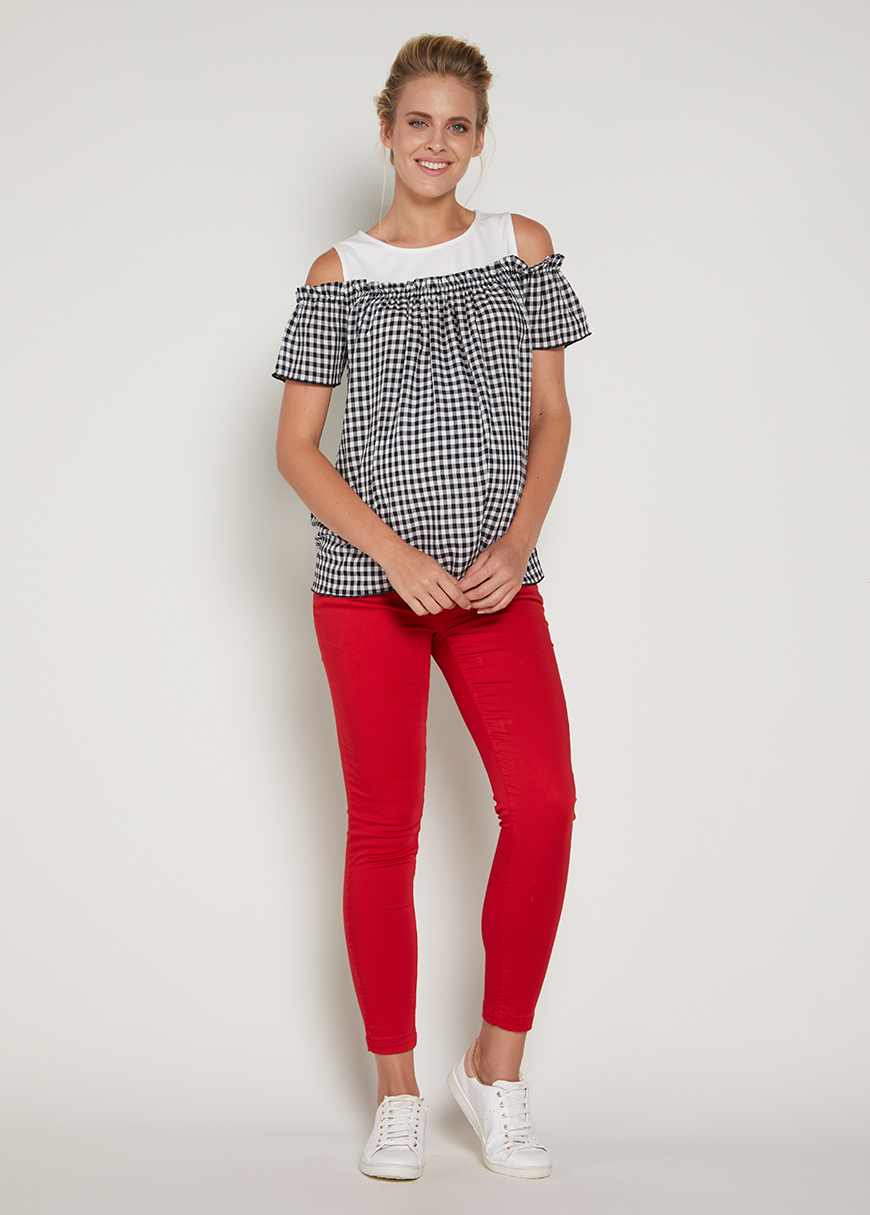 Модель зауженного кроя, средняя посадка без застёжки. Укороченные с подворотами. Детали: высокая трикотажная вставка для животика, два кармана спереди и два накладных кармана сзади, шлевки для ремня