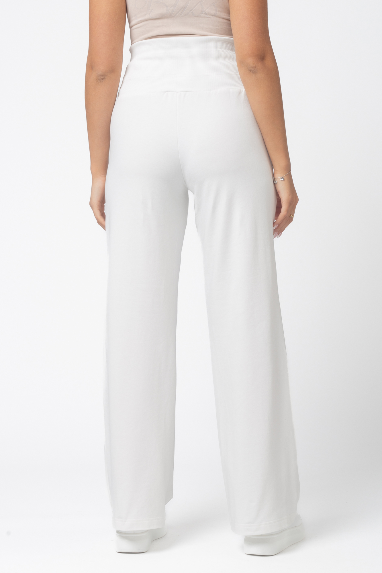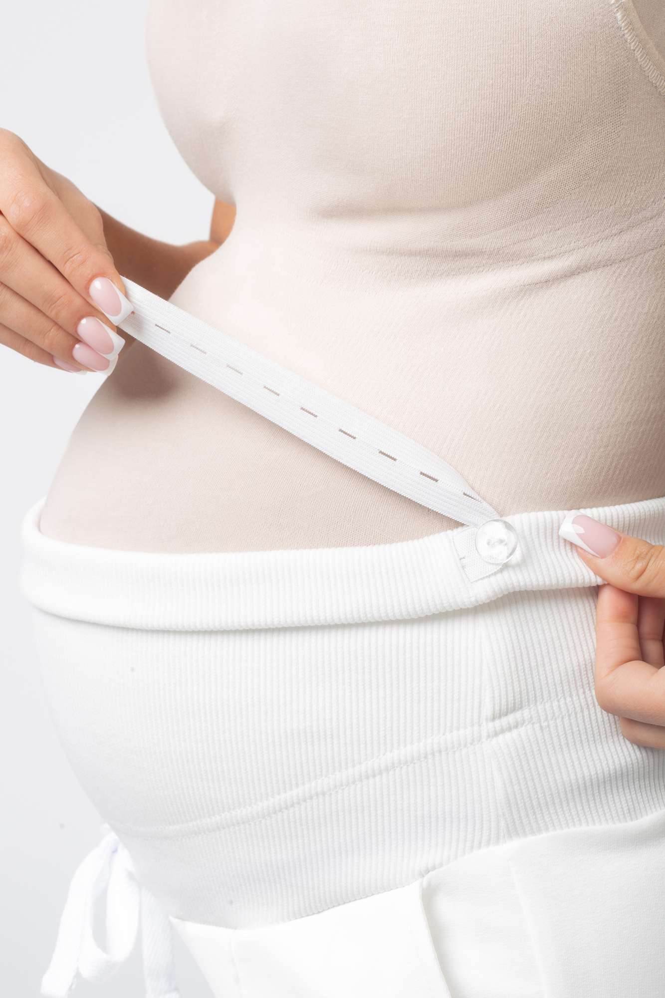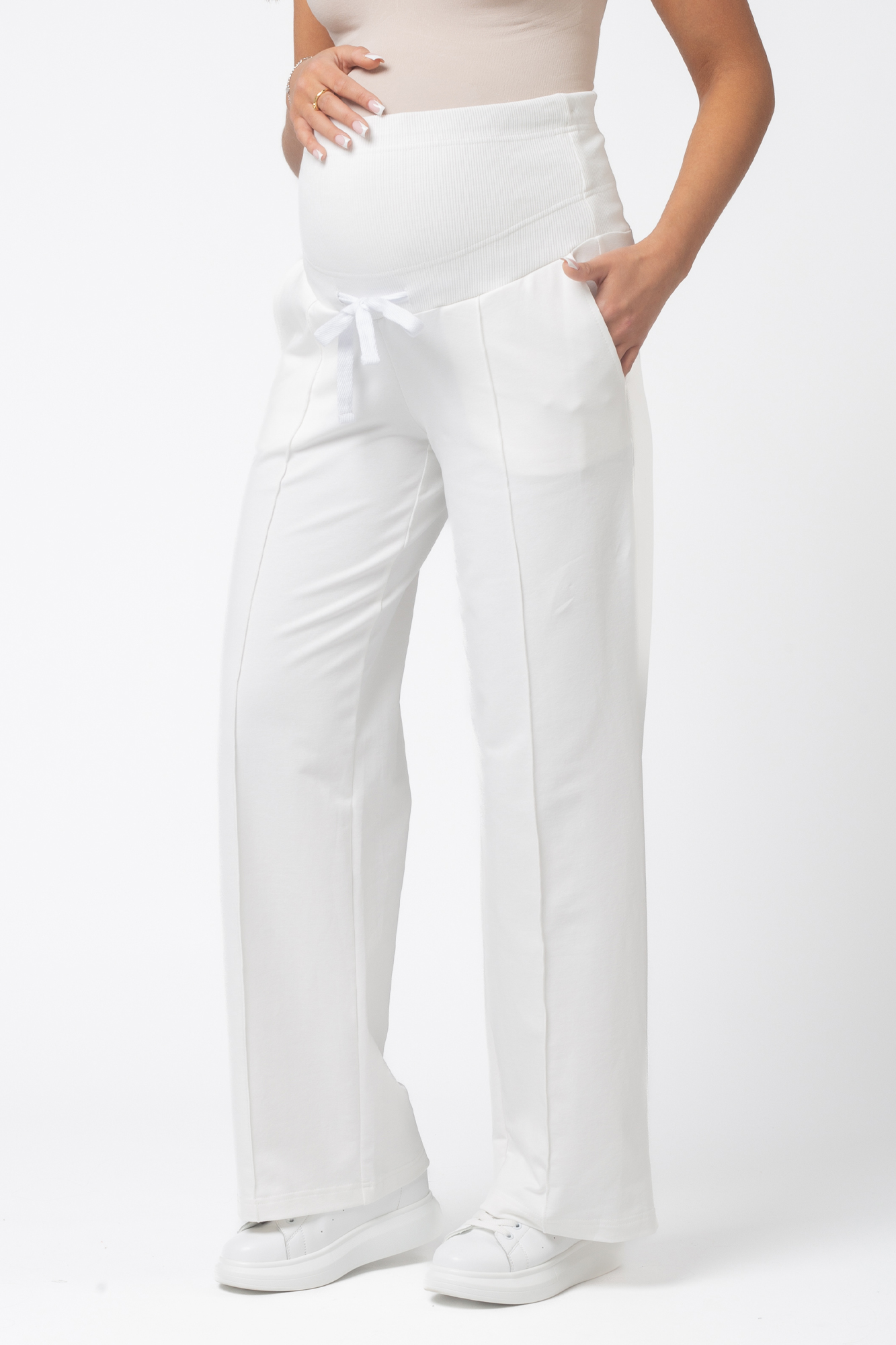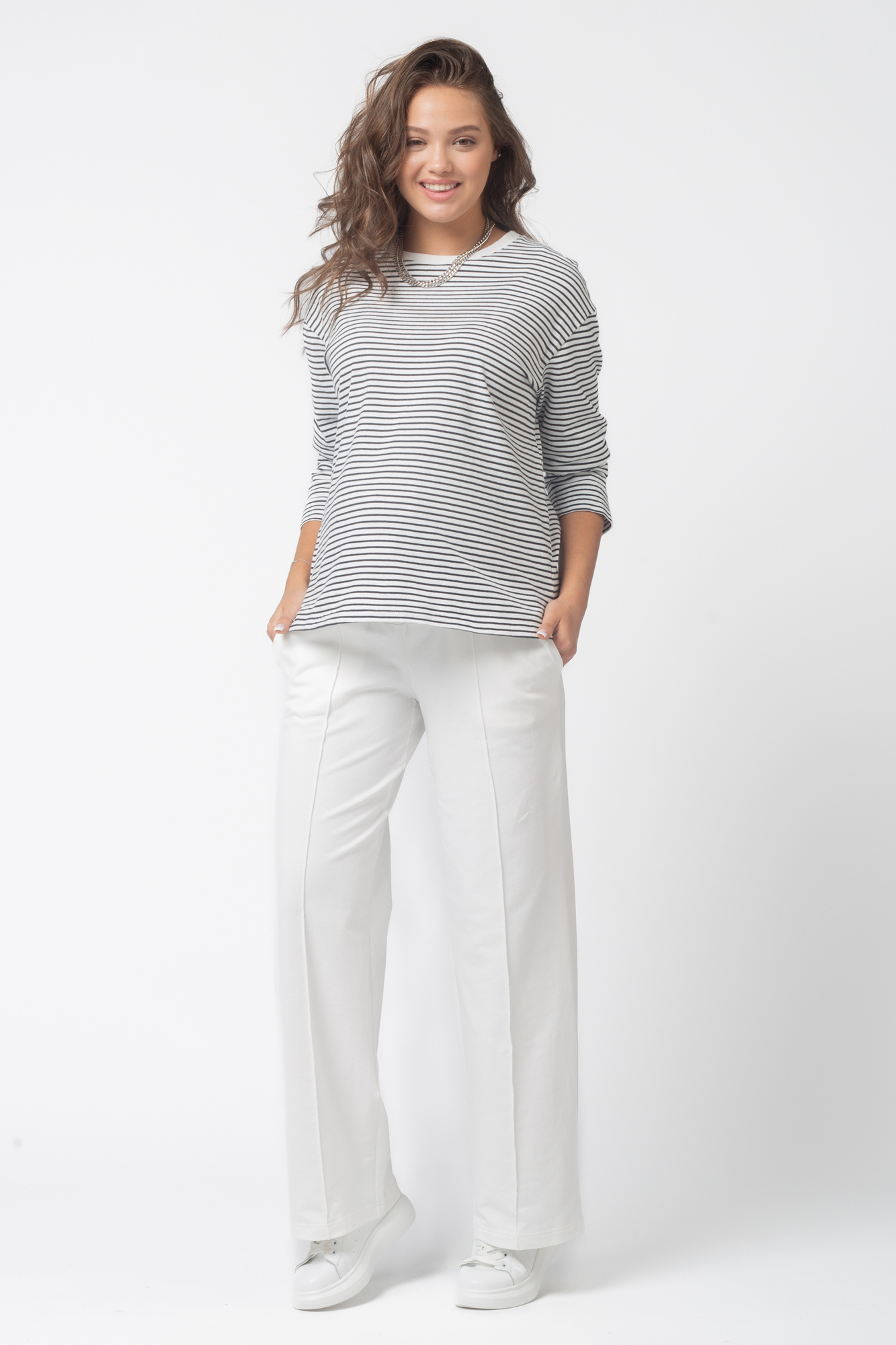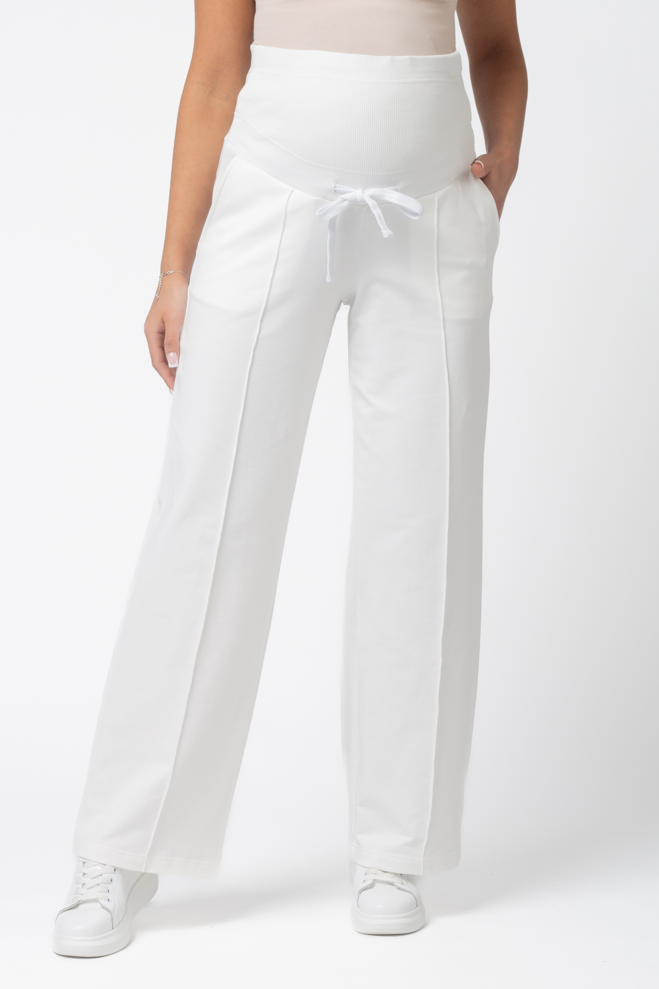Стильные повседневные брюки для беременных из высококачественного двухниточного футера. Высокий эластичный бандаж мягко и деликатно поддерживает растущий животик. Объем регулируется шнурками в поясе и перфорированной резинкой, перестегивающейся на пуговицу, что позволяет носить брюки от начала до конца беременности и после родов. Изделие декорировано отстроченными стрелками. Невероятно комфортная модель для прогулок, занятий спортом и просто на каждый день.