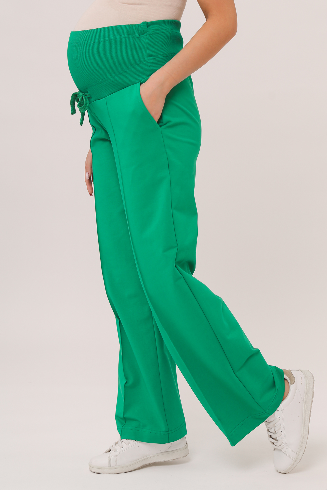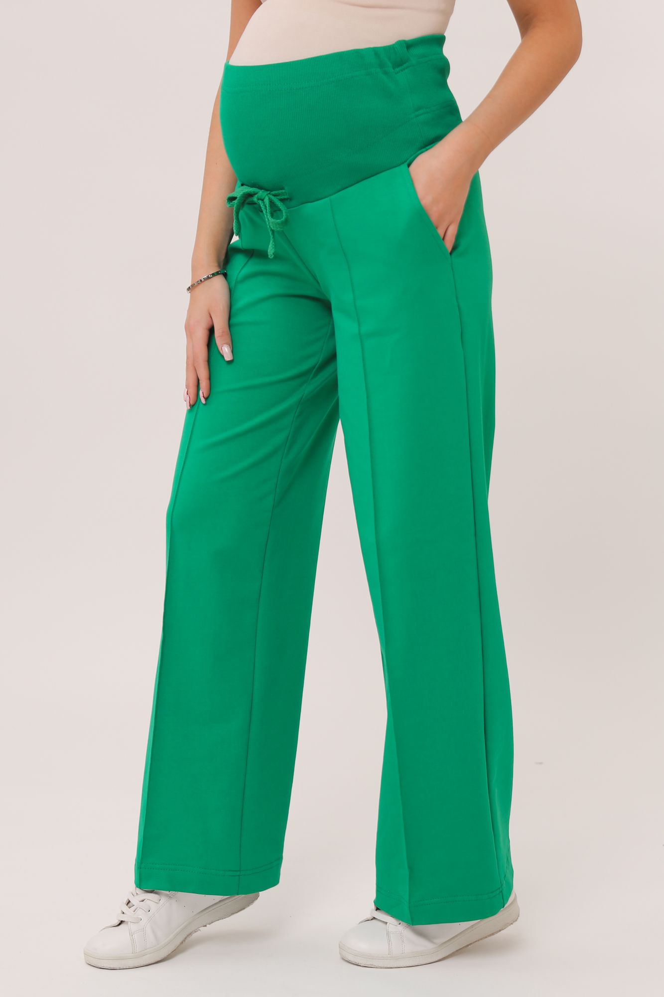 Стильные повседневные брюки для беременных из высококачественного двухниточного футера. Высокий эластичный бандаж мягко и деликатно поддерживает растущий животик. Объем регулируется шнурками в поясе и перфорированной резинкой, перестегивающейся на пуговицу, что позволяет носить брюки от начала до конца беременности и после родов. Изделие декорировано отстроченными стрелками. Невероятно комфортная модель для прогулок, занятий спортом и просто на каждый день.