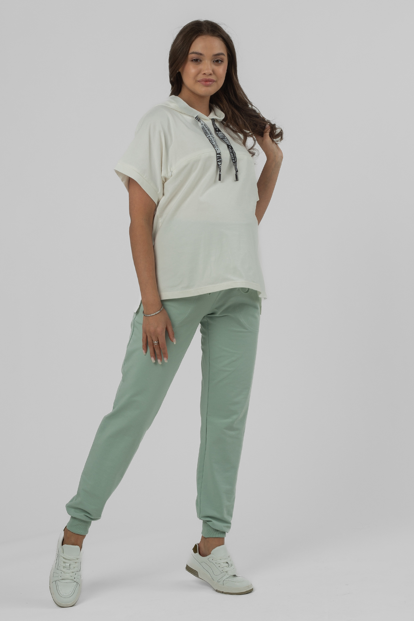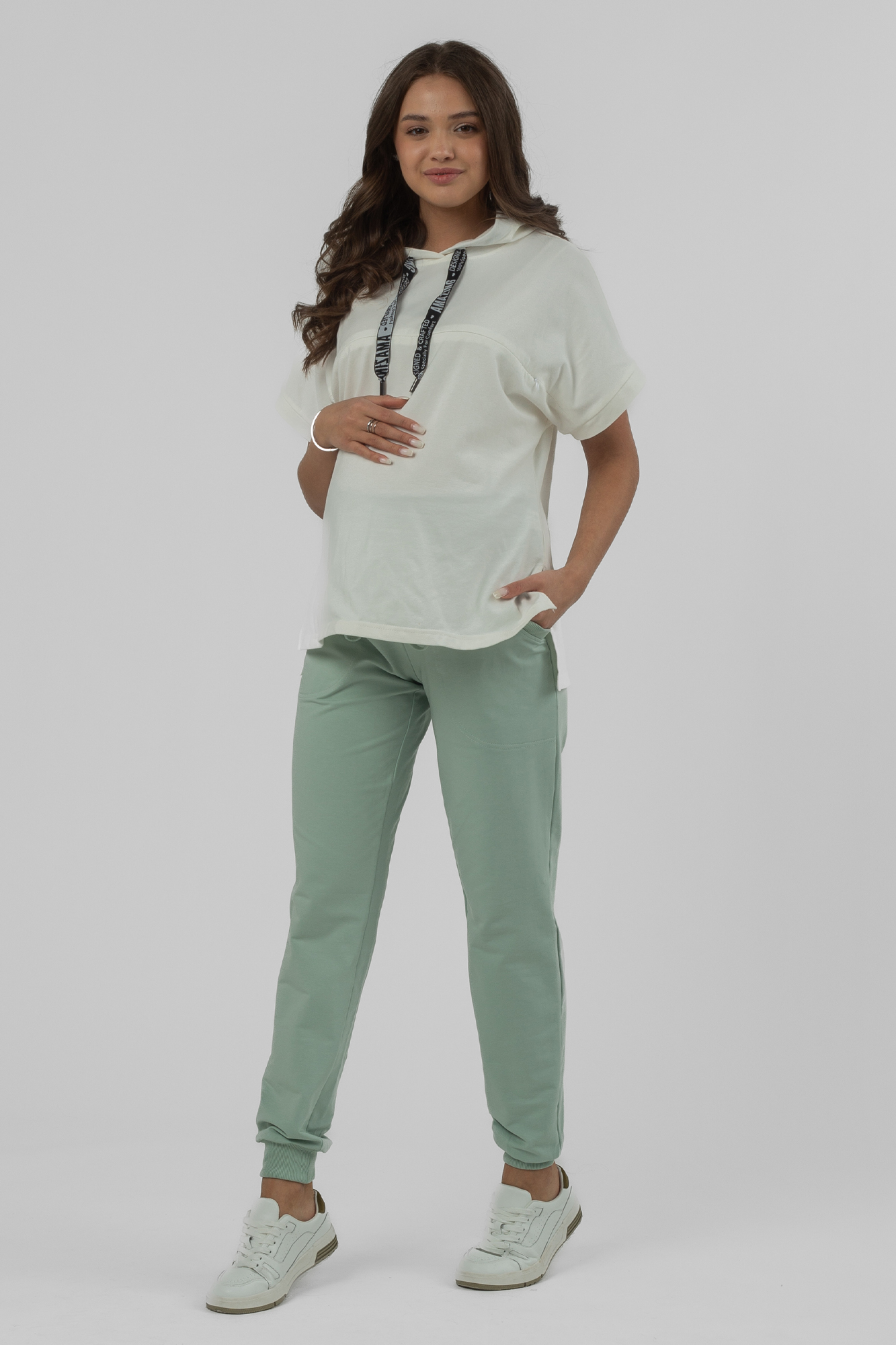 Спортивные брюки для беременных из двухниточного футера (пенье). Высокий эластичный бандаж мягко и деликатно поддерживает растущий животик. Объем регулируется шнурками в поясе и перфорированной резинкой, перестегивающейся на пуговицу, что позволяет носить брюки от начала до конца беременности и после родов. Длина регулируется подворотом брючины и подходит на любой рост. Невероятно комфортная модель для прогулок, занятий спортом и просто на каждый день.