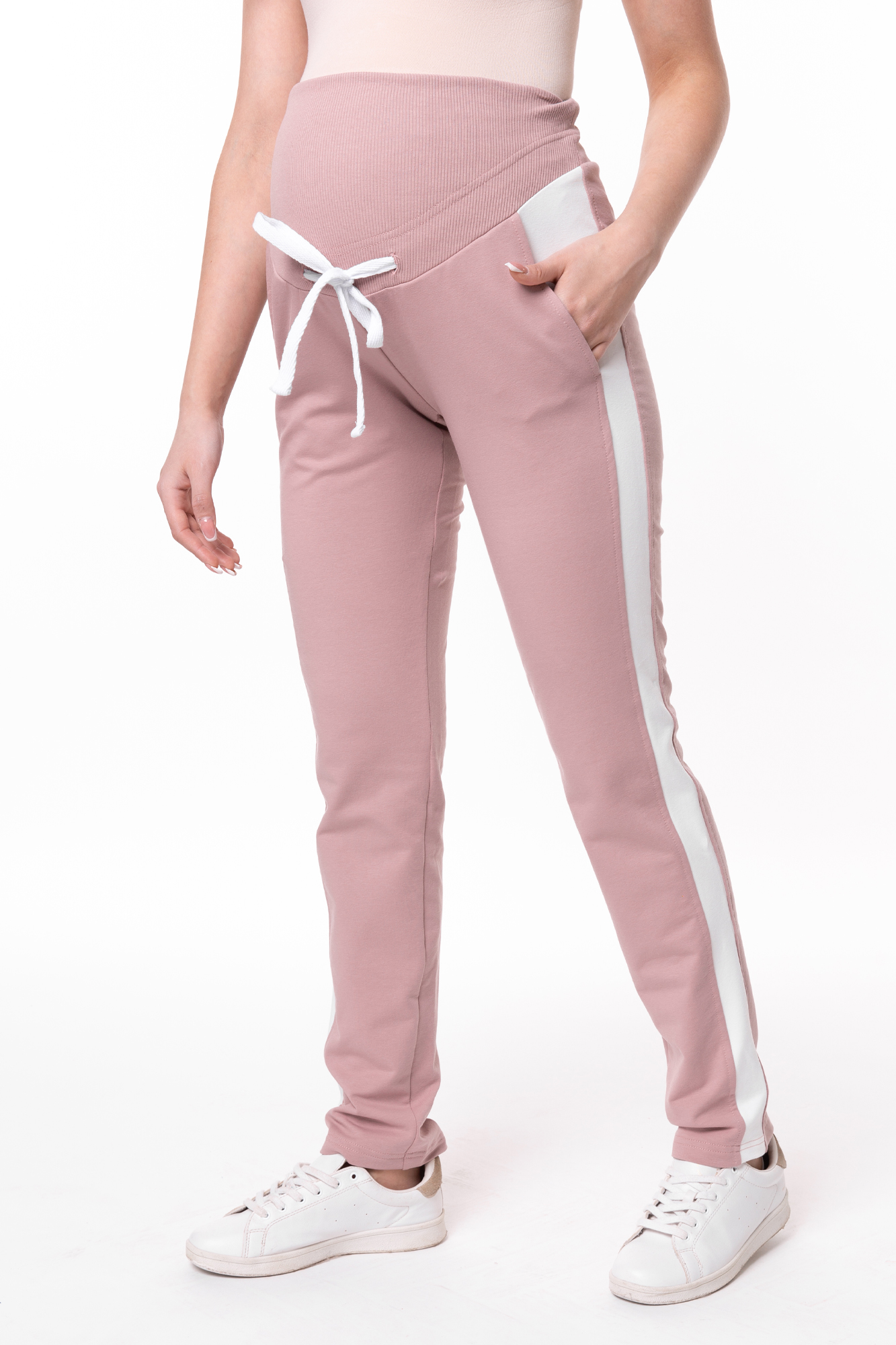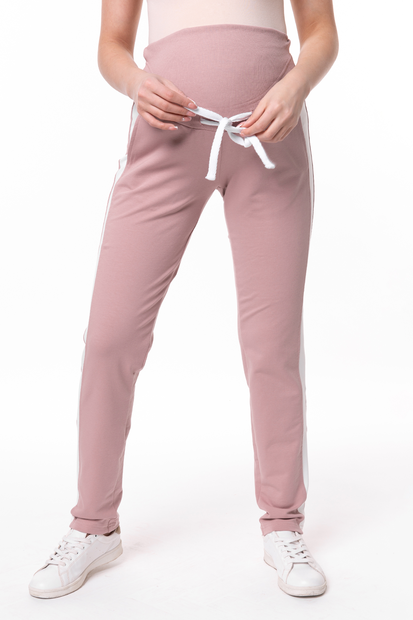 Зауженные спортивные брюки из двухниточного футера для беременных. Детали: высокий эластичный бандаж, лампасы и карманы по бокам изделия. Объем регулируется шнурками в поясе и перфорированной резинкой, перестегивающейся на пуговицу, что позволяет носить брюки от начала до конца беременности и после родов.