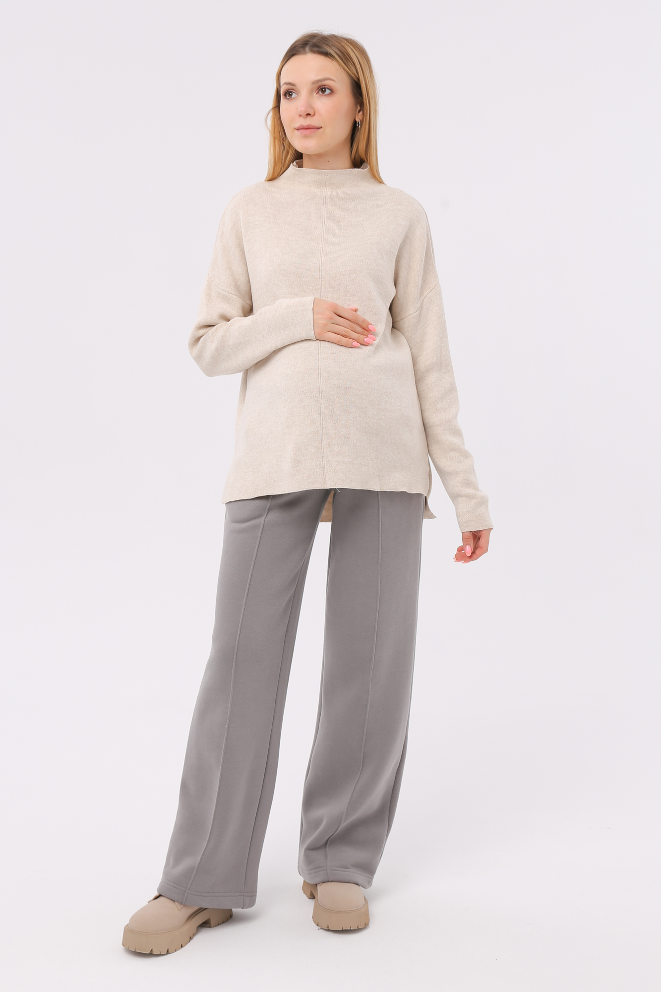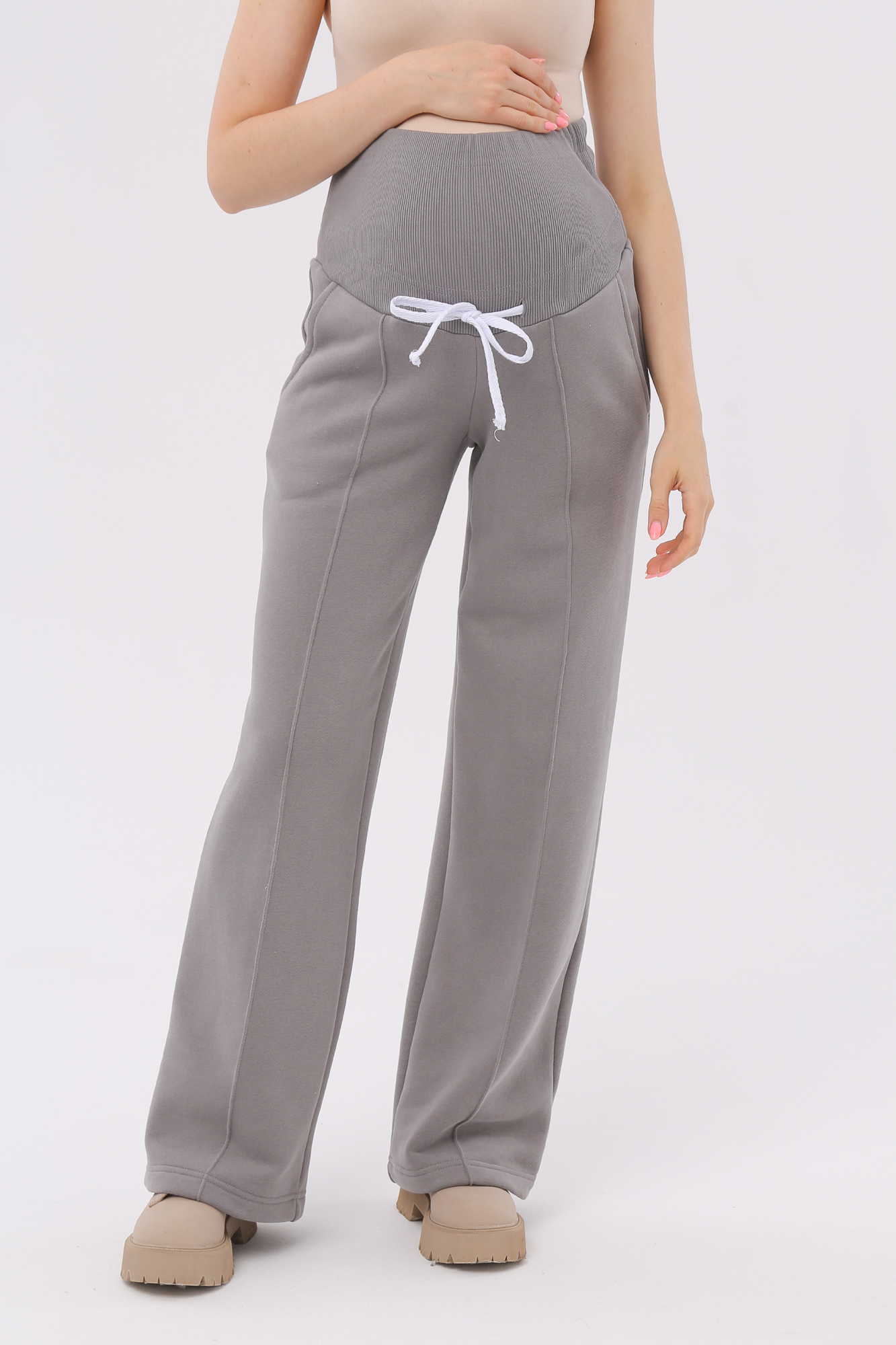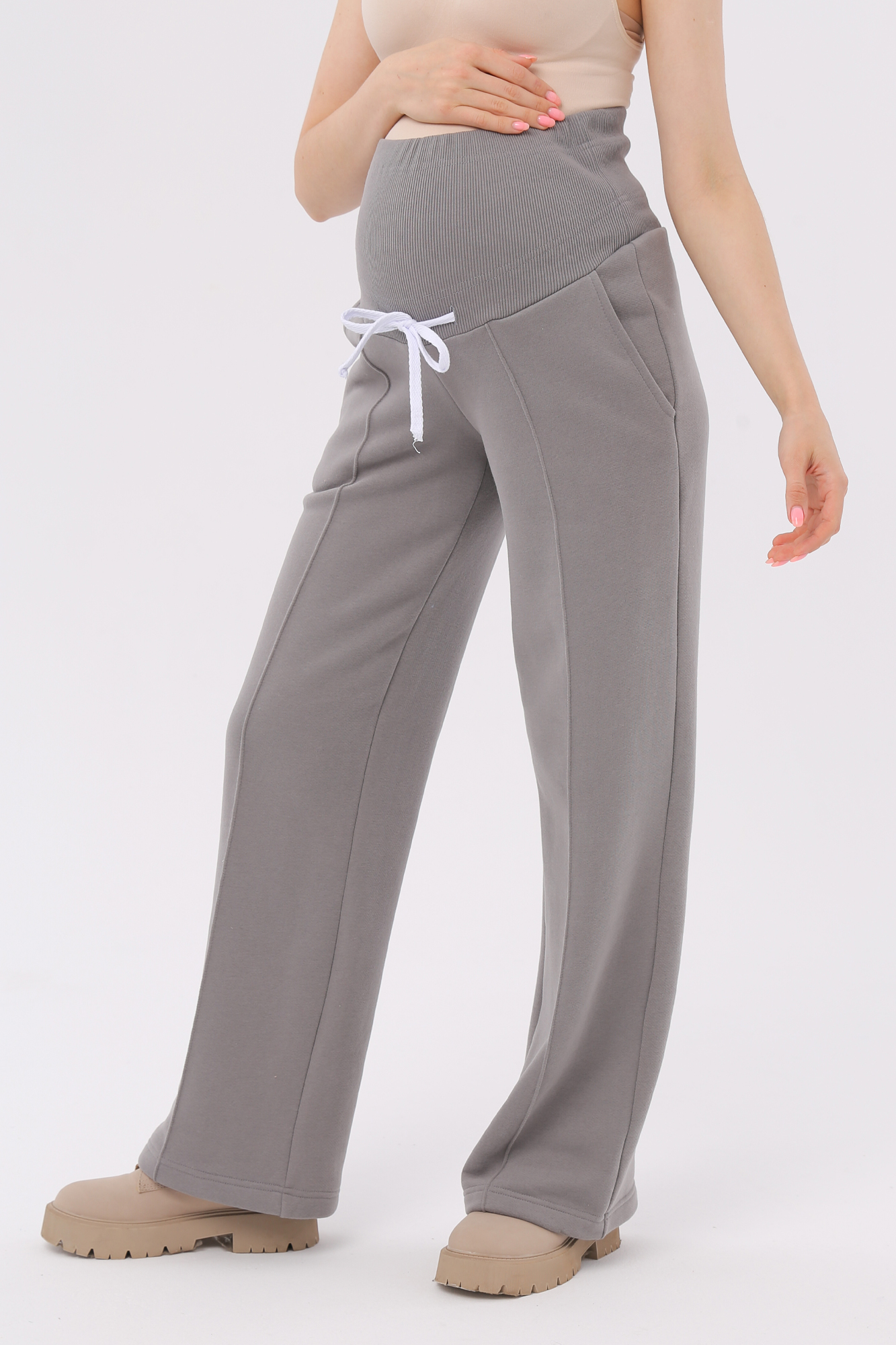 Стильные повседневные брюки для беременных из футера велюра c начесом. Высокий эластичный бандаж мягко и деликатно поддерживает растущий животик. Объем регулируется шнурками в поясе и перфорированной резинкой, перестегивающейся на пуговицу, что позволяет носить брюки от начала до конца беременности и после родов. Невероятно комфортная модель для прогулок, занятий спортом и просто на каждый день.