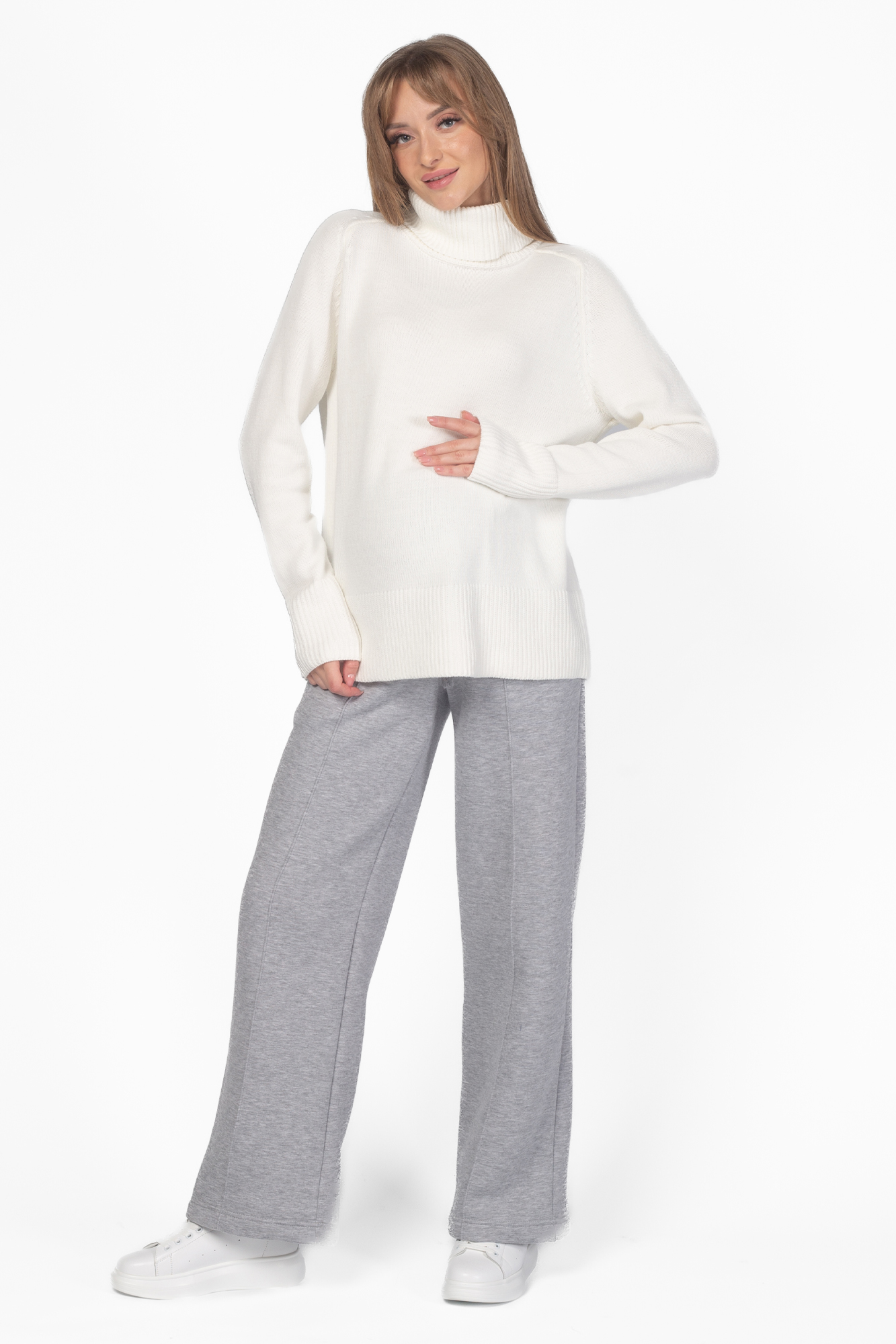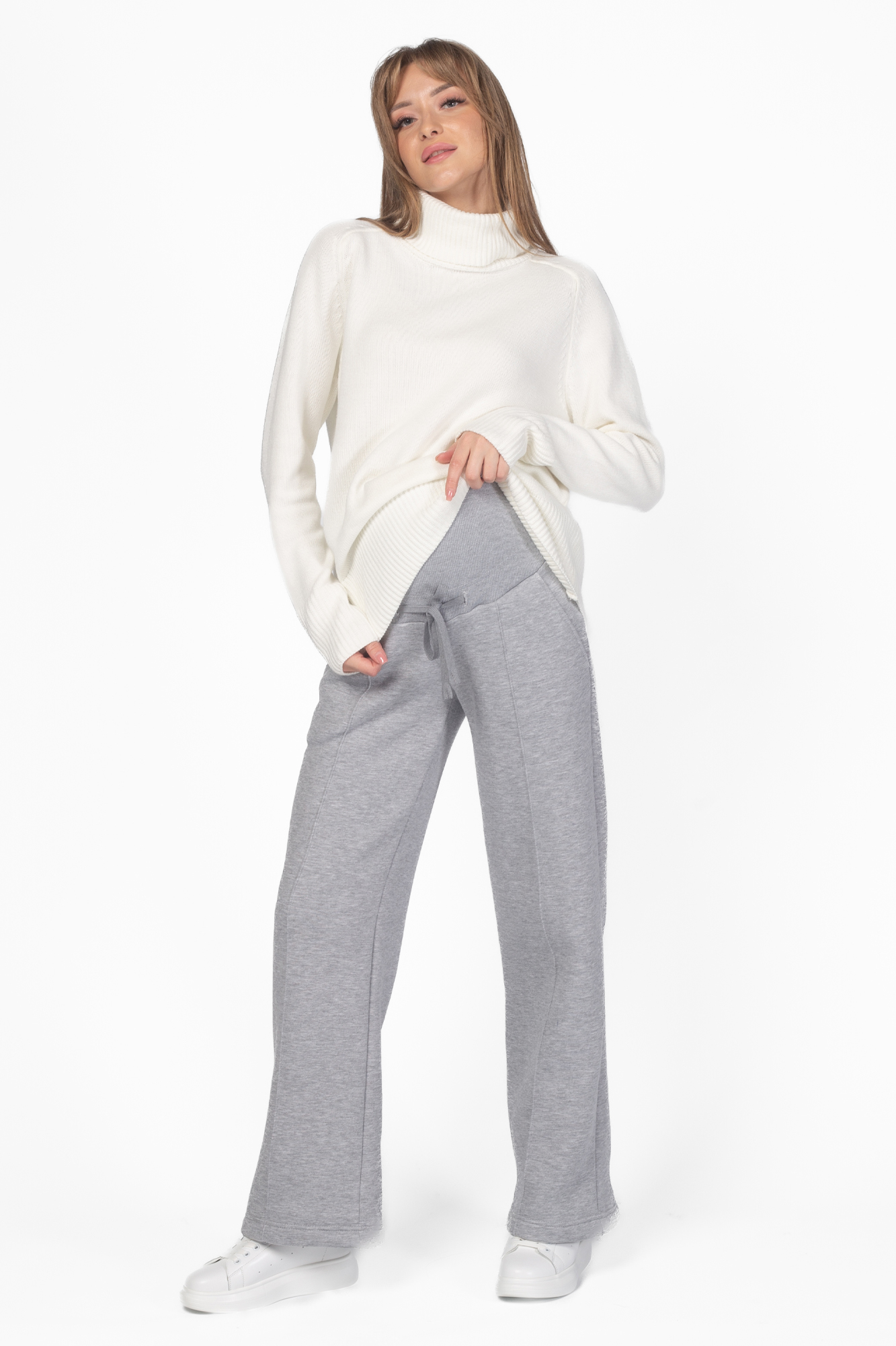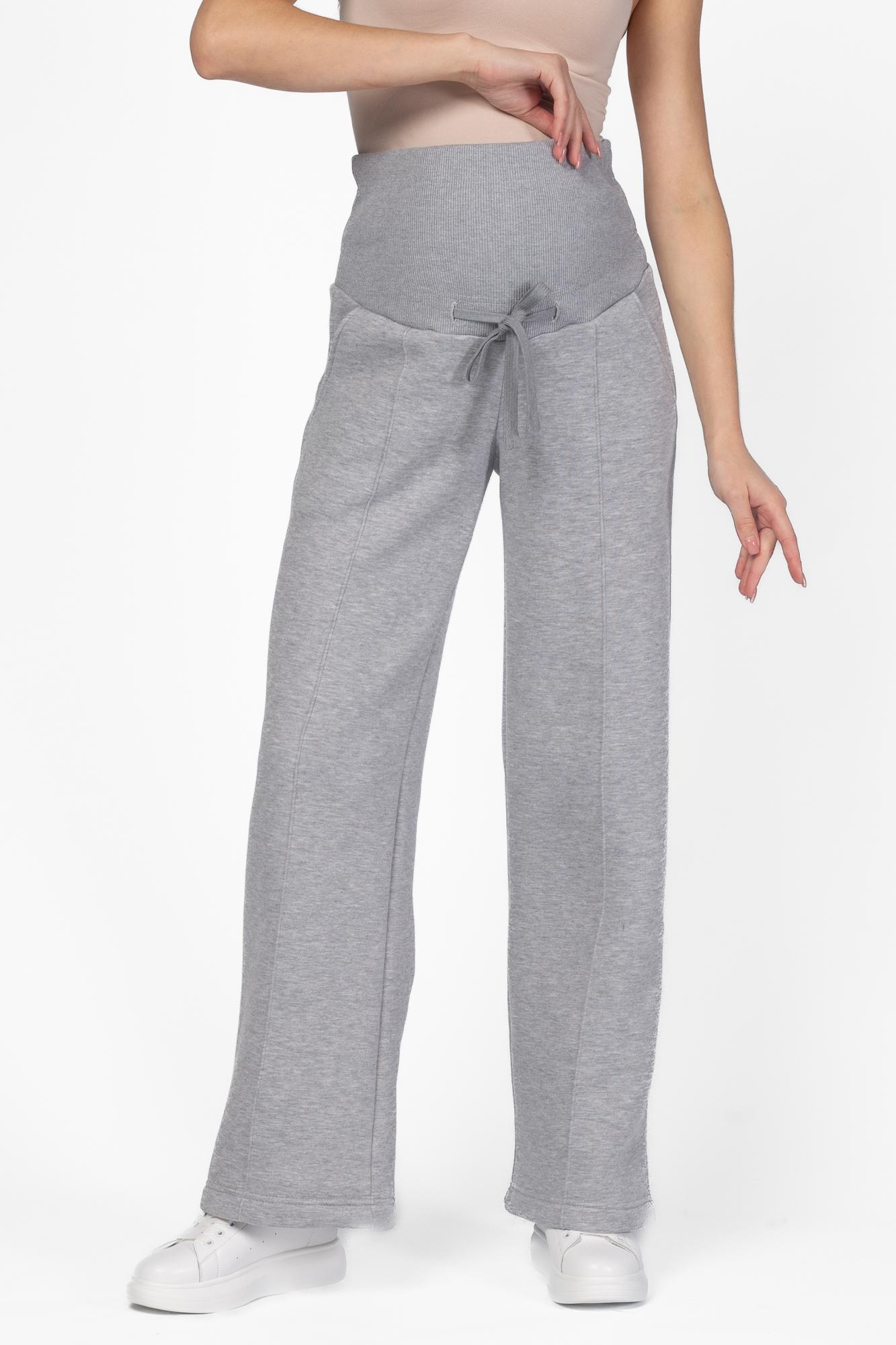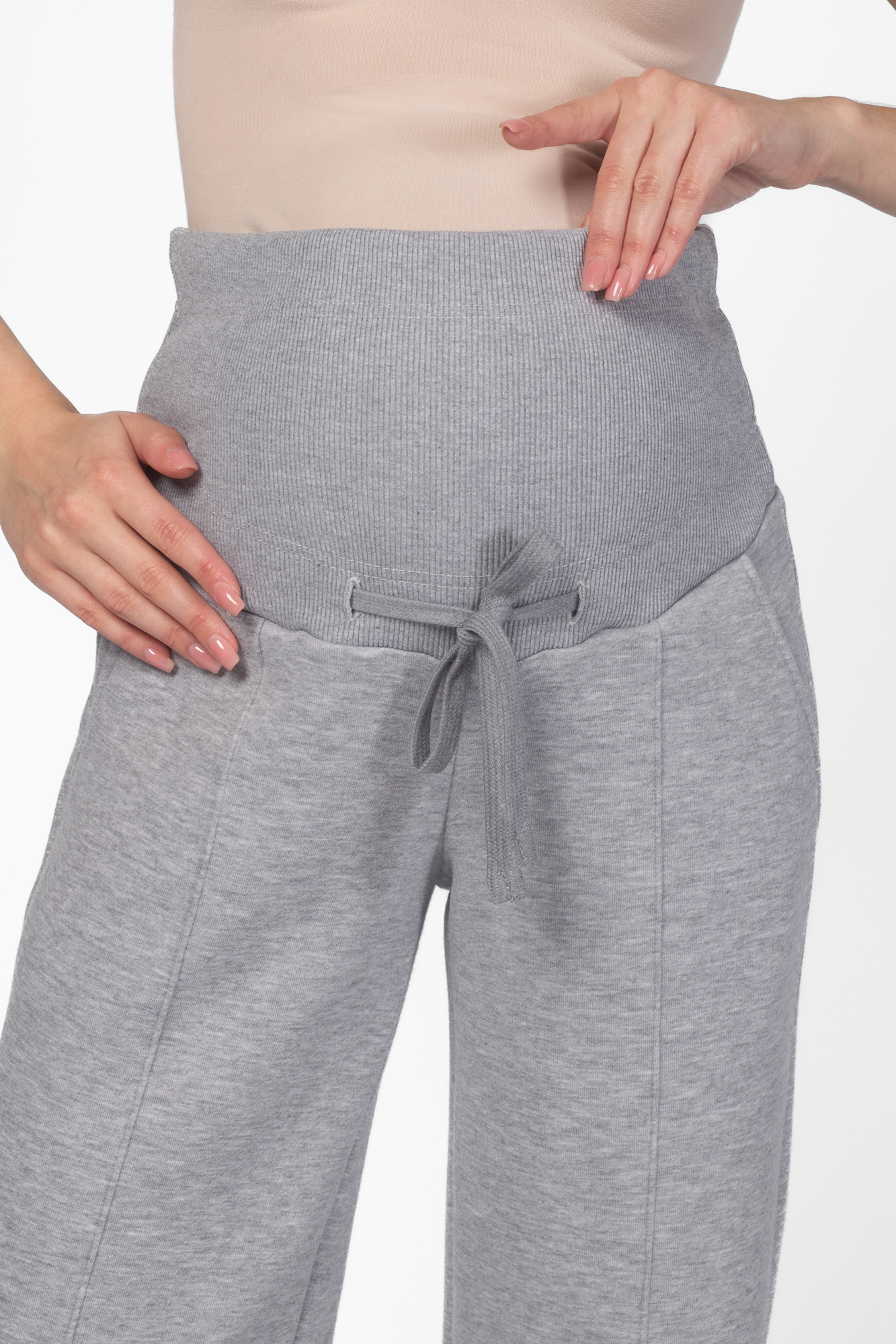 Стильные повседневные брюки для беременных из футера велюра c начесом. Высокий эластичный бандаж мягко и деликатно поддерживает растущий животик. Объем регулируется шнурками в поясе и перфорированной резинкой, перестегивающейся на пуговицу, что позволяет носить брюки от начала до конца беременности и после родов. Невероятно комфортная модель для прогулок, занятий спортом и просто на каждый день.