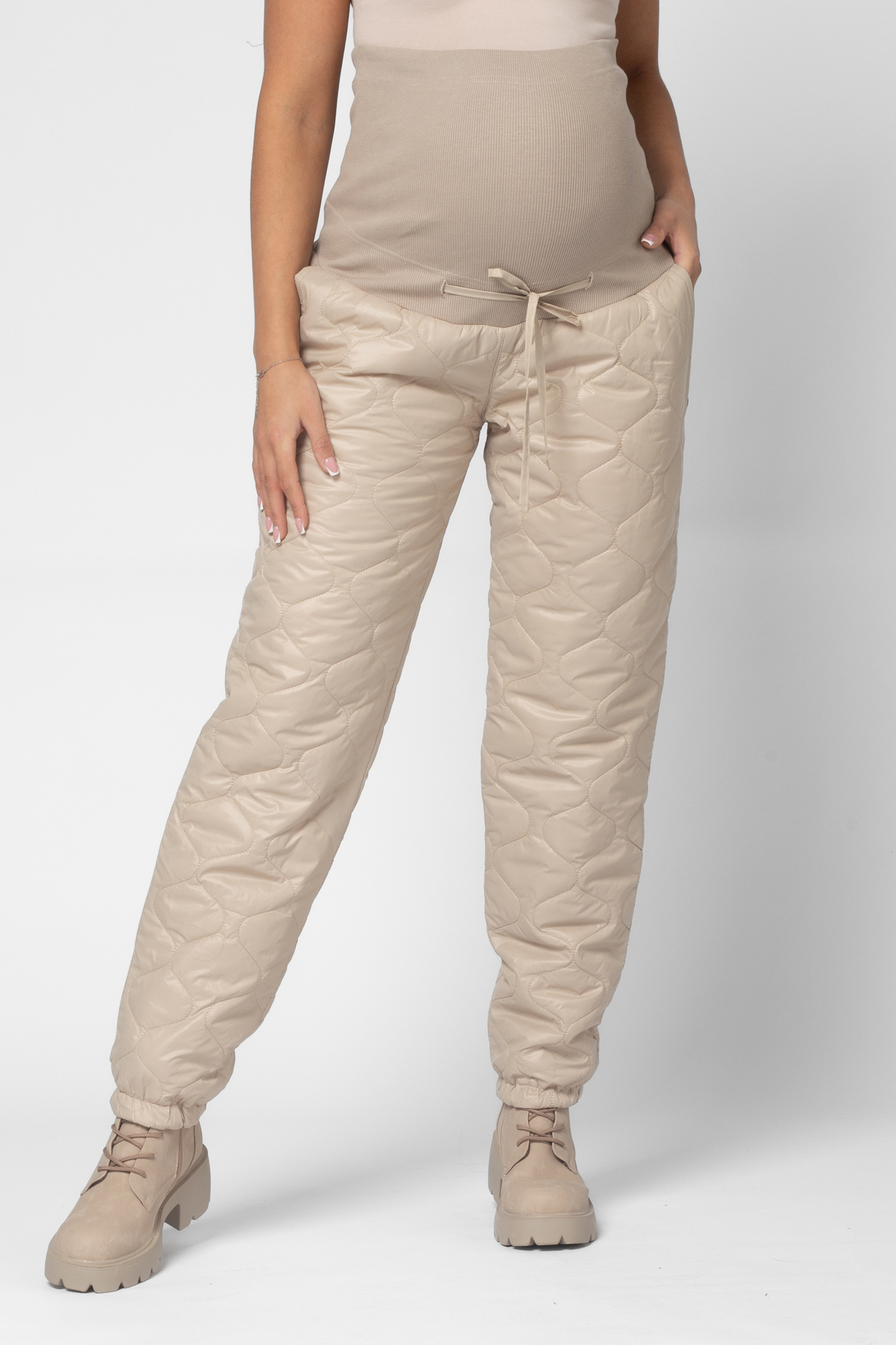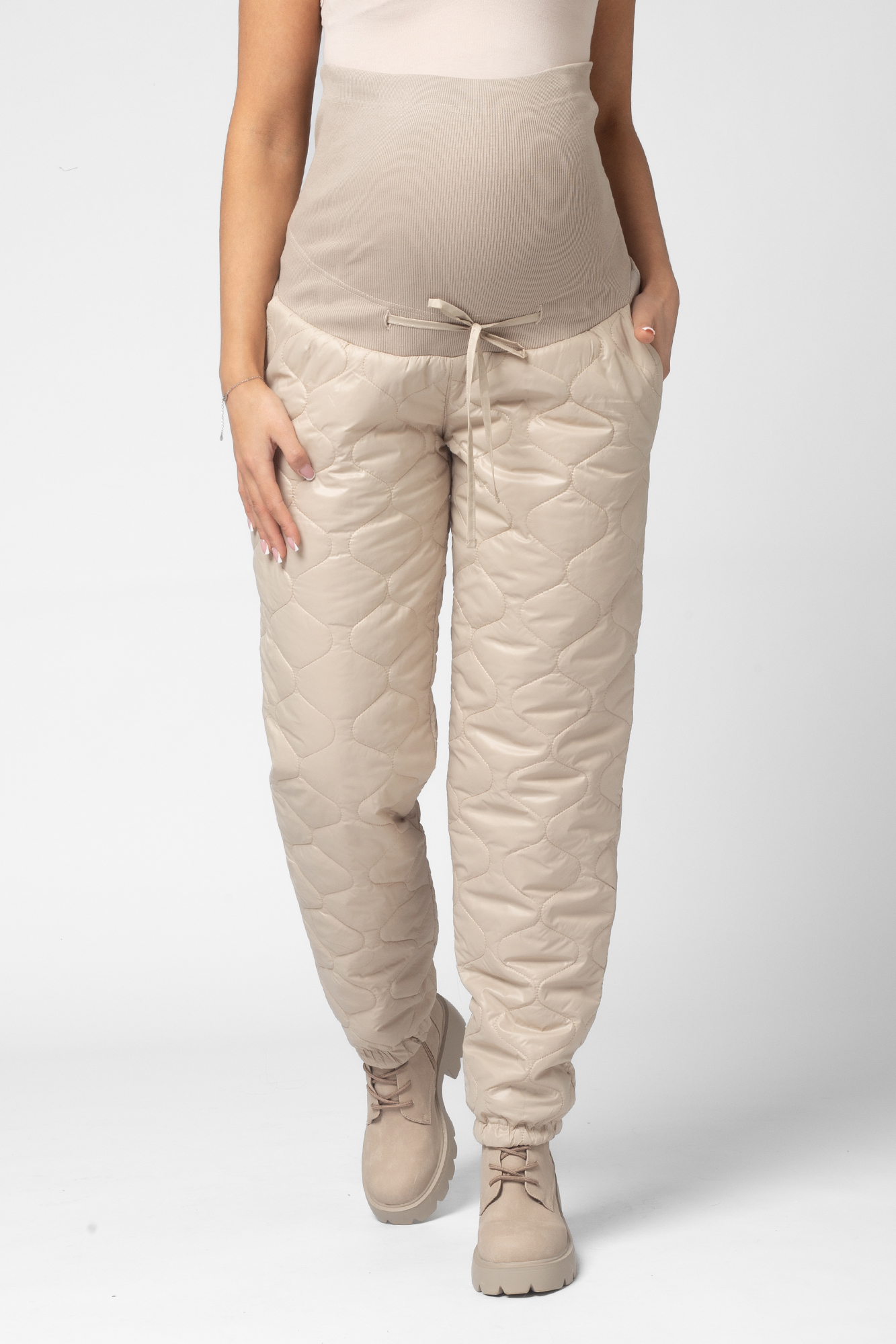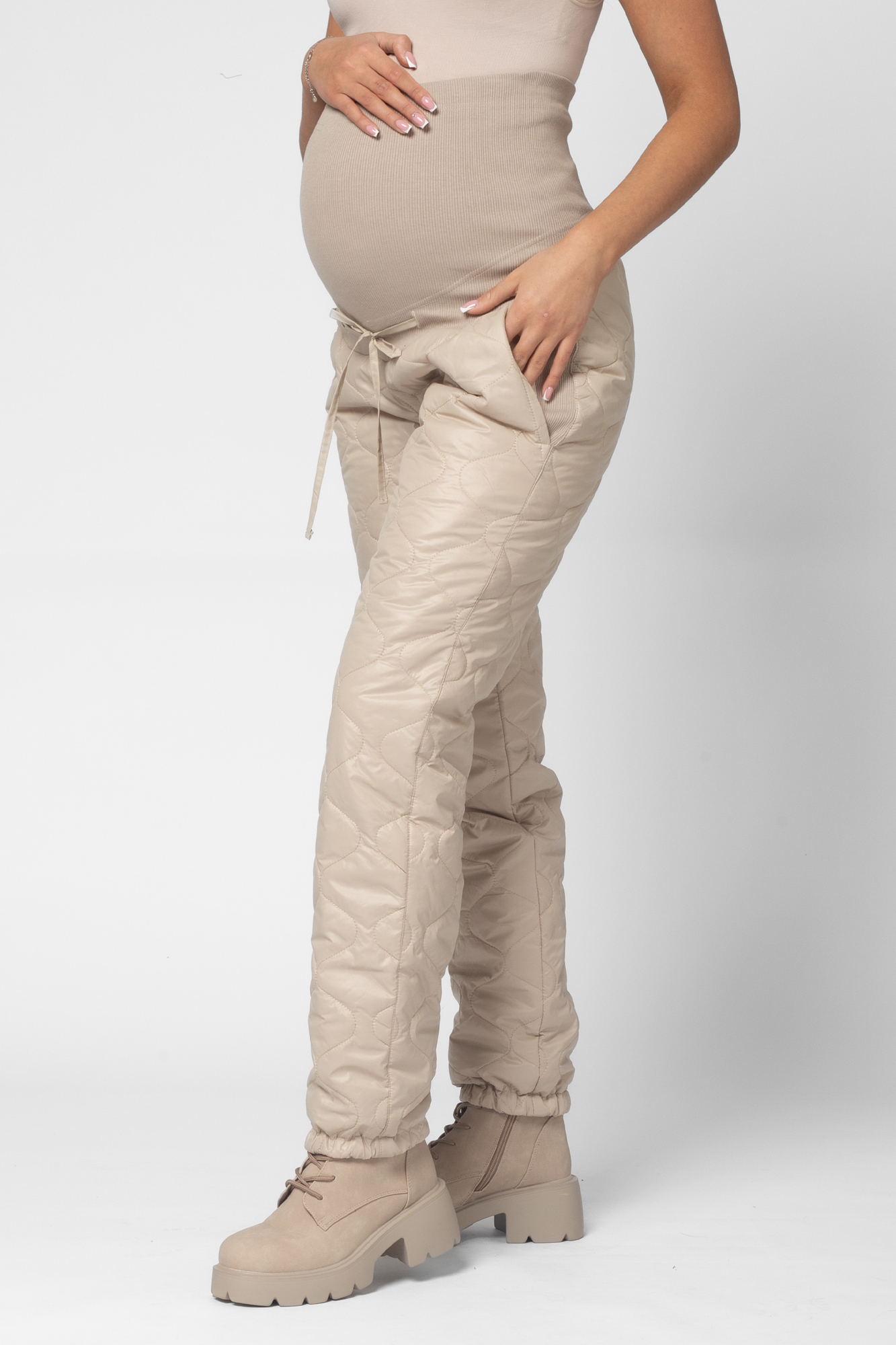 Теплые болоневые брюки для беременных пригодятся будущей маме на протяжении всего зимнего сезона. Для их пошива используется специальная курточная ткань на основе полиэстера. Материал обладает ветрозащитными свойствами, влагонепроницаемостью, легко очищается от грязи. В качестве утеплителя выбран легкий синтепон. Утепленные штаны с высокой посадкой дополнены эластичным цельновязанным поясом из плотного трикотажа. Эта деталь обеспечивает мягкую поддержку растущему животику, а скрытая регулировка объема позволяет носить брюки на любом месяце беременности и после родов. Фасон штанов джоггеры предусматривает наличие широких манжет на штанинах, которые создают дополнительную защиту от ветра и холода. Брюки подойдут для ежедневных прогулок, путешествий, занятий спортом.