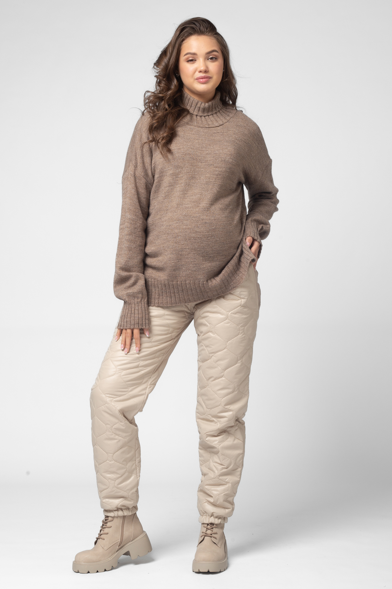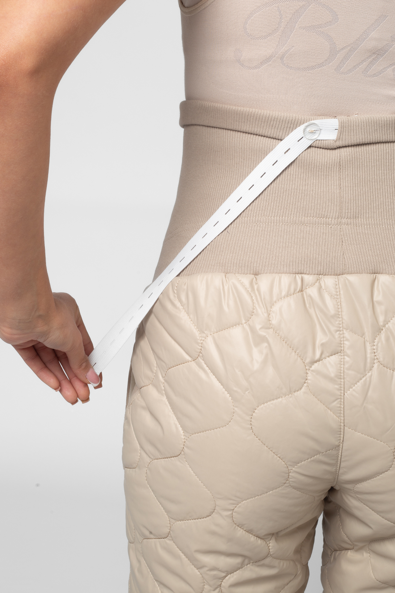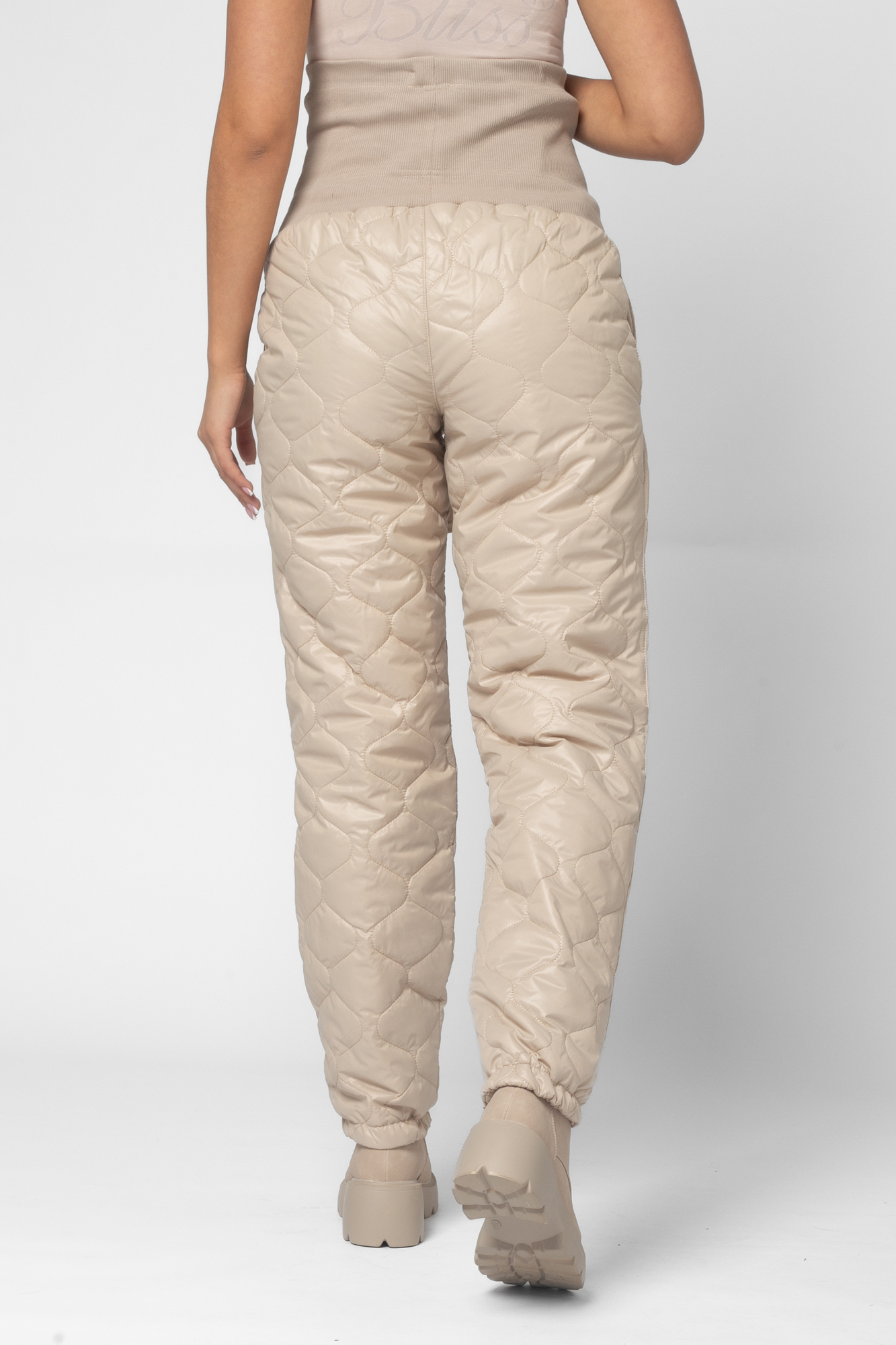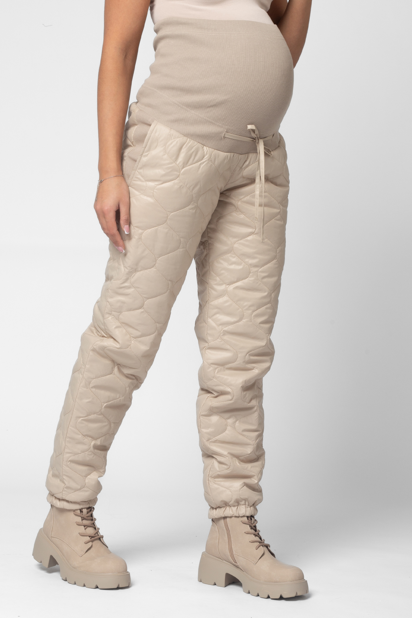 Теплые болоневые брюки для беременных пригодятся будущей маме на протяжении всего зимнего сезона. Для их пошива используется специальная курточная ткань на основе полиэстера. Материал обладает ветрозащитными свойствами, влагонепроницаемостью, легко очищается от грязи. В качестве утеплителя выбран легкий синтепон. Утепленные штаны с высокой посадкой дополнены эластичным цельновязанным поясом из плотного трикотажа. Эта деталь обеспечивает мягкую поддержку растущему животику, а скрытая регулировка объема позволяет носить брюки на любом месяце беременности и после родов. Фасон штанов джоггеры предусматривает наличие широких манжет на штанинах, которые создают дополнительную защиту от ветра и холода. Брюки подойдут для ежедневных прогулок, путешествий, занятий спортом.