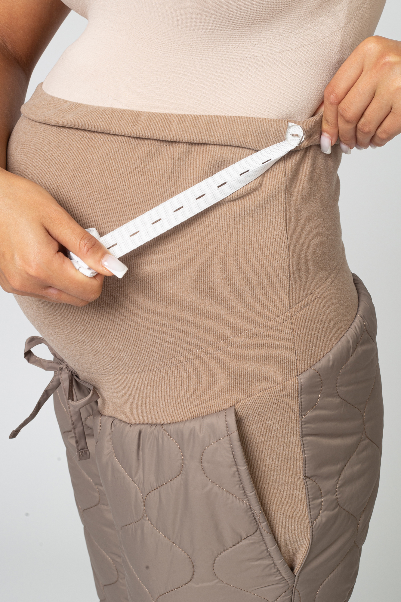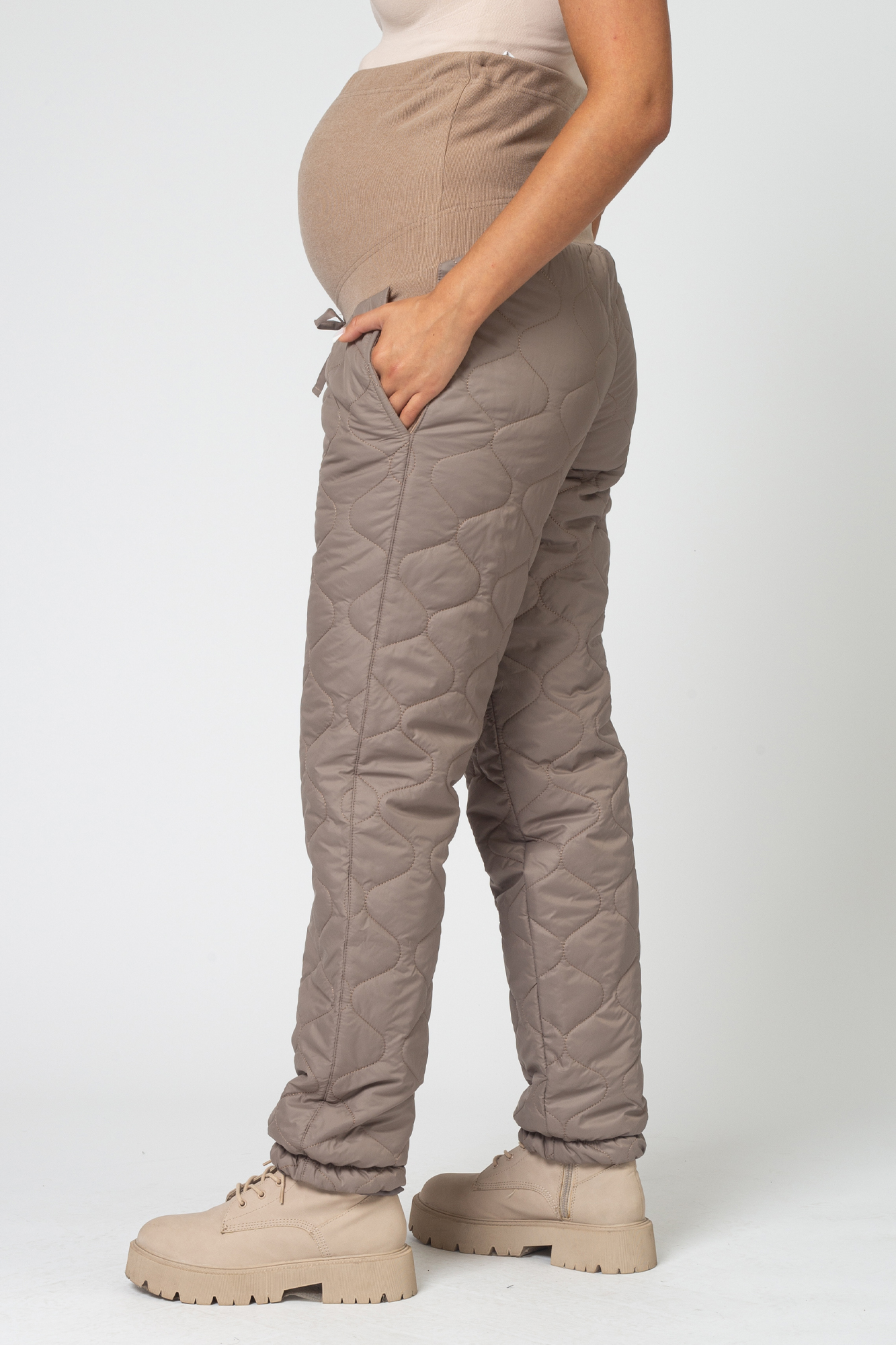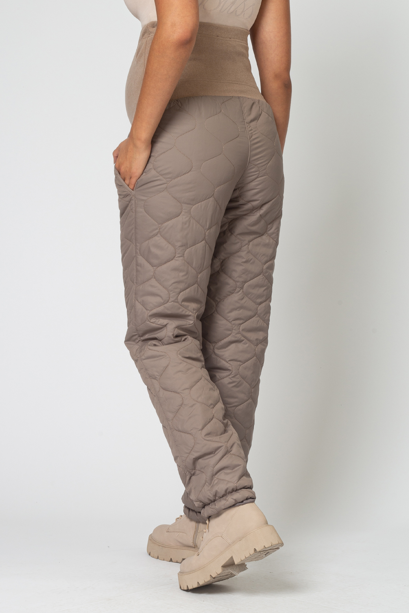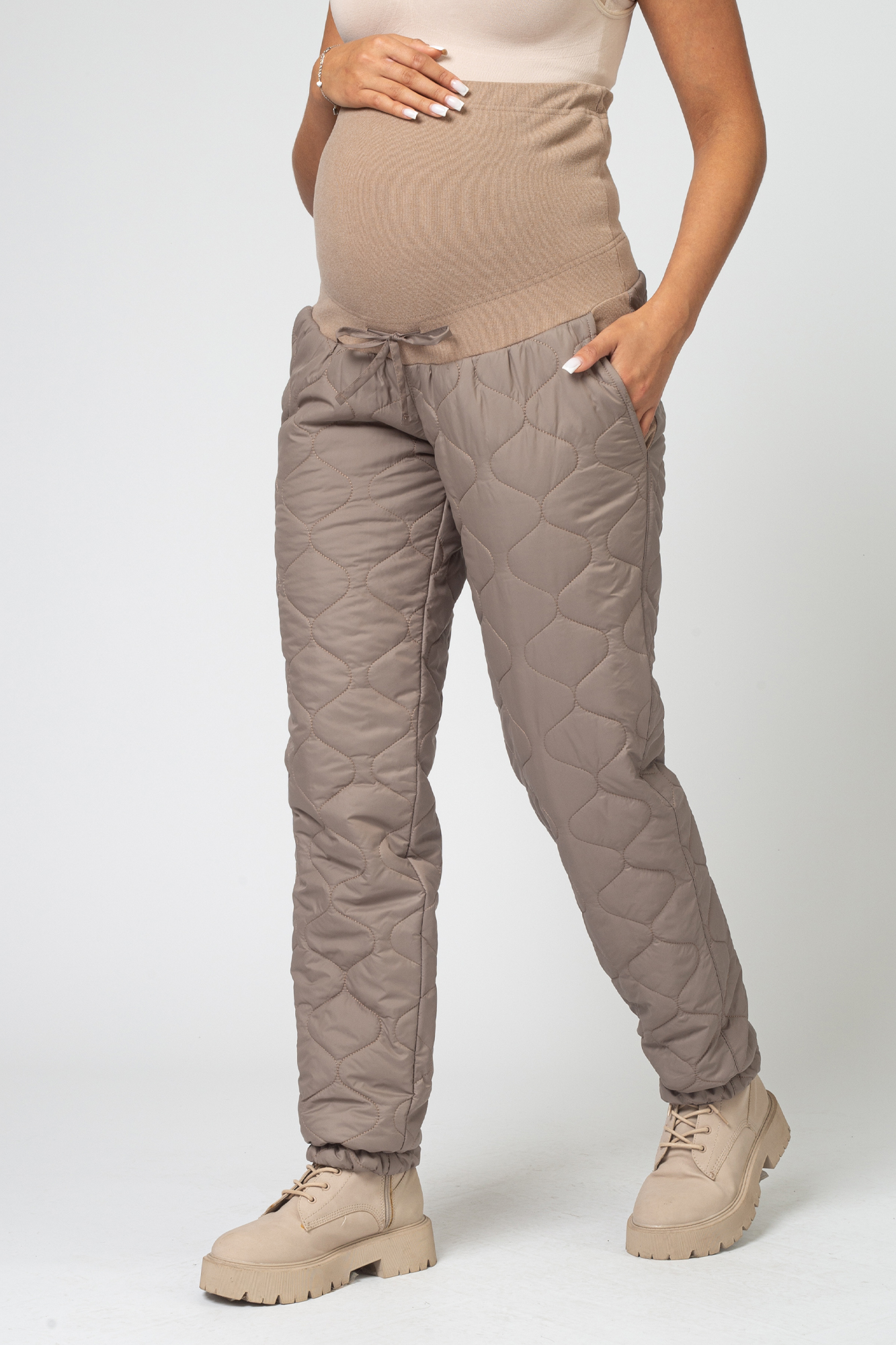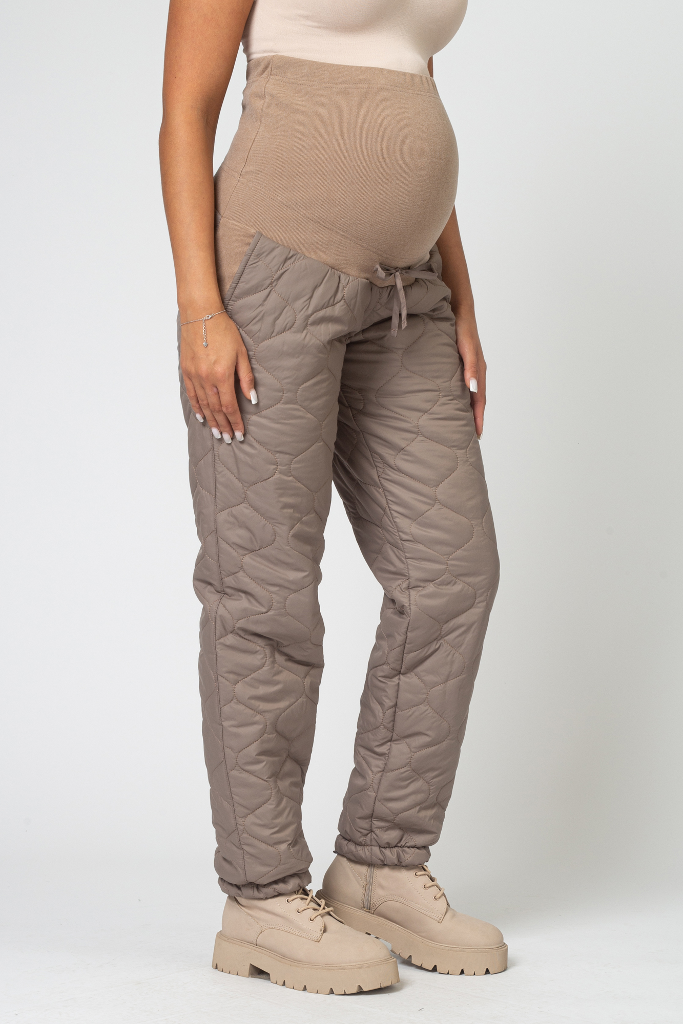 Теплые болоневые брюки для беременных пригодятся будущей маме на протяжении всего зимнего сезона. Для их пошива используется специальная курточная ткань на основе полиэстера. Материал обладает ветрозащитными свойствами, влагонепроницаемостью, легко очищается от грязи. В качестве утеплителя выбран легкий синтепон. Утепленные штаны с высокой посадкой дополнены эластичным цельновязанным поясом из плотного трикотажа. Эта деталь обеспечивает мягкую поддержку растущему животику, а скрытая регулировка объема позволяет носить брюки на любом месяце беременности и после родов. Фасон штанов джоггеры предусматривает наличие широких манжет на штанинах, которые создают дополнительную защиту от ветра и холода. Брюки подойдут для ежедневных прогулок, путешествий, занятий спортом.