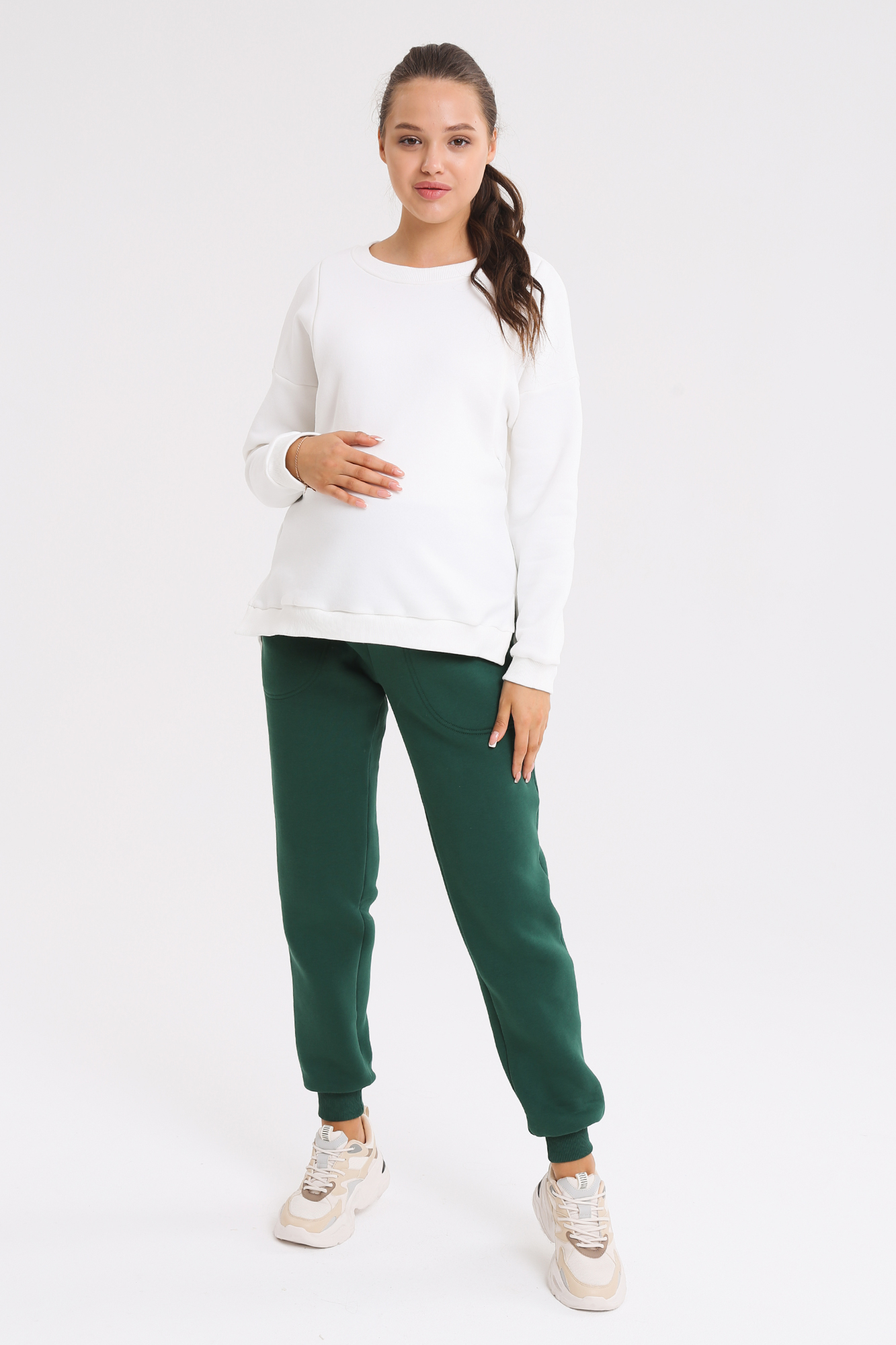 Стильные спортивные брюки-джоггеры из футера c начесом для беременных. Высокий эластичный бандаж мягко и деликатно поддерживает растущий животик. Объем регулируется шнурками в поясе и перфорированной резинкой, перестегивающейся на пуговицу, что позволяет носить брюки от начала до конца беременности и после родов. Невероятно комфортная модель для прогулок, занятий спортом и просто на каждый день.