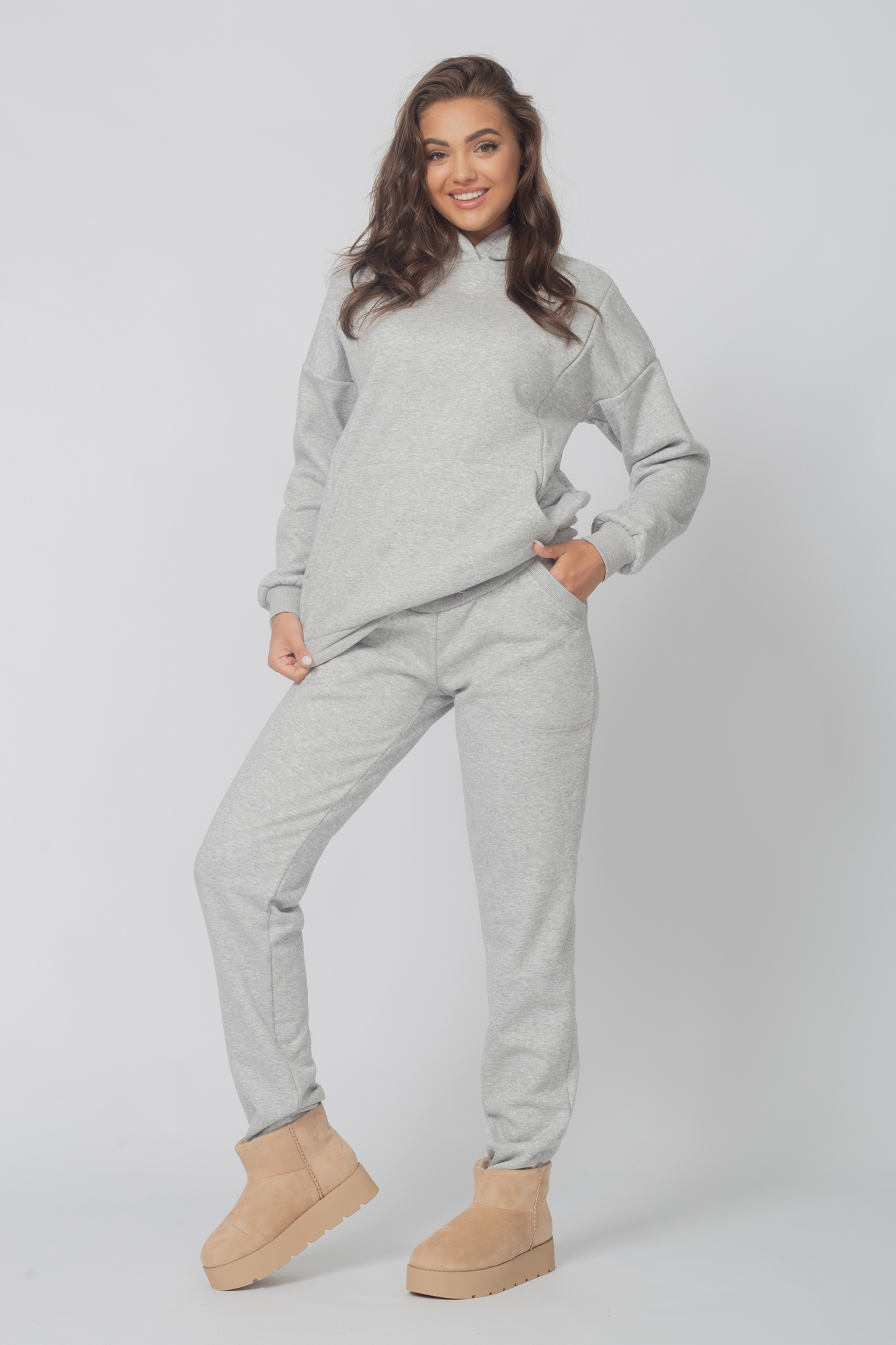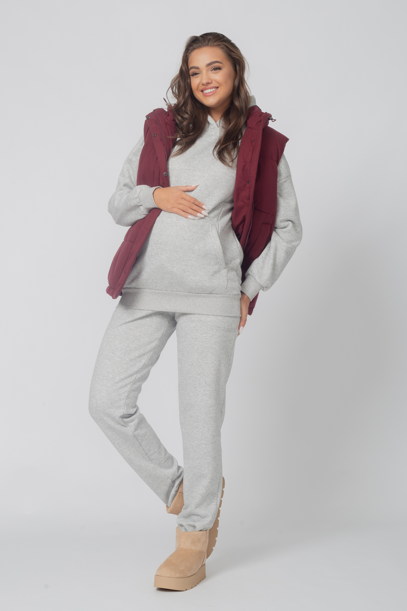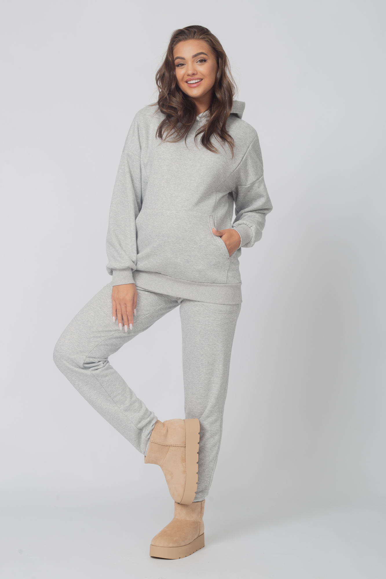 Теплый спортивный костюм для беременных и кормящих выполнен из премиального трехниточного футера "барашка". Ткань обладает высокой износостойкостью и не закатывается. В комплект входят худи и брюки. Толстовка свободного кроя, с большим капюшоном и длинными рукавами оснащена двум потайными молниями для обеспечения комфортного кормления в общественных местах. Стильные брюки джоггеры с удобными карманами по бокам и высоким эластичным бандажом. На брюках предусмотрена утягивающая резинка, фиксирующаяся на пуговицу, для регулировки объема изделия. Высокая трикотажная вставка обеспечивает мягкую поддержку животика, позволяет носить костюм на протяжении всей беременности и после родов. Утепленный костюм для будущих и кормящих мам подойдет для прогулок и поездок, отдыха, занятий спортом, посещения консультации, а также для домашнего ношения. Особый крой с учетом анатомических особенностей позволяет носить однотонный зимний костюм на любом сроке беременности, а так же станет удобным комплектом для полных девушек и женщин.